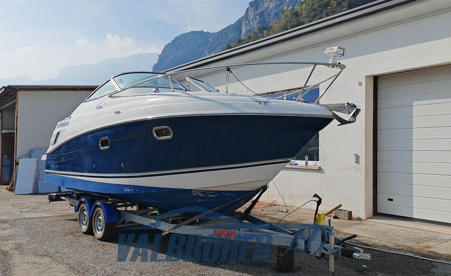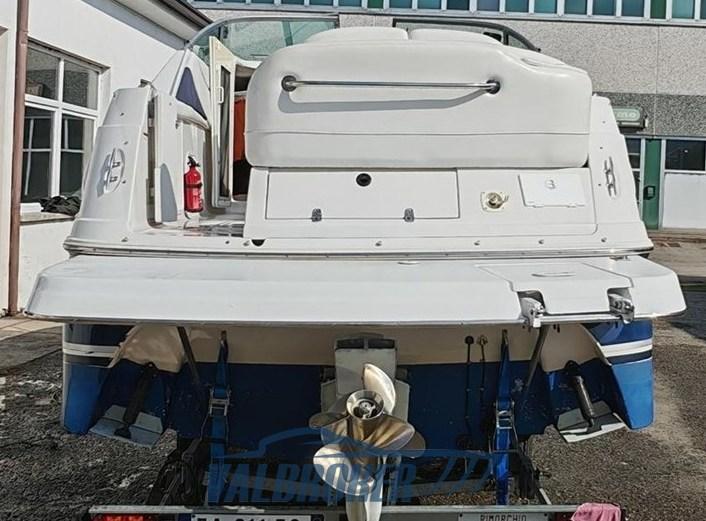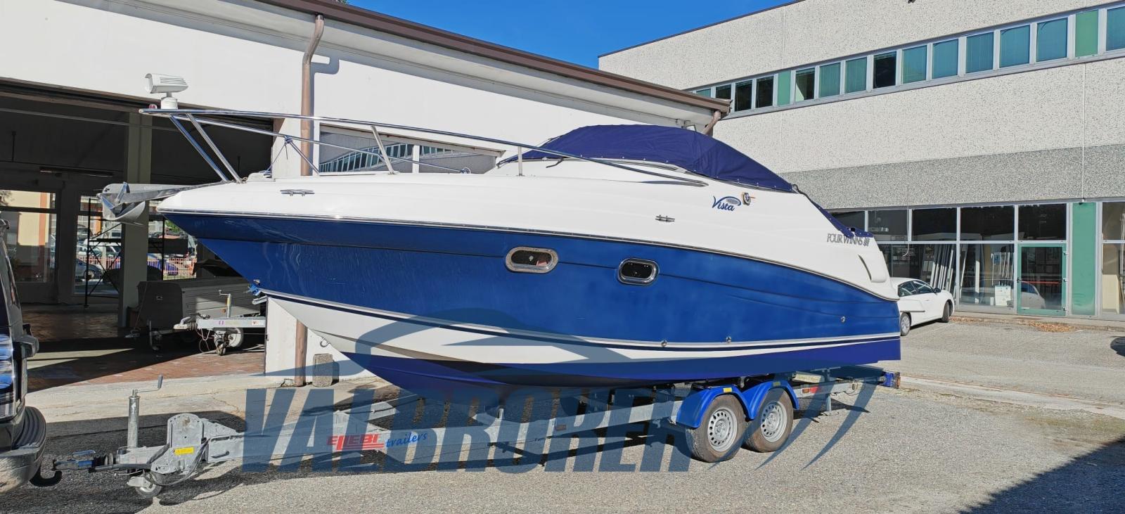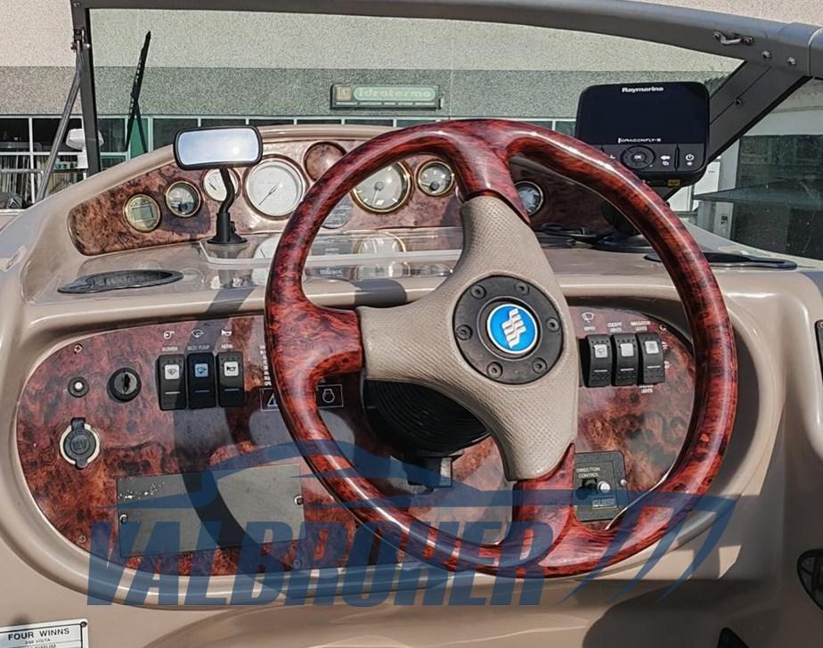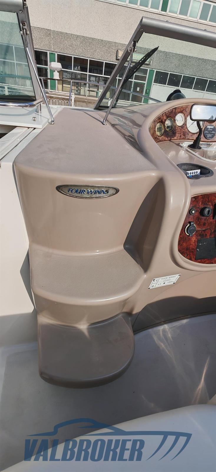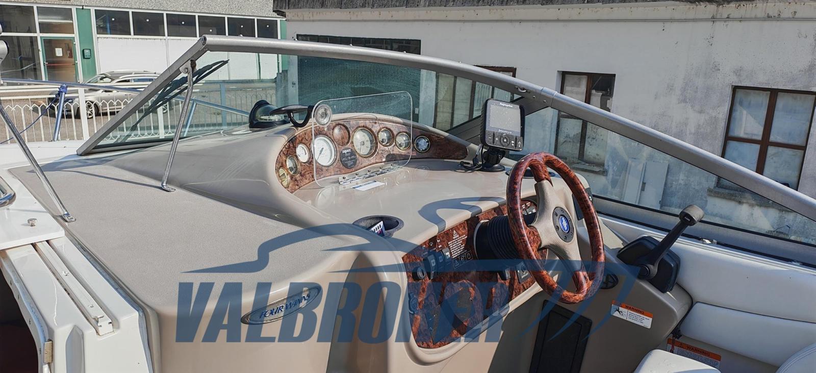 Cabin cruiser from the renowned American shipyard Four Winns. Used only on lakes. 1 x 280 HP Volvo Penta 5GXi V8. Cockpit with dinette and dining table. Large swim platform. Open-plan cabin with dinette convertible into a double bed in the bow and a double bed in the stern. Separate bathroom with toilet, stainless steel sink, and shower. Perfectly maintained. Ready to sail. April 2025: hull stripped to bare metal, old layers of antifouling removed with sandblasting, preventive acqua-stop treatment, epoxy primer, 2 coats of antifouling, new magnesium anodes, and full engine service. Viewable at Valbroker.