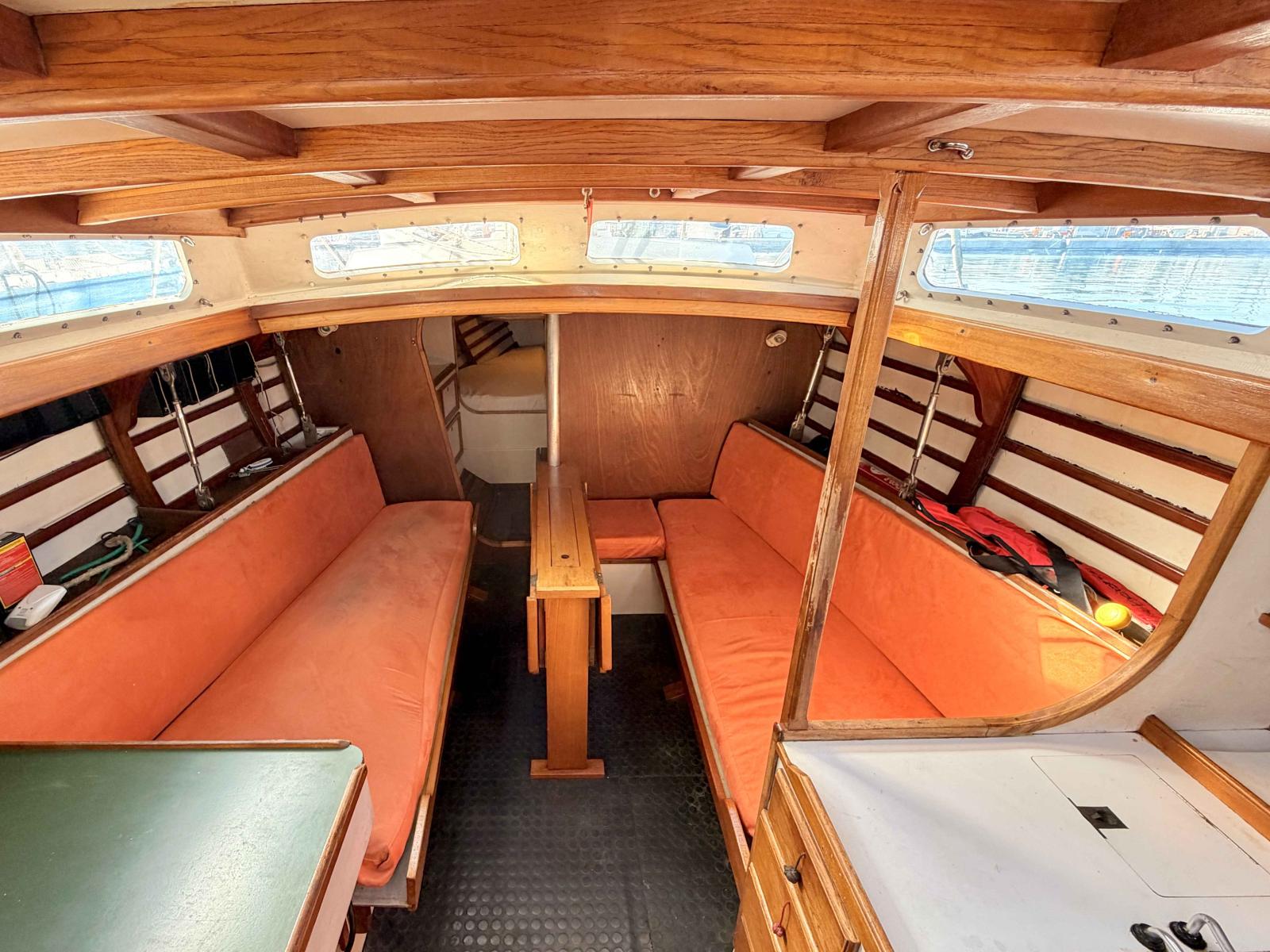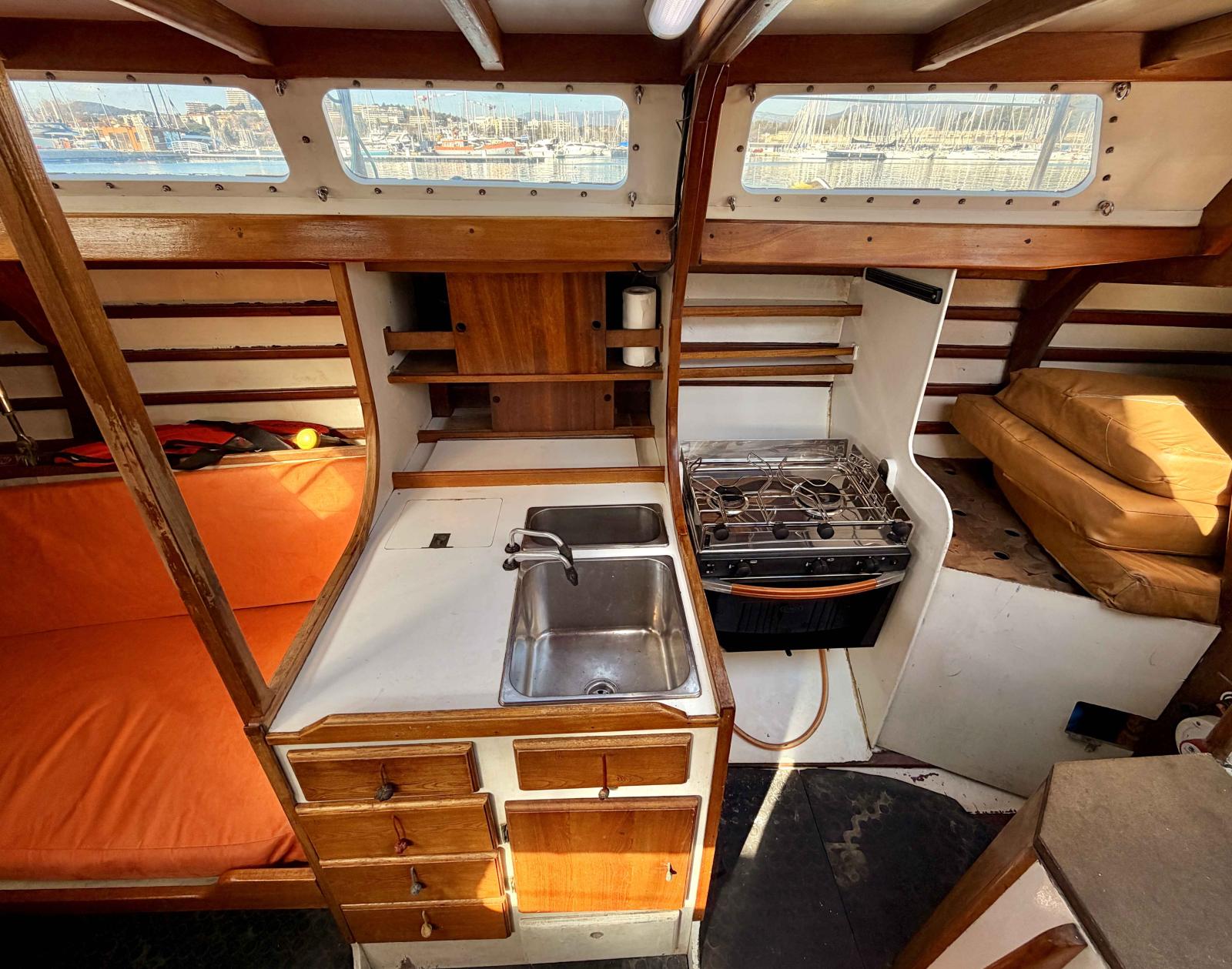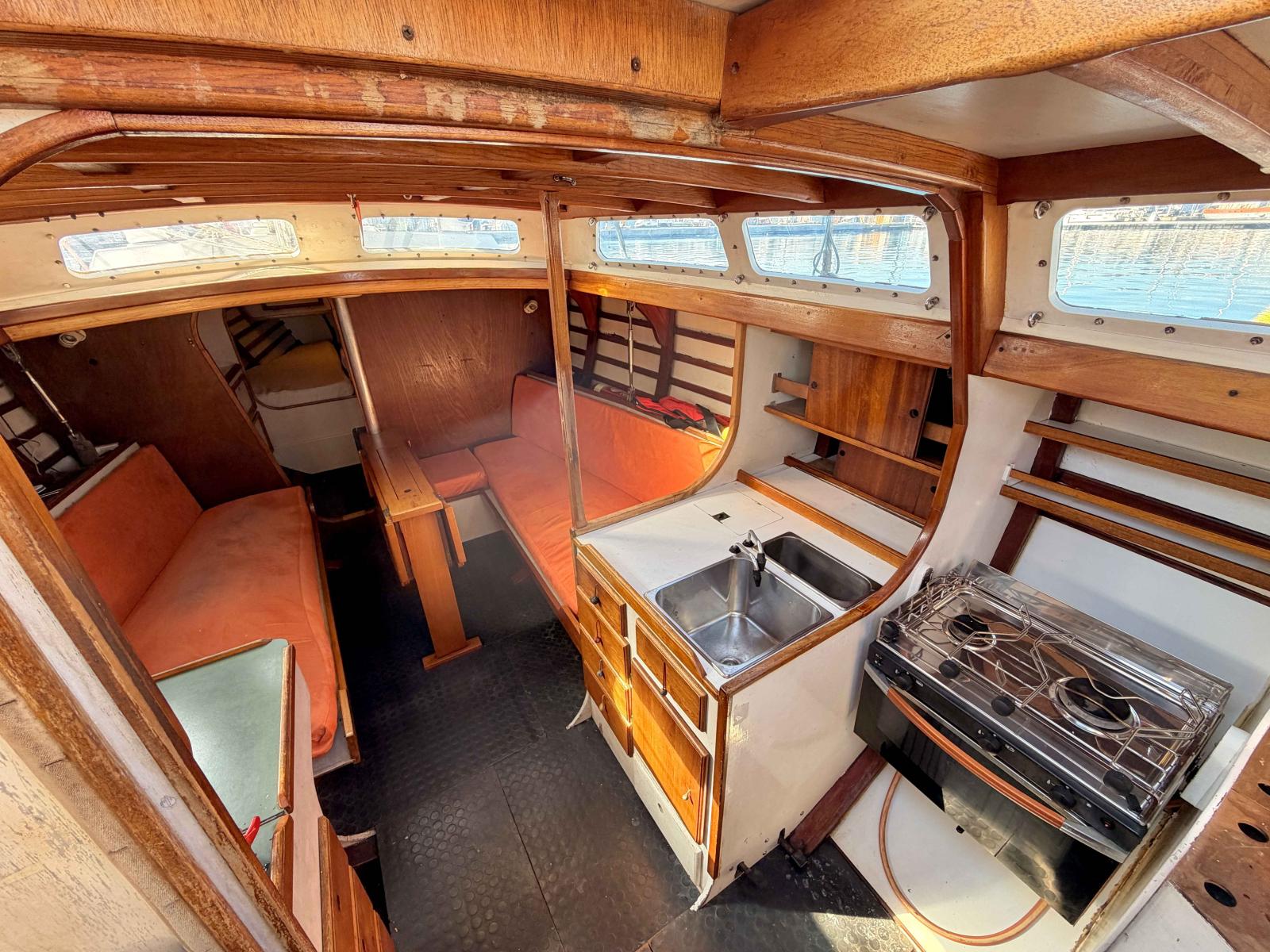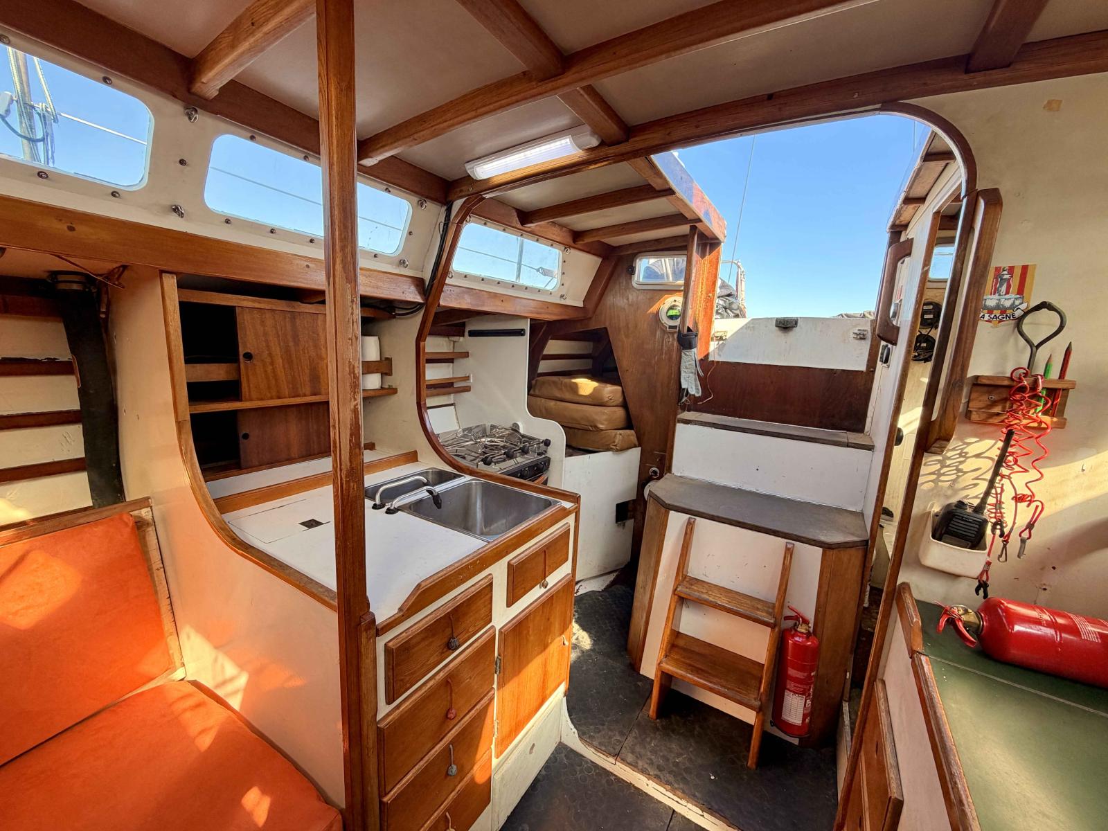 Inside, the layout remains simple yet warm, with exposed woodwork recalling the authenticity of traditional sailing yachts. The intimate cockpit allows the skipper to remain close to the sea and fully connected to the sailing experience.