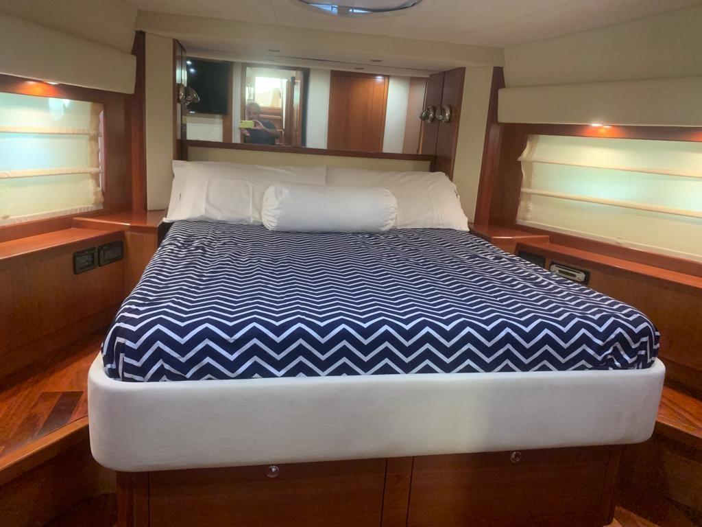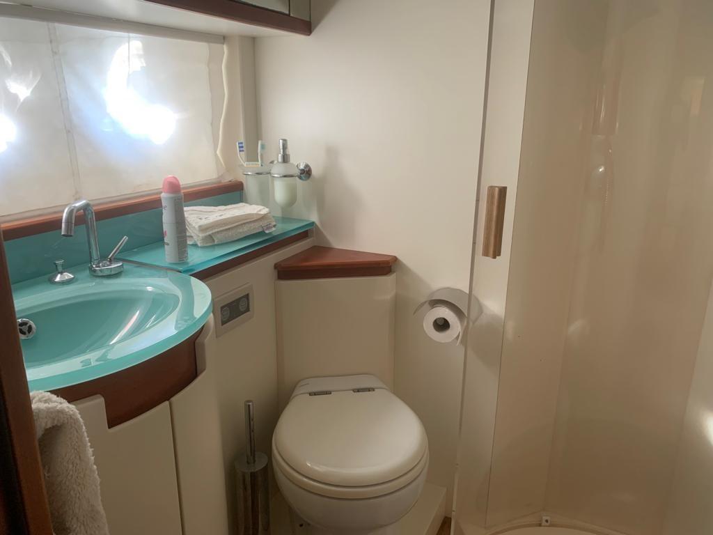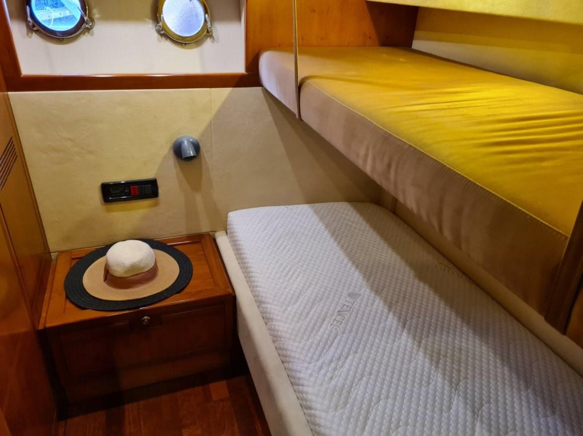 1 double owner's cabin forward with bathroom and separate shower cubicle - 2 guest cabins with single beds on the floor, with bathroom and separate shower cubicle - crew cabin aft with bunk bed and separate bathroom.