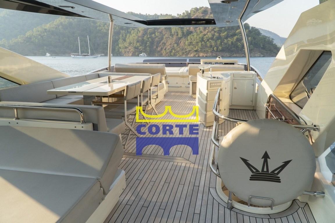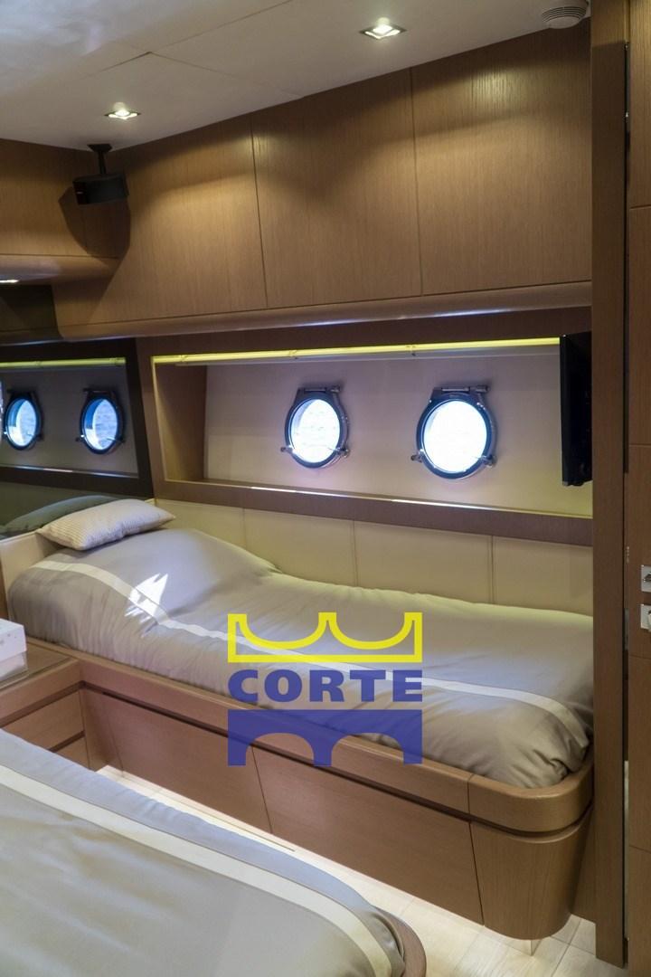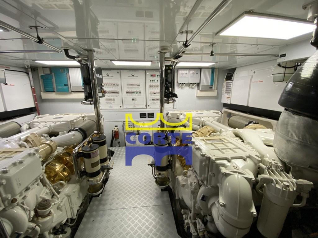 Engine Alarm, Bilge Alarm, Anchor (Delta Lewmar con catena da 14 130 metri), Water pressure pump, Battery charger (Mastervolt), Deck Shower, Twin Steering, Stern Thruster (Bcs idraulica), Bow Thruster (Bcs idraulica), Hard top (carbonio), Fire Extinguishing System, Courtesy Lights, 11 Underwater lights (bianche e blu), Gangway (Opacmare), Platform (di poppa tender lift Opacmare), Automatic Bilge Pump, Entry door, Teak Cockpit, Shorepower connector, Water harbor connector system, Electronic instrumentation repeater, Electric Windlass, swimming ladder, Stabilizers (2 stabilizzatori Seakeeper Giro 9 e 4 interceptor Humphree), cockpit table (con vano porta bottiglie), Tender (William 385 turbojet full optional), Horn, Stern Winches, Bow Winches.