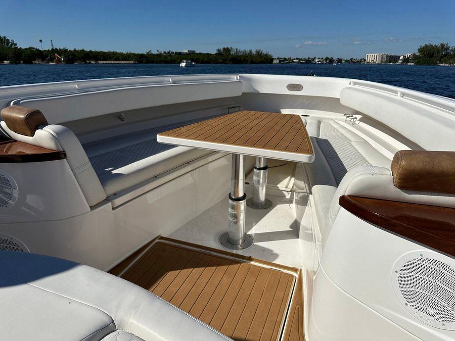 Under the console is a surprisingly spacious cabin with air-conditioning, refrigerator, microwave, separate head with shower and a queen size berth. Luxurious soft touch upholstery on all surfaces throughout. Providing the perfect retreat in air-conditioned comfort on hot days and is well-suited for longer trips with overnight stays. Dream design for island hopping and crossovers with family and friends to the Bahamas!