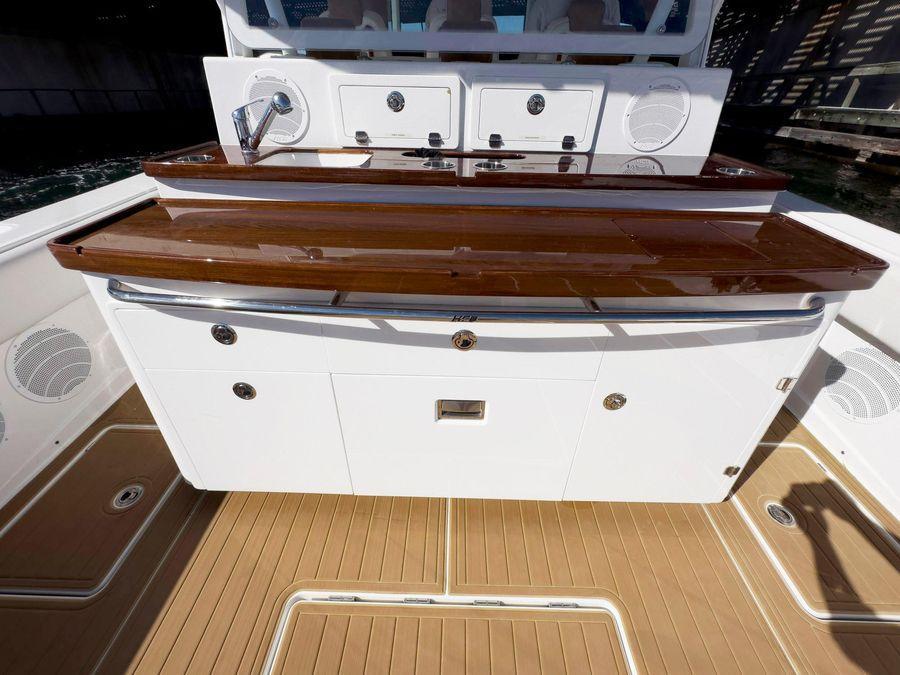 - Built-in tackle compartment: Sliding drawers and lockers incorporated into the helm bench seat, with refrigerator on centerline and ice maker starboard