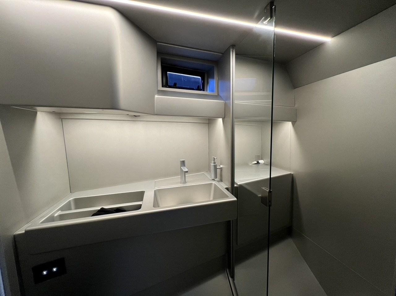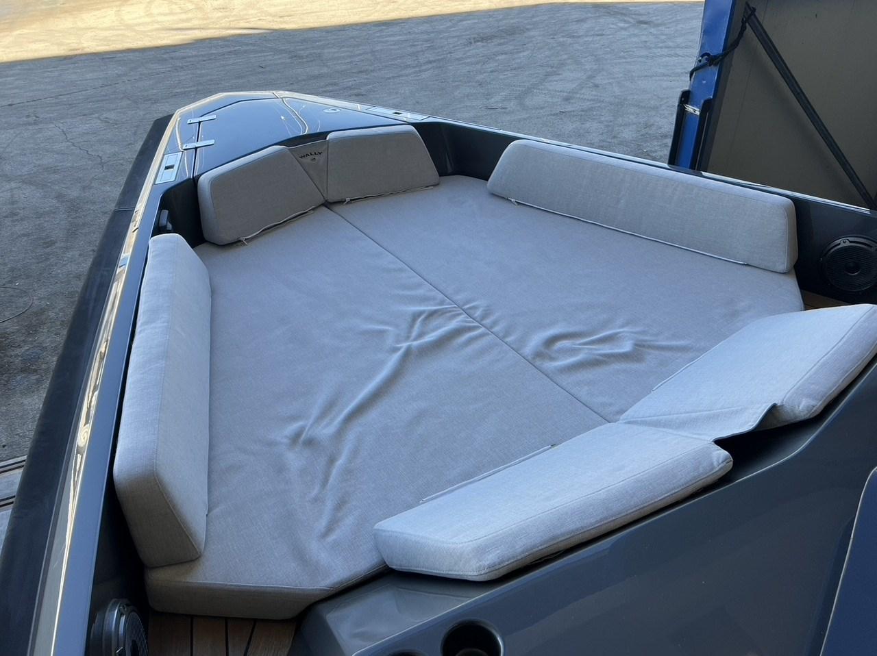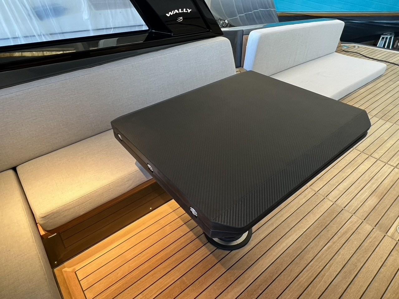 Engine Alarm (COMPUTER VOLVO), Bilge Alarm, Electric Engine Compartment Opening, Auto Dynamic Trim Interceptor, Water pressure pump, Life Raft (12 PERSONE - SENZA LIMITI), Auto-Trim (INTERFACCIA VOLVO), Folding cleats, Teak Side Decks, Special Colour (VULCANIC GRAY METALLIZZATO), 2 Deck Shower (PALO A POPPA AMOVIBILE), Directional Spotlight, Hydraulic Flaps (INTRUDER AUTOMATICI), Hard top (IN CARBONIO), Fire Extinguishing System (AUTOMATICO CON ALLARME), Flaps Indicators (DIGITALE SU SCHERMO TOUCH), Washbasin in the cockpit, Courtesy Lights, 2 Underwater lights (BIANCHE A POPPA), Gangway (IDRAULICA A SCOMPARSA), Automatic Bilge Pump, Teak Cockpit, Shorepower connector, Electronic instrumentation repeater, Electric Windlass, swimming ladder (IDRAULICA CON PASSAMANO), Stabilizers (SEAKEEPER GIROSCOPICO), cockpit table (CARBONIO ESTENSIBILE).