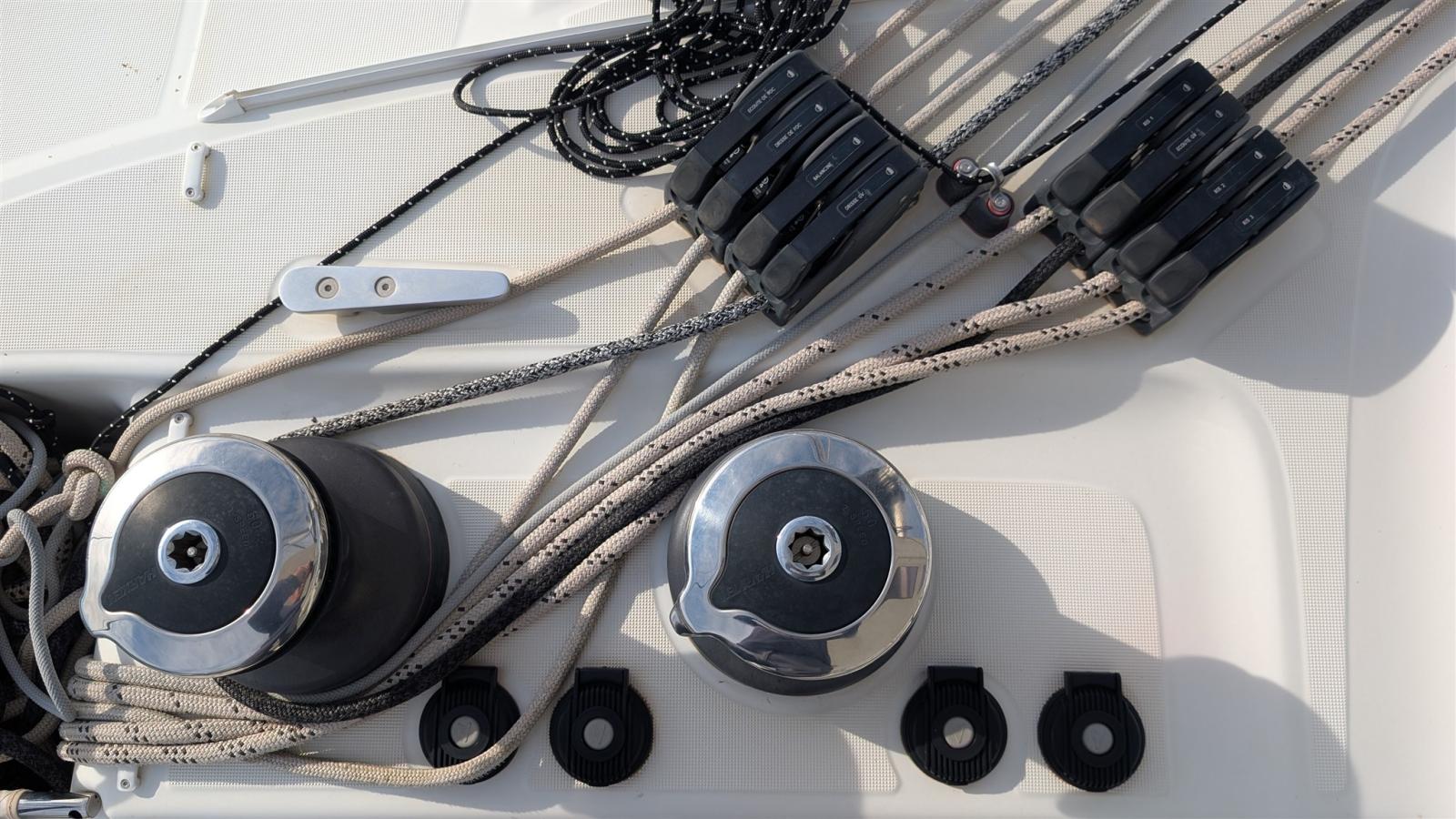 Engine Alarm, Bilge Alarm, Alternator, 3 Selftailing winch, Water pressure pump, Life Raft (10 personnes), 6 Batteries (6 X 140 Amps), Battery charger (Dolphin 60A), Shore power cable (32 Amps), Guard rail, 2 Deck Shower, Washbasin in the cockpit, Courtesy Lights, Battery Monitor, Outboard engine for tender (Suzuki 20CV), 8 Fenders, Gangway (Carbone), Platform (hydraulique), Seawater Pump, Water harbor connector system, Electric Windlass (Quick), Strand rigging, 2 swimming ladder, cockpit table (Bois massif), Living Room Foldable Table (convertible en lit), Tender (Highfield 340), 3 Winch Electric.