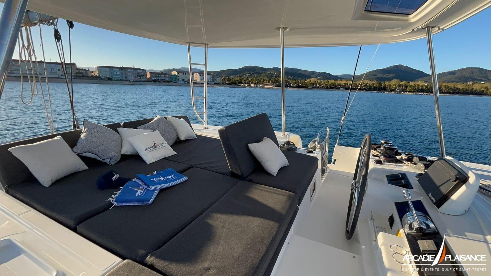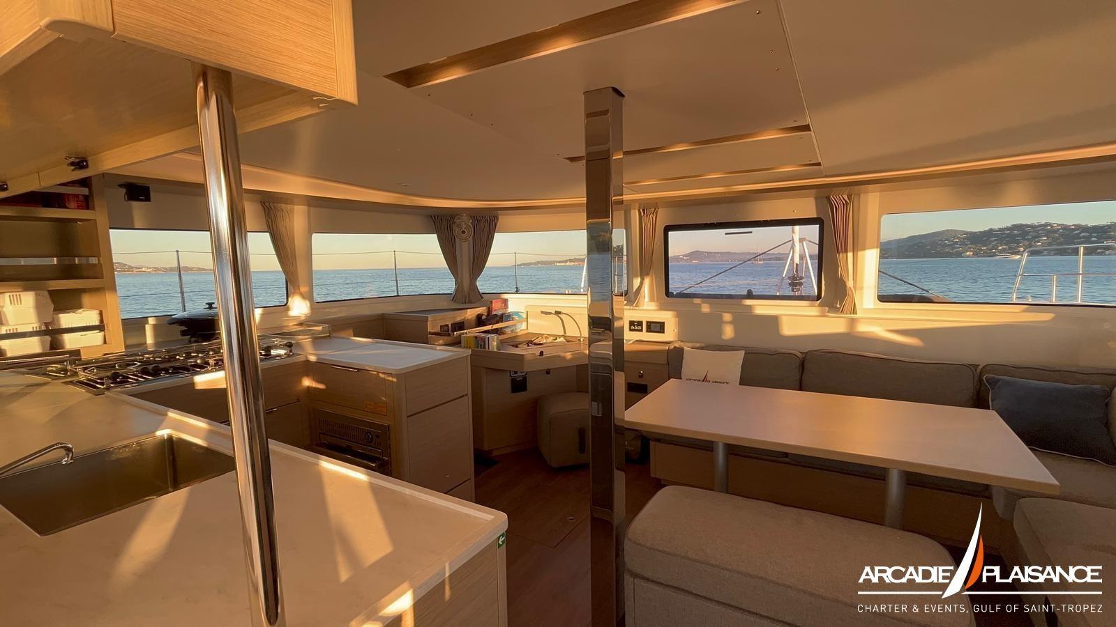 This catamaran offers generous volumes and fluid circulation between the cockpit, the illuminated saloon and the panoramic flybridge.
