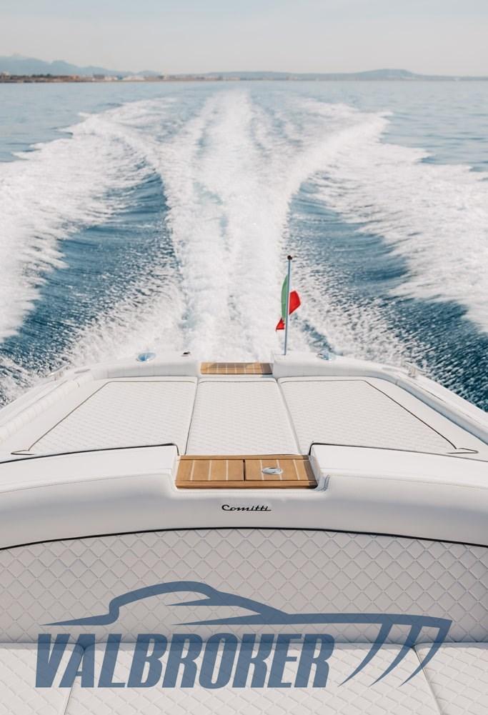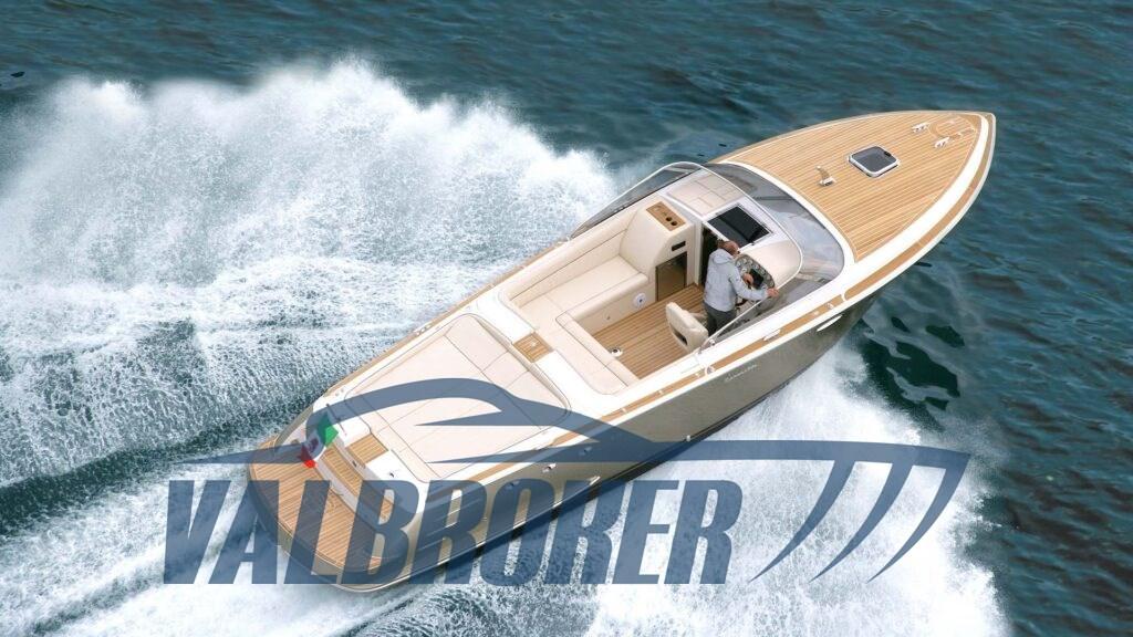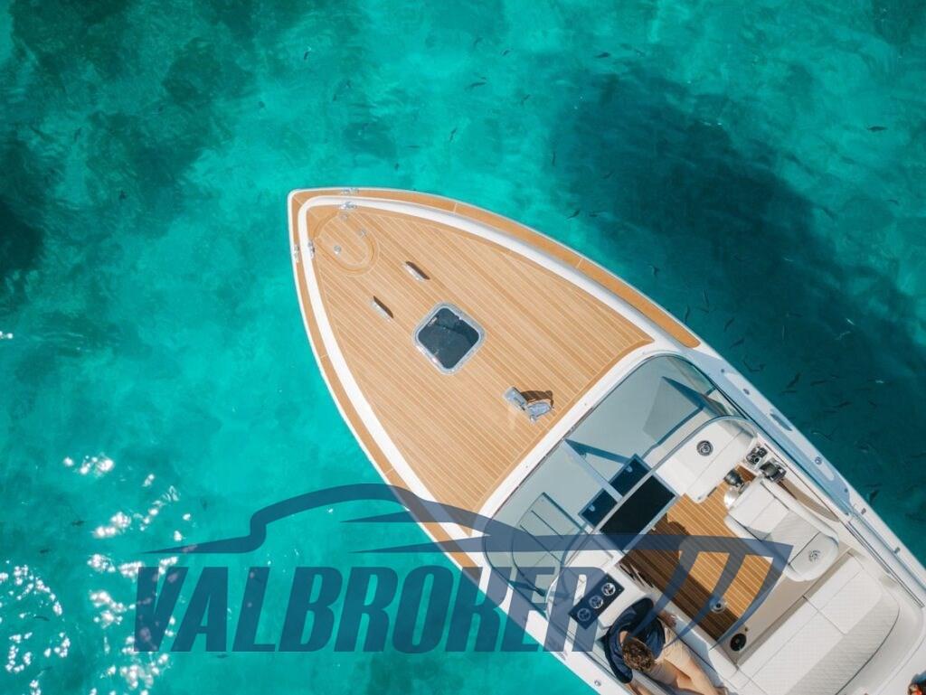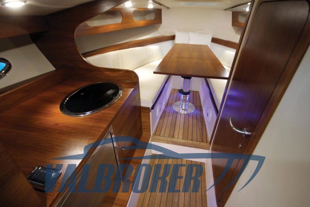 DEMO BOAT. 2x 350HP Mercruiser engines with only 30 hours of operation. Careful checks. Large cockpit with swivel driver's seat, "L" shaped sofa, large sundeck aft. Below deck we find a double bed and a bathroom.