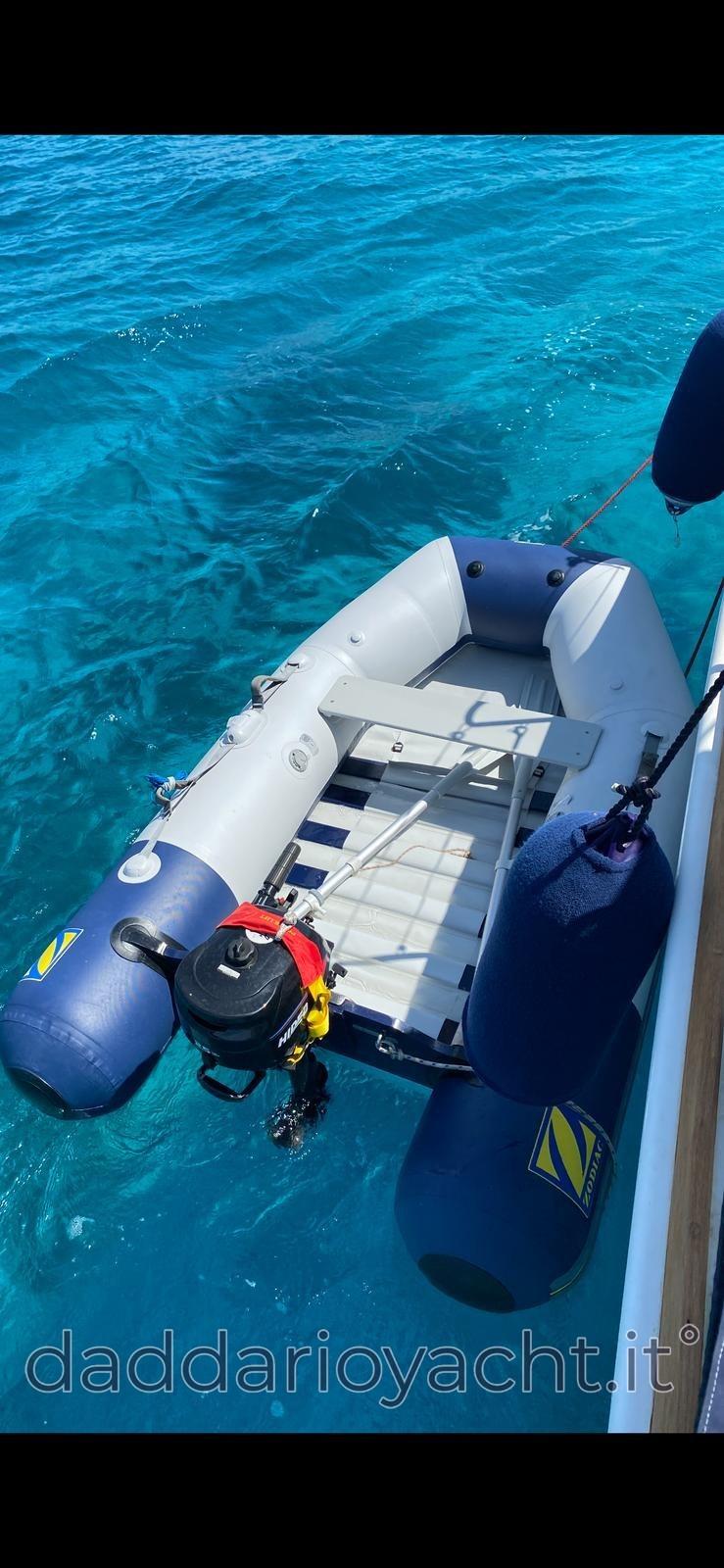 Water pressure pump, Deck Shower, Solar panels, Platform, Manual Bilge Pump, Entry door, Teak Cockpit, Shorepower connector, Strand rigging, swimming ladder, Tender (2.40).