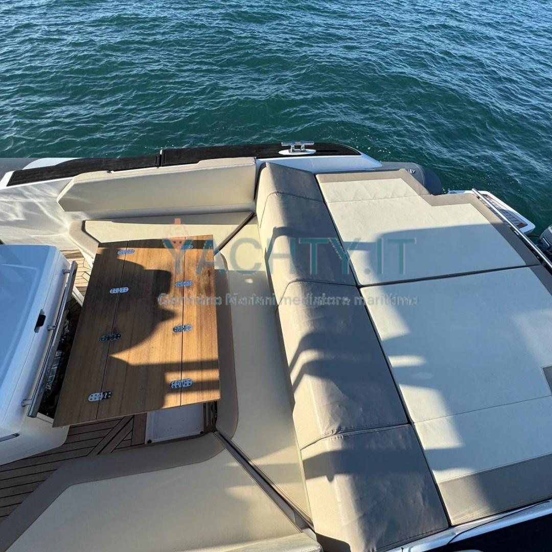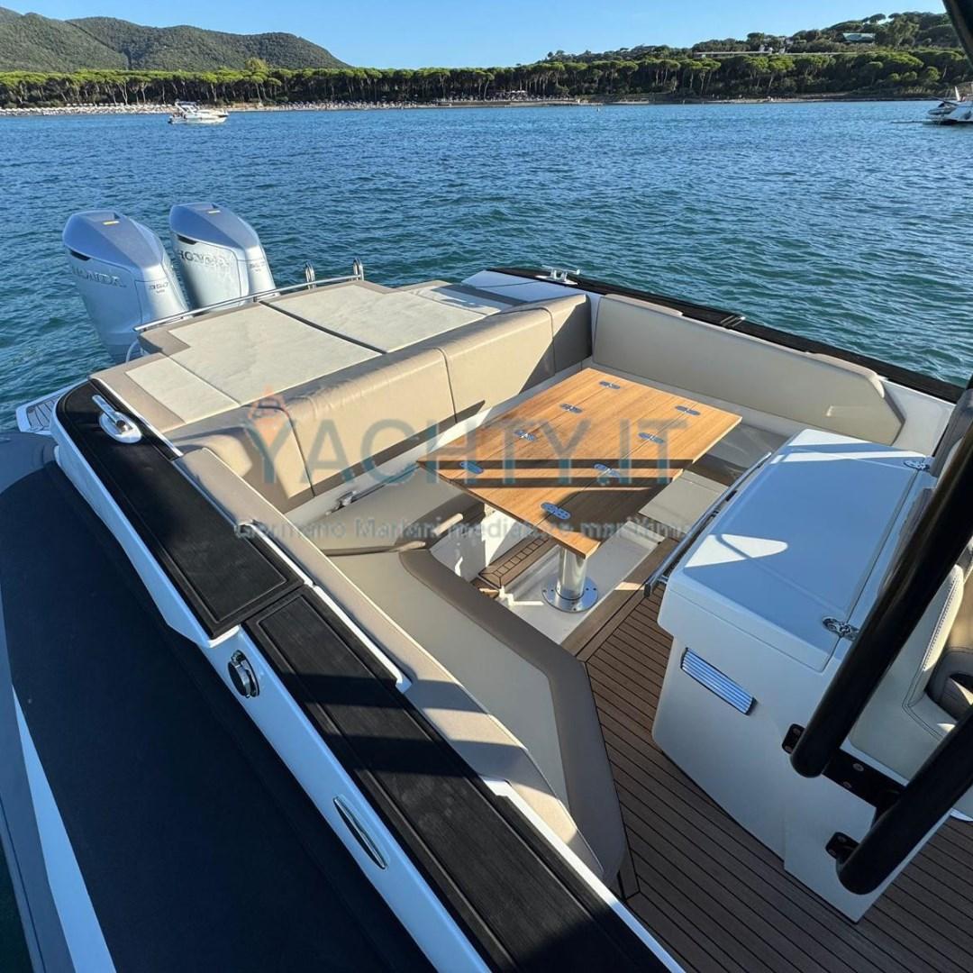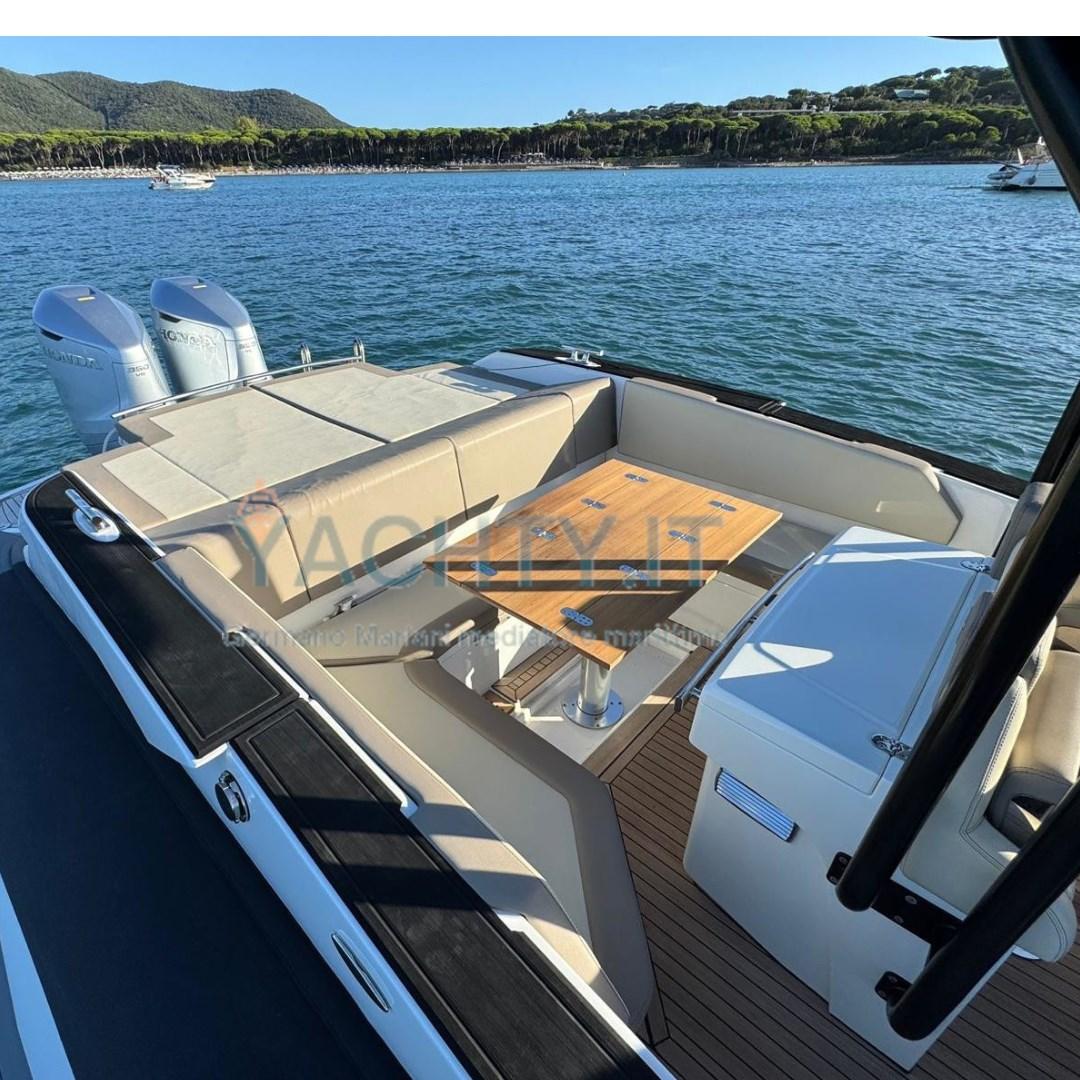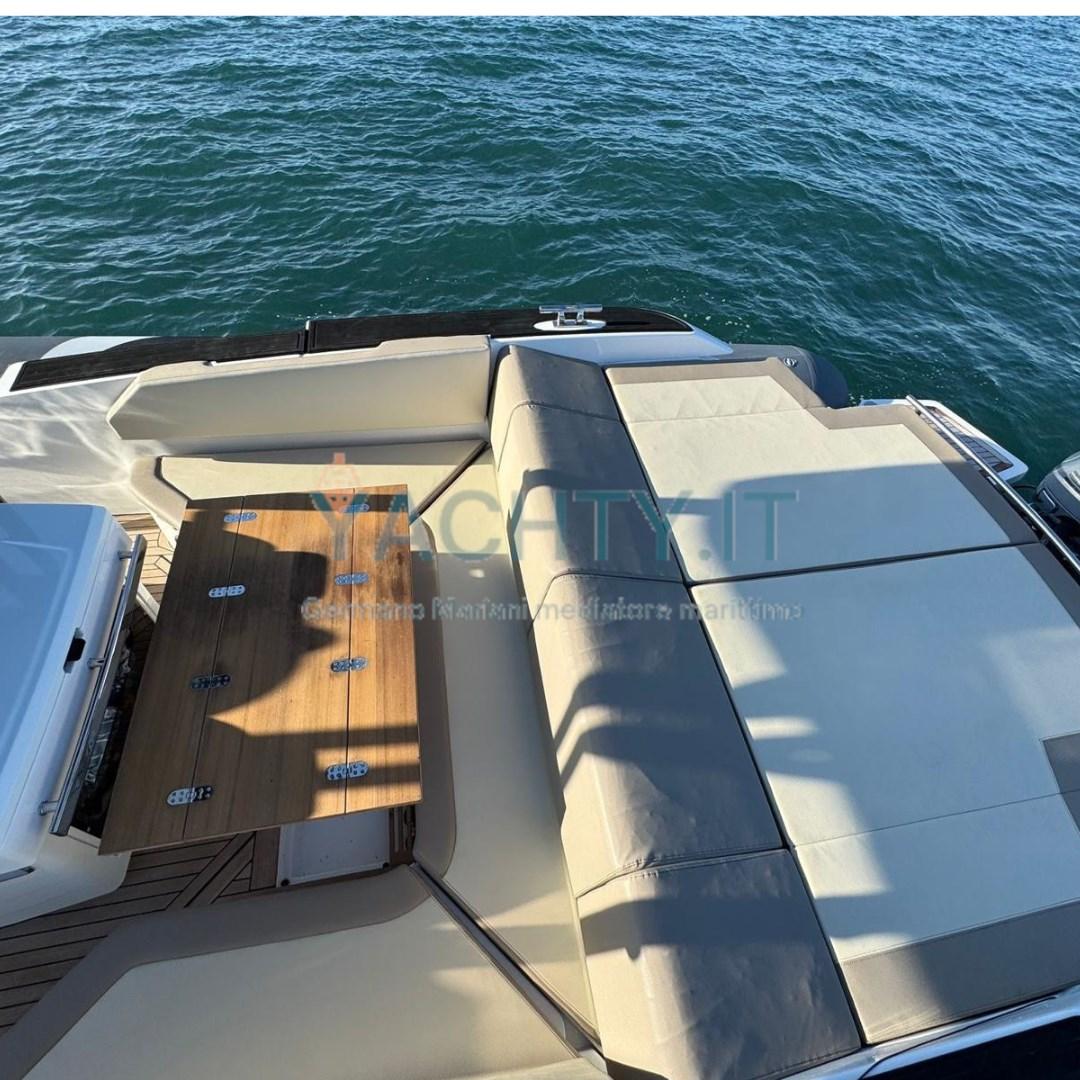 The set-up enhances the experience on board with T-Top equipped with panoramic glass, electric power steering and electronic throttles, while the teak in the cockpit contributes to creating an elegant and welcoming environment. The presence of the additional cabin in the aft hatch further expands livability, making the boat ideal even for weekends and extended stays.