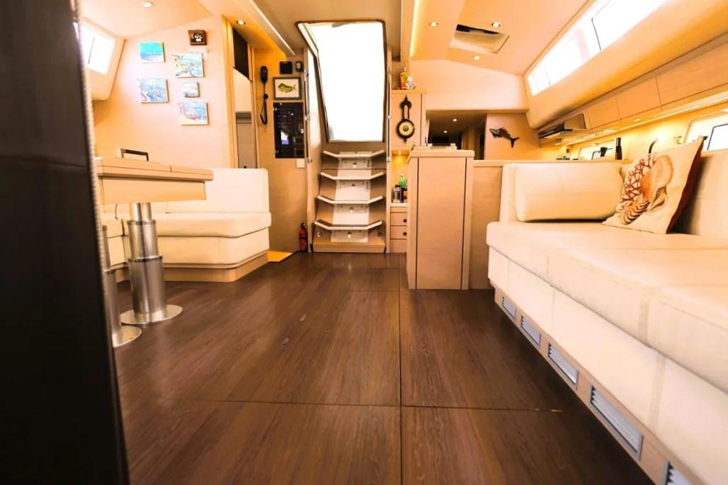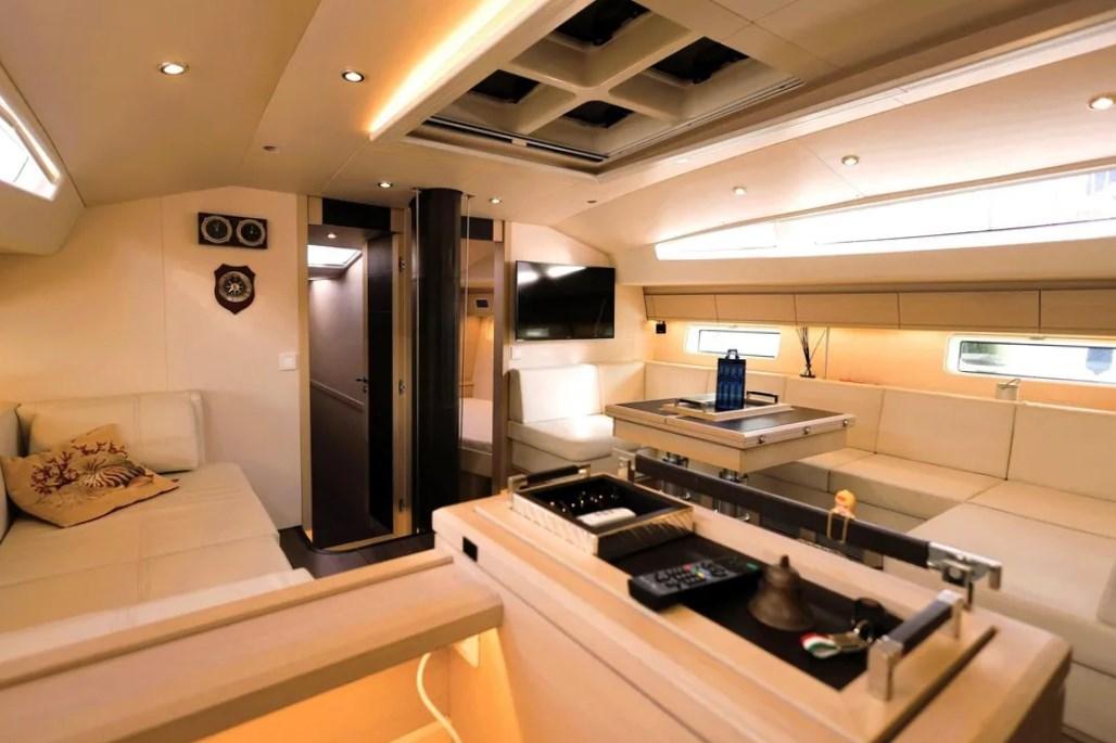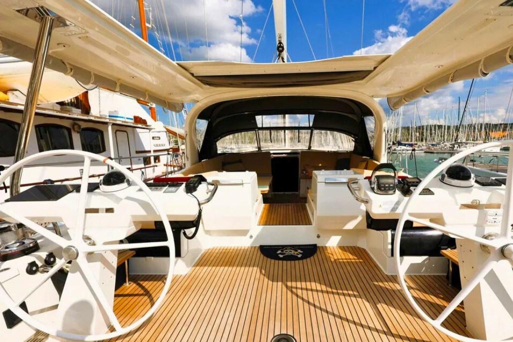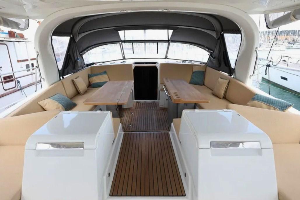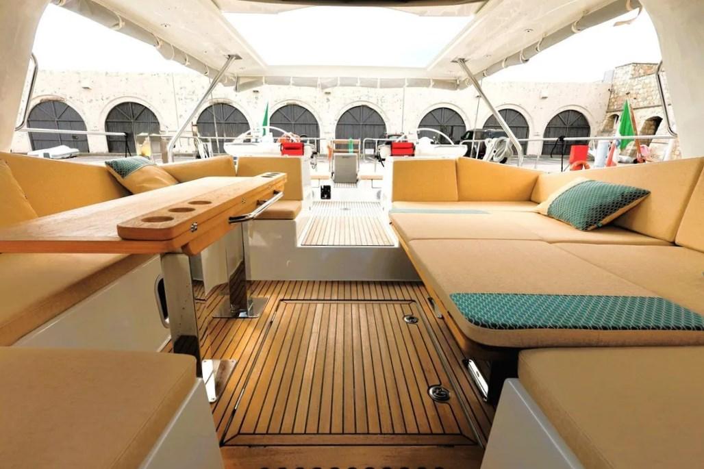 The exterior design maximizes outdoor living spaces with a large cockpit, generous bimini, bathing platform and tender garage. Deck layout with centralized sail handling and electric winches allows easy management even with a small crew.