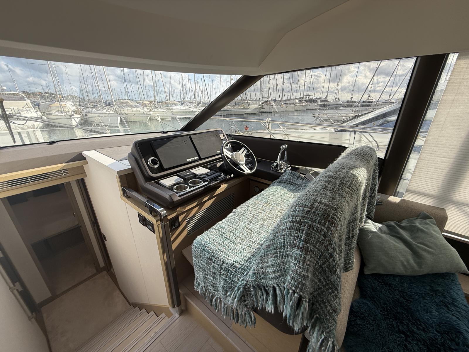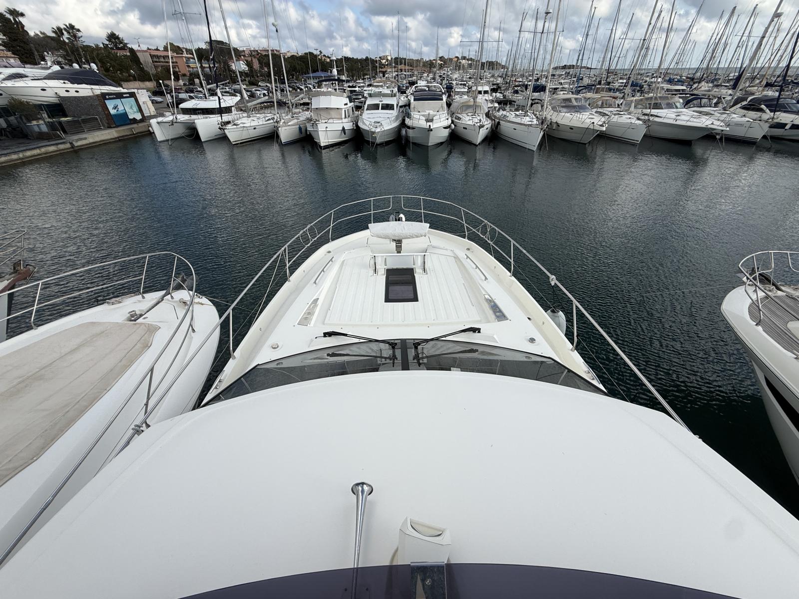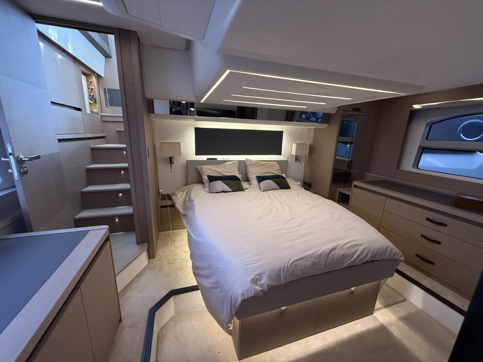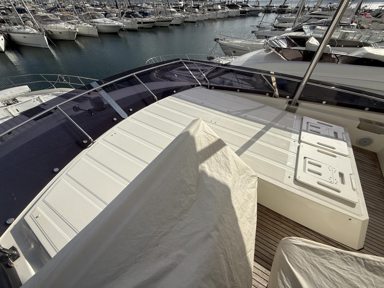 Exterior & Comfort: Brittany taupe upholstery + black micro-perforated windshield cover, 4G WiFi antenna router onboard, foot switches windlass, stainless pressure pads, custom cabin cushions wall-to-wall, courtesy lighting pack, electric cockpit awning, forward carbon sunshade + clips, skipper cabin feet supports, flybridge hard top, hydraulic telescopic gangway, hydraulic bathing platform, forward telescopic Abacos table, exterior curtains PVC/Sunworker.