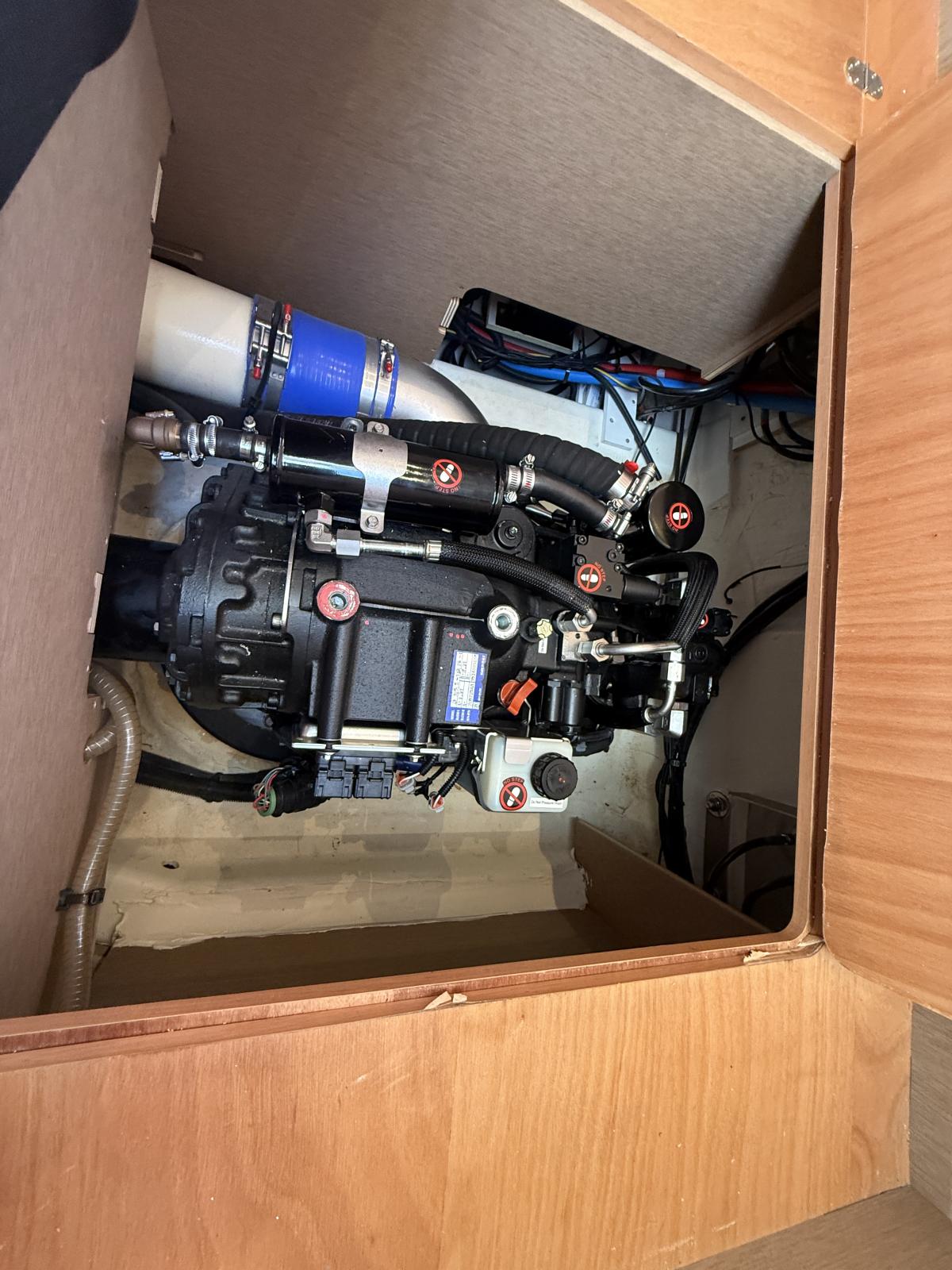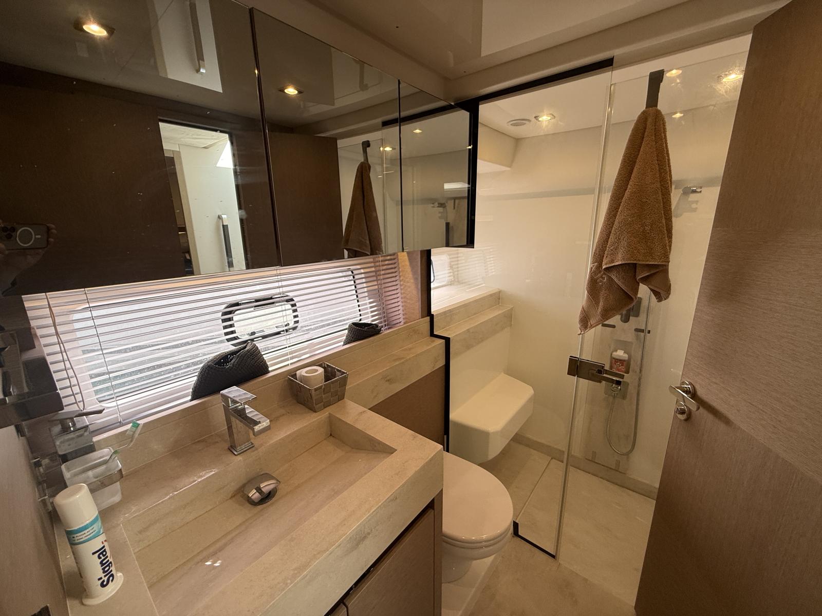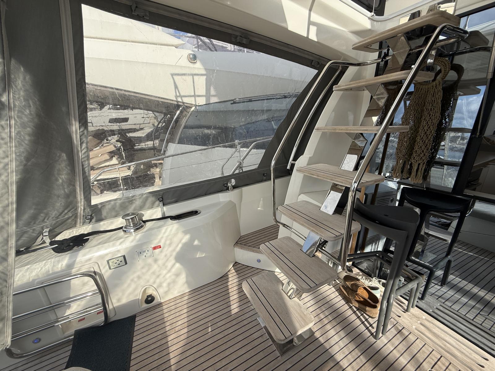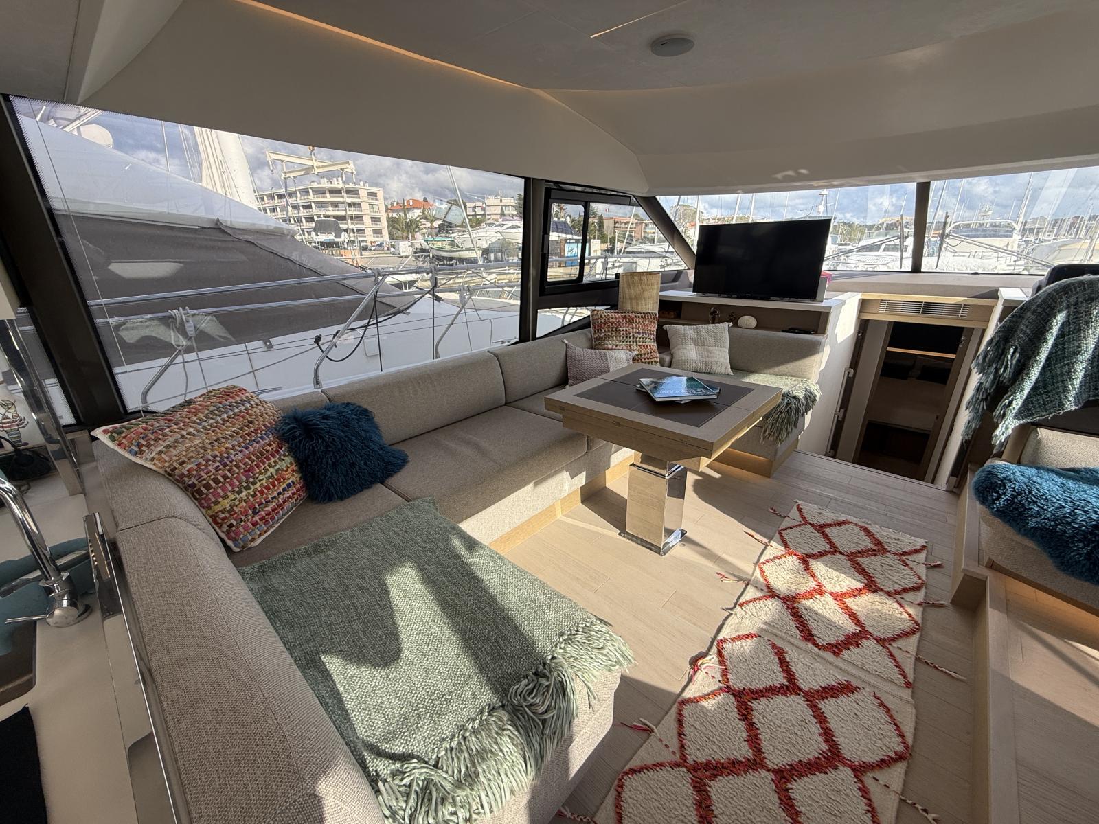 Exterior & Comfort: Brittany taupe upholstery + black micro-perforated windshield cover, 4G WiFi antenna router onboard, foot switches windlass, stainless pressure pads, custom cabin cushions wall-to-wall, courtesy lighting pack, electric cockpit awning, forward carbon sunshade + clips, skipper cabin feet supports, flybridge hard top, hydraulic telescopic gangway, hydraulic bathing platform, forward telescopic Abacos table, exterior curtains PVC/Sunworker.