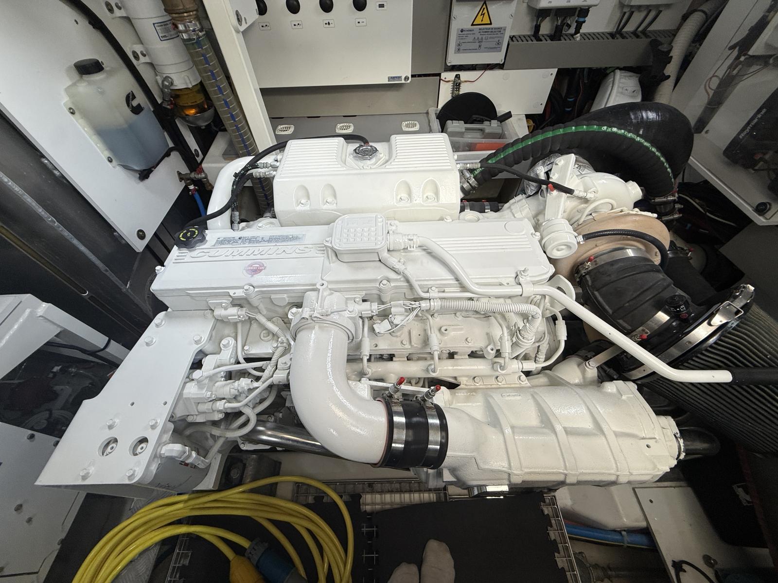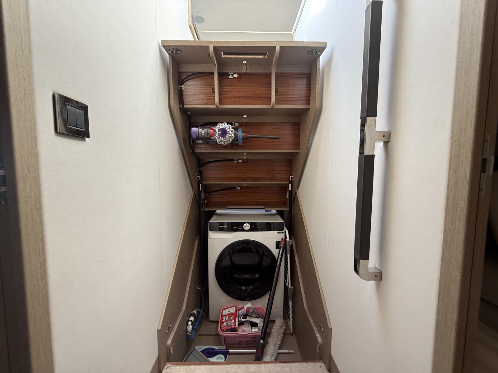 Luxury Interior: Miele microwave, washer/dryer, dishwasher, tropical 137k BTU A/C + 8k BTU crew, 43" TVs salon/owner/VIP (full pre-wiring), sprung mattresses, Élégance carpeting, white brushed oak parquet entrance/salon, luxury folding saloon table, safe, storage cabinet, lacquered kitchen drawers.