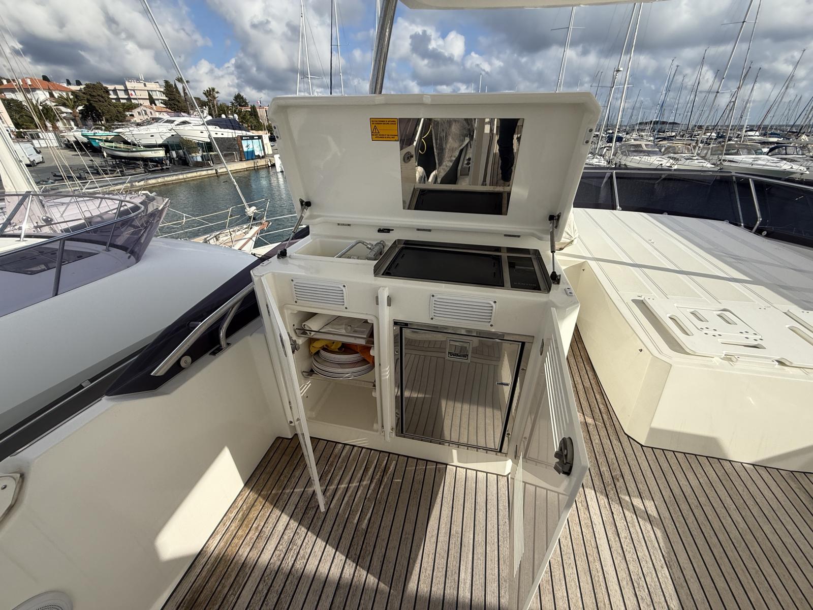 High-End Options: 100L/h desalinator, battery monitoring, remote Ship Control, 4x Lumishore blue underwater lights, deck spotlight/LED stern, fly grill/fridge, cockpit ice maker, flybridge teak floor, Abacos relax bench, fly/cockpit covers.