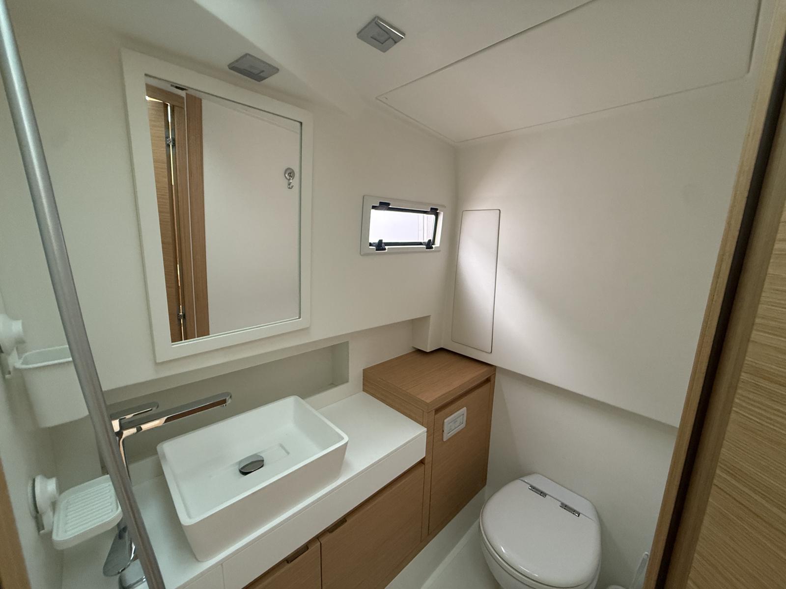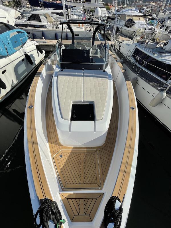 Forward owner’s cabin, bathroom with electric toilet, black carbon T‑Top, Silvertex upholstery.