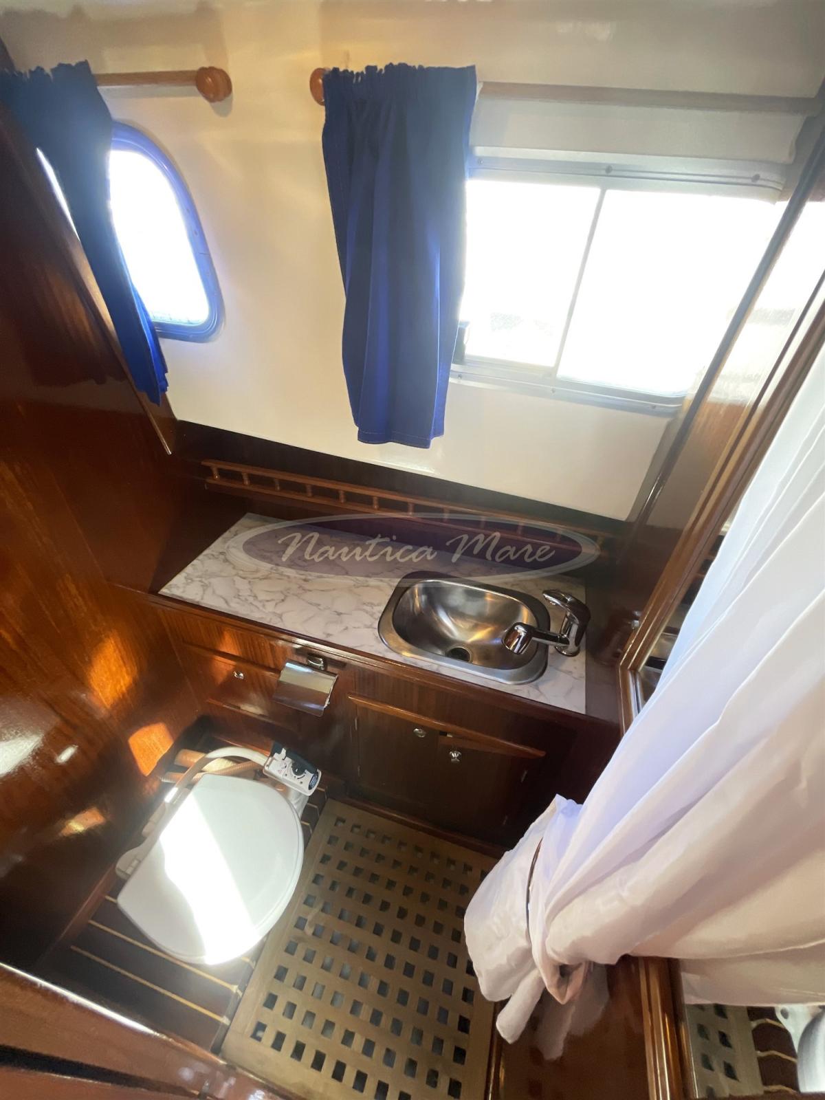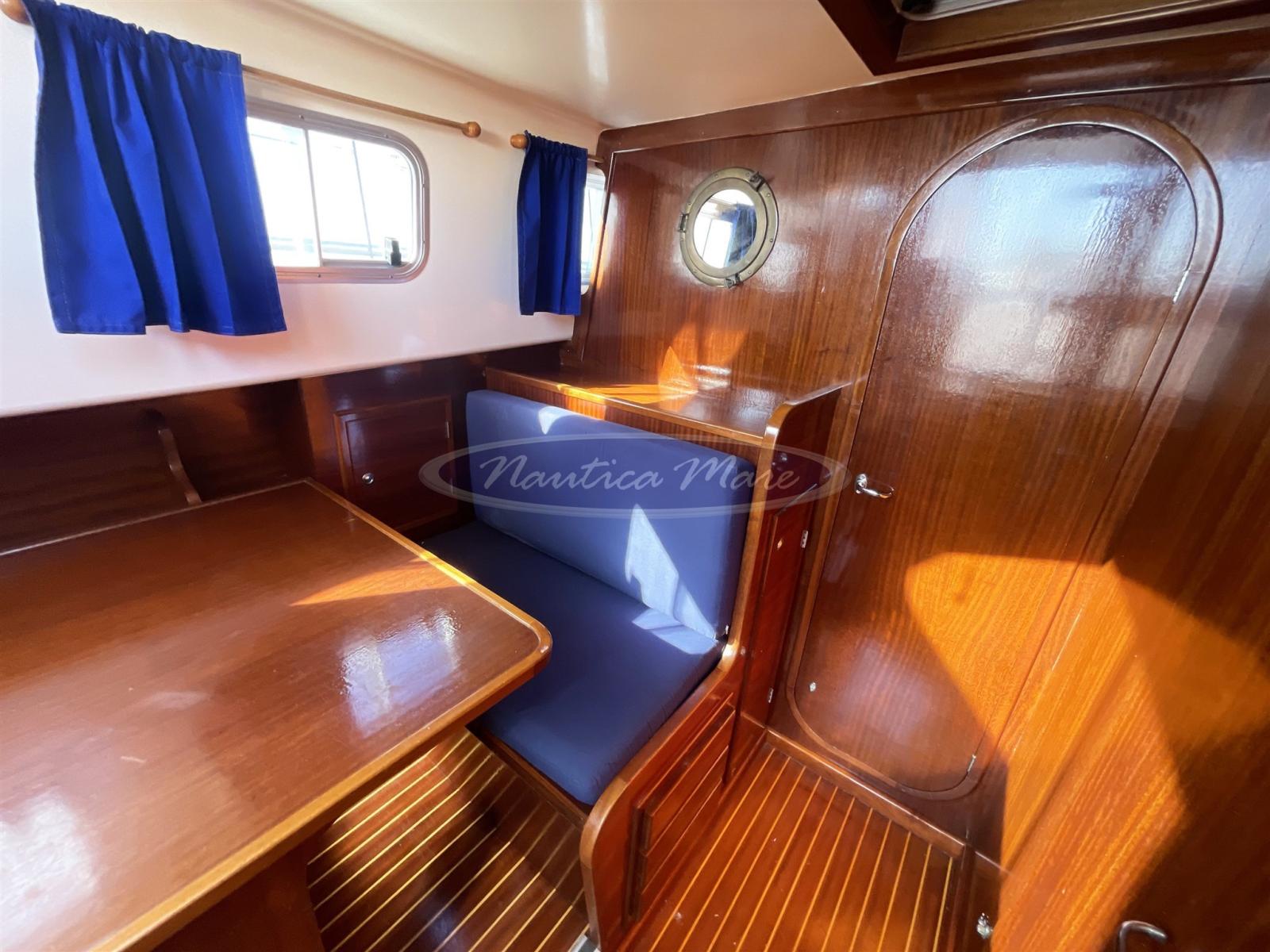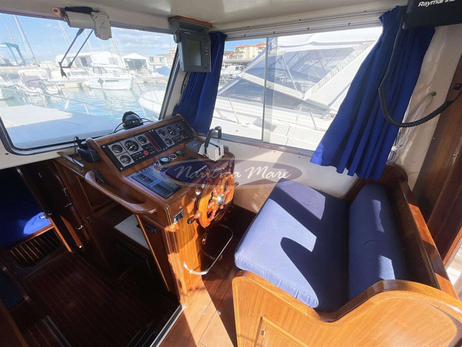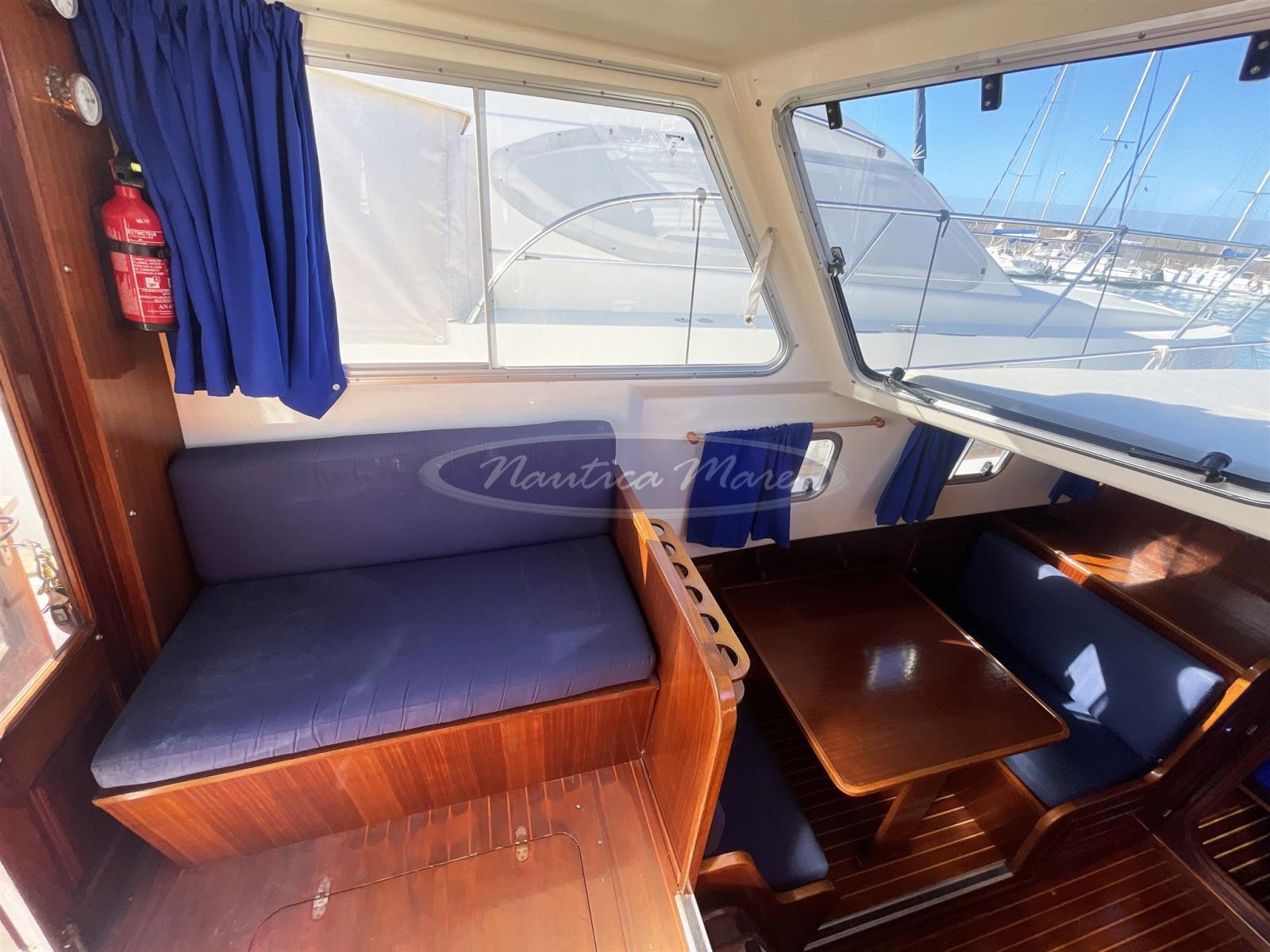 A traditional boat, typical of the Balearic Islands, the Menorquin 45L for sale is a comfortable "houseboat" that encloses generous spaces both outside and below deck in just 9 meters. From stern to bow we find a comfortable ladder for climbing from the sea with a swim platform and an equally comfortable folding gangway in steel and wood for disembarking / boarding from land. The cockpit with a rounded stern houses two side seats complete with cushions, protected by a large sun awning mounted on a retractable stainless steel arch. The large side walk-around walkways lead quickly and safely to the bow, to the winch with anchor and chain and to the large sunbathing area complete with cushions. In the cockpit, the large wooden and glass door that can be fully opened connects the outside with the interior of the boat. The interiors are large and bright, with a classic, marine flavor, with a lot of wood and blue cushions. The rudder is a real work of art. The total berths are 4/5, 2/3 of which are in the forward V-cabin, 2 in the convertible dinette. The two rooms are separated by a wooden door. The bathroom is also separate and equipped with shower and sink, the kitchen complete with sink, refrigerator, electric stove. The helm station complete with comfortable seating has a sofa for 2/3 guests next to it. The electronic navigation instrumentation is complete and modern: latest generation Raymarine Axiom 9 GPS, echo sounder, VHF radio, autopilot, radar. The instrumentation of the Yanmar engines is also complete and functional. The 2 Yanmar turbo diesel engines in shaft line of 88 hp each, with 1240 hours of operation, are well cared for and maintained. The maximum speed is about 10 knots, the cruising 8.5. Diesel consumption is very low. The generous range allows for long and comfortable crossings without stopping. We recommend a visit!