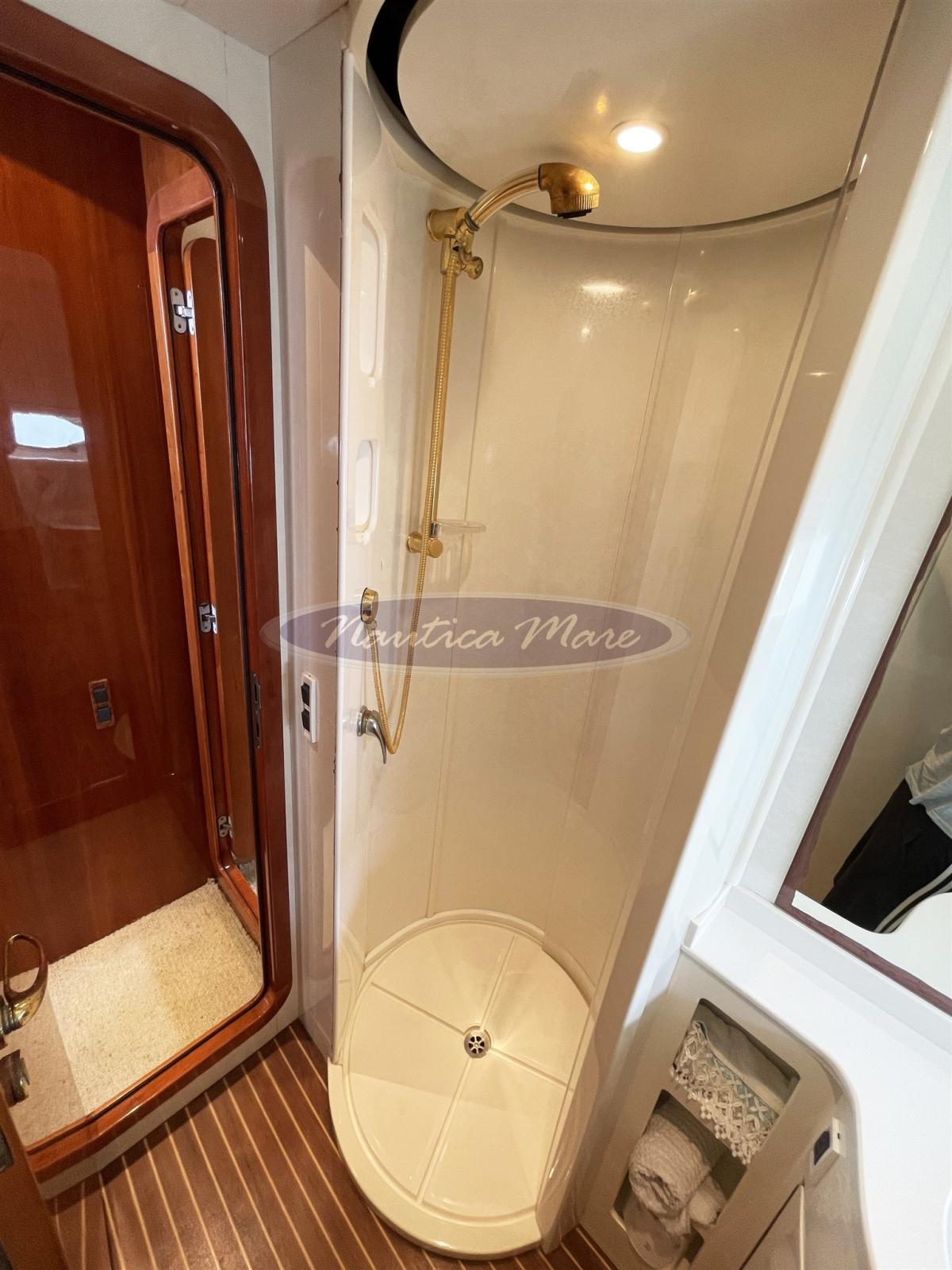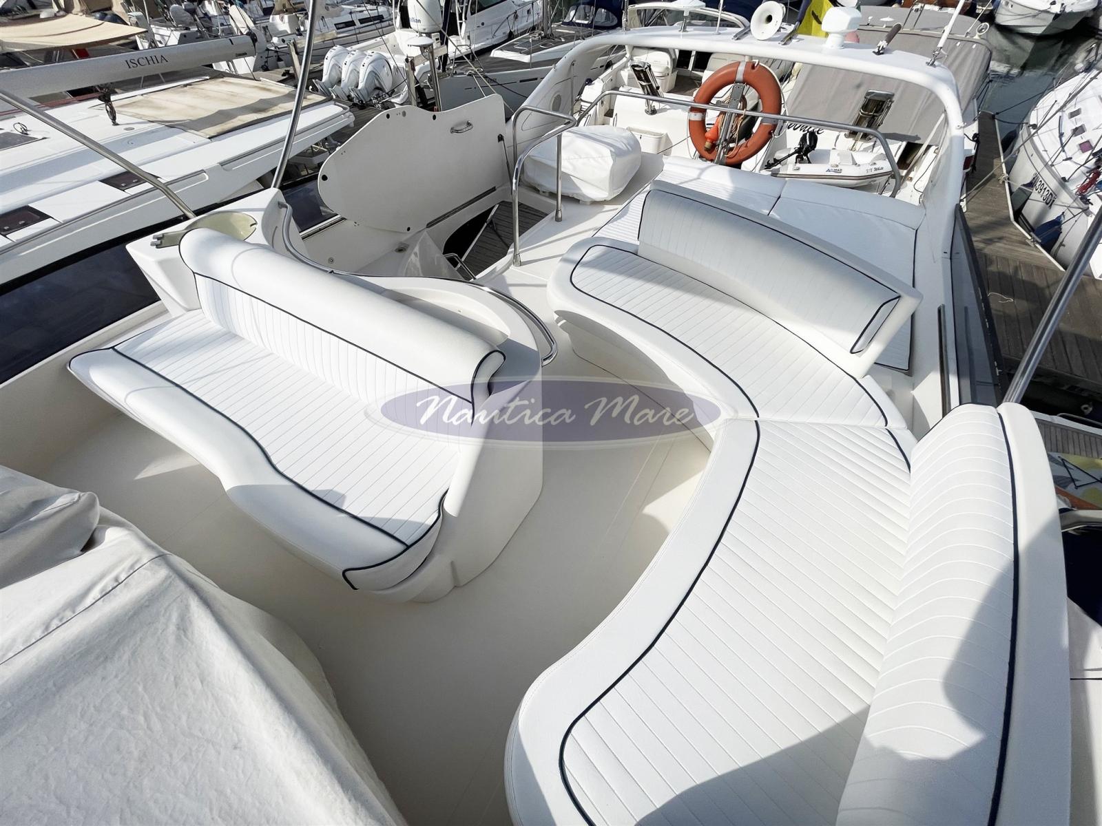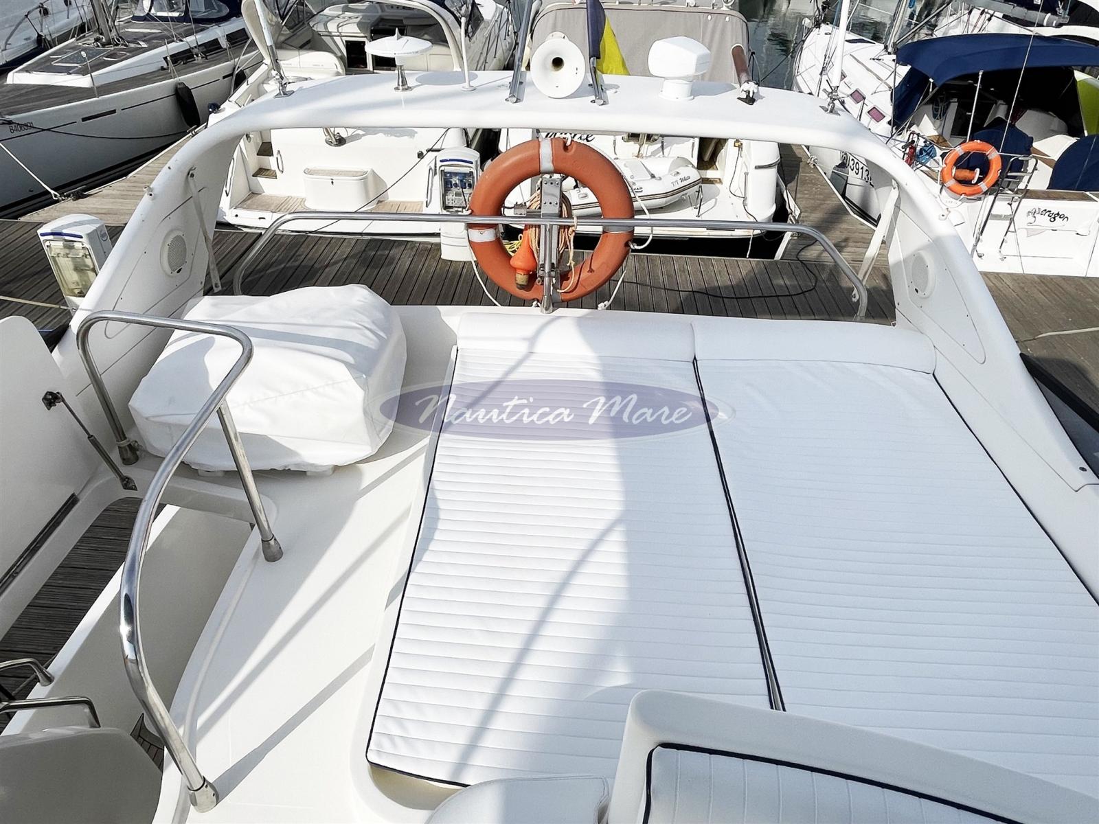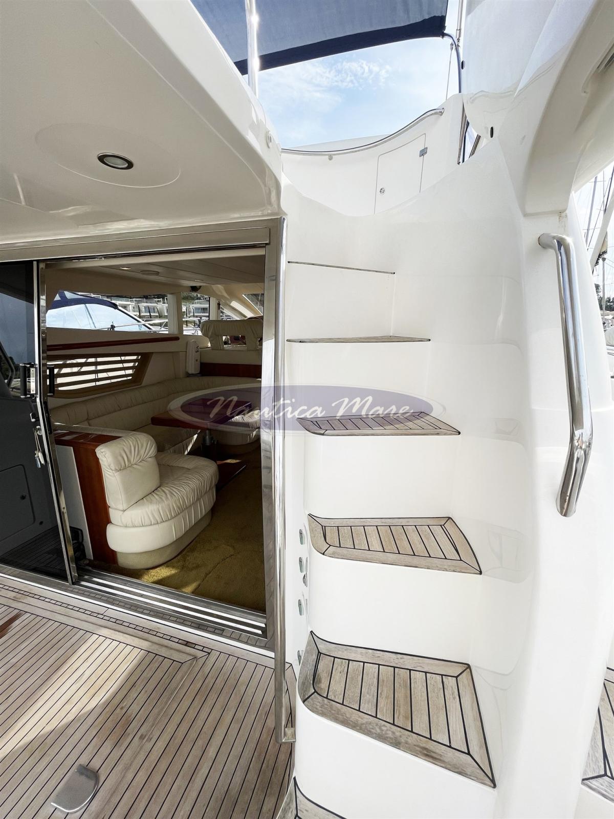 Engine Alarm, Water pressure pump, Deck Shower (con miscelatore c/f), Twin Steering, Hydraulic Flaps, Fire Extinguishing System, Flaps Indicators, Gangway (Opacmare), Platform (con rivestimento in teak), Automatic Bilge Pump, Manual Bilge Pump, Entry door (Inox e vetro), Teak Cockpit, Shorepower connector, Water harbor connector system, Electronic instrumentation repeater (sul fly), Rollbar, Electric Windlass, swimming ladder, Tender (Arimar 2,50 chiglia pneumatica e fondo in alluminio + motore Honda 5 hp), Horn, 2 Stern Winches.