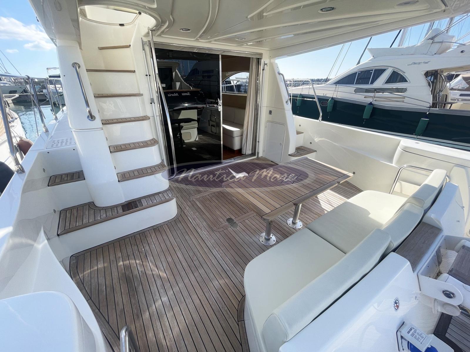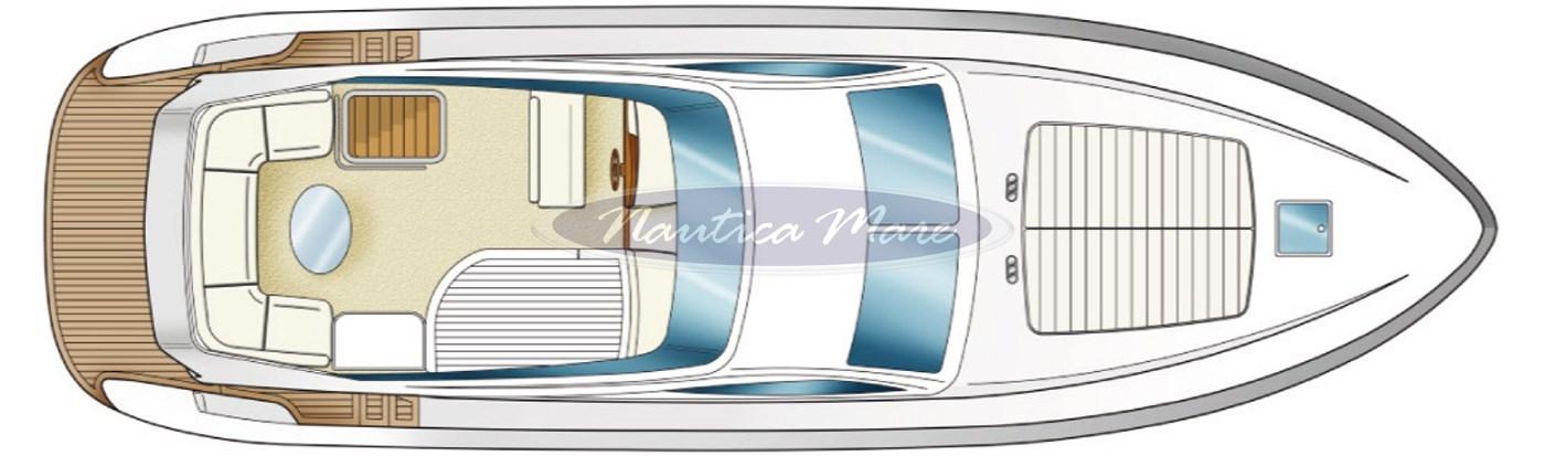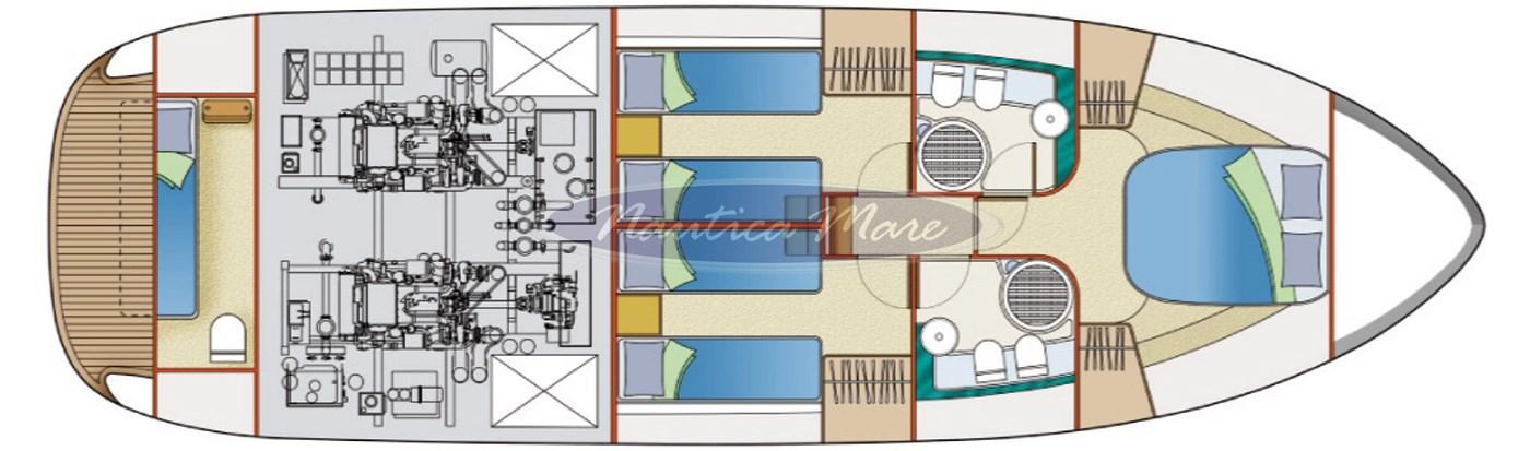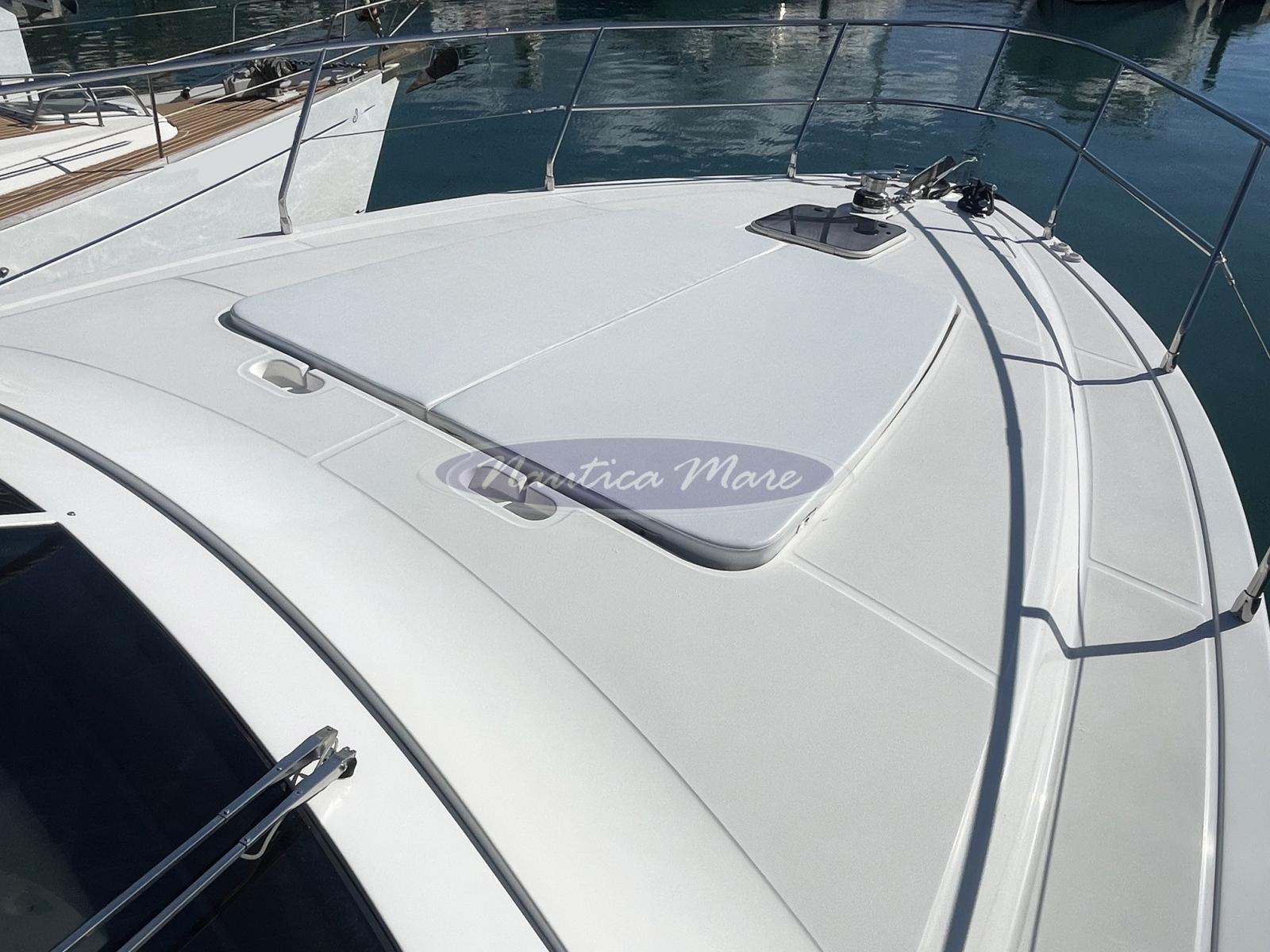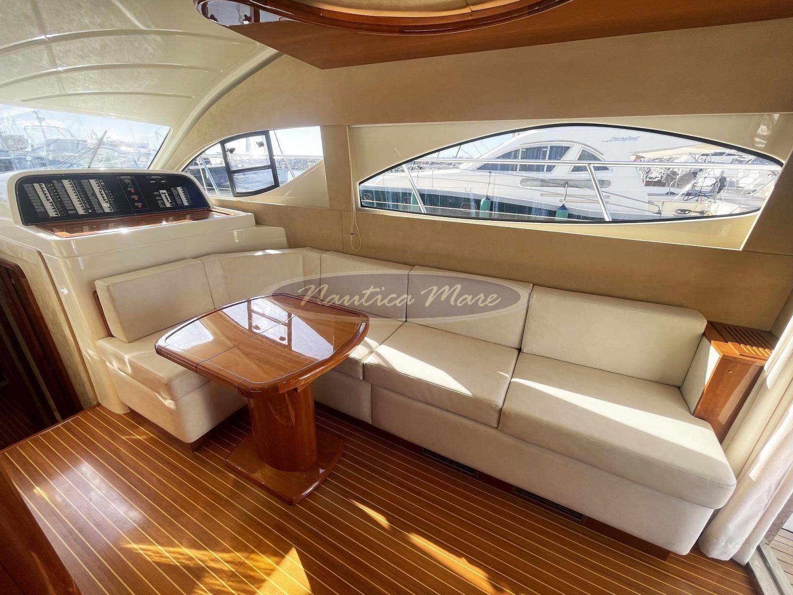 Engine Alarm, Bilge Alarm, Alternator, Water pressure pump, Folding cleats (a poppa a scomparsa con winch tonneggio lato dritto), Battery charger (Quick), Shore power cable, Guard rail, Deck Shower (nel pozzetto con miscelatore acqua c/f), Twin Steering (interna ed esterna sul fly), Stern Thruster (Quick), Bow Thruster (Quick), Directional Spotlight (di profondità sul fly), 2 Hydraulic Flaps (Bennett), Jet-Ski Crane (tramite la passerella di poppa), Fire Extinguishing System, Flaps Indicators, Washbasin in the cockpit, Courtesy Lights, Battery Monitor, Outboard engine for tender (Mercury 6 hp), Fenders, Gangway (idraulica Besenzoni, acciaio verniciato bianco e teak, lunghezza 3 mt., sollevamento 300 kg. con comando a distanza), Platform (ampia, a filo pozzetto con rivestimento in teak e doppio cancellino inox di accesso al pozzetto), Waste Water Tank Drain Pump, Automatic Bilge Pump, Manual Bilge Pump, Entry door (acciaio e vetro), Teak Cockpit (con divano e grande tavolo in teak abbattibile), Shorepower connector, Water harbor connector system, Electronic instrumentation repeater (sul fly), Rollbar (sul fly con antenne), Electric Windlass (con àncora e catena e winch di tonneggio con comando a pulsante), swimming ladder (a scomparsa nella piattaforma bagno a poppa con azionamento elettrico), Waste Water Purifier System, cockpit table (grande, abbattibile), Tender (Honda 240 cm. con scafo in vetroresina, portata 3 persone, completo di motore Mercury 6 hp), Horn, Stern Winches (lato dritto), Bow Winches (sul verricello dell'àncora).