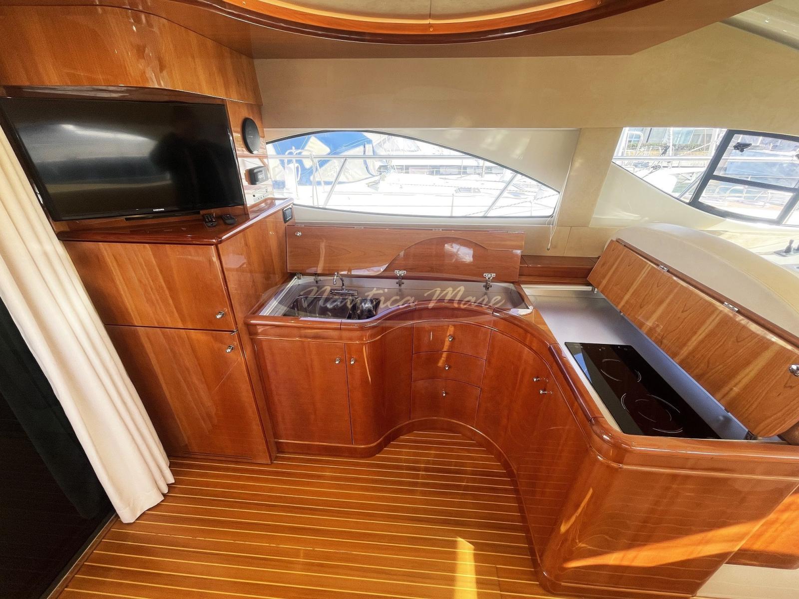 Galley (a scomparsa nel salone), Burner (elettrico / induzione 2 fuochi), Deck Refrigerator (sul fly), Refrigerator (con ghiacciaia), Icebox, Electric hot plate, Ceramic hot plate.