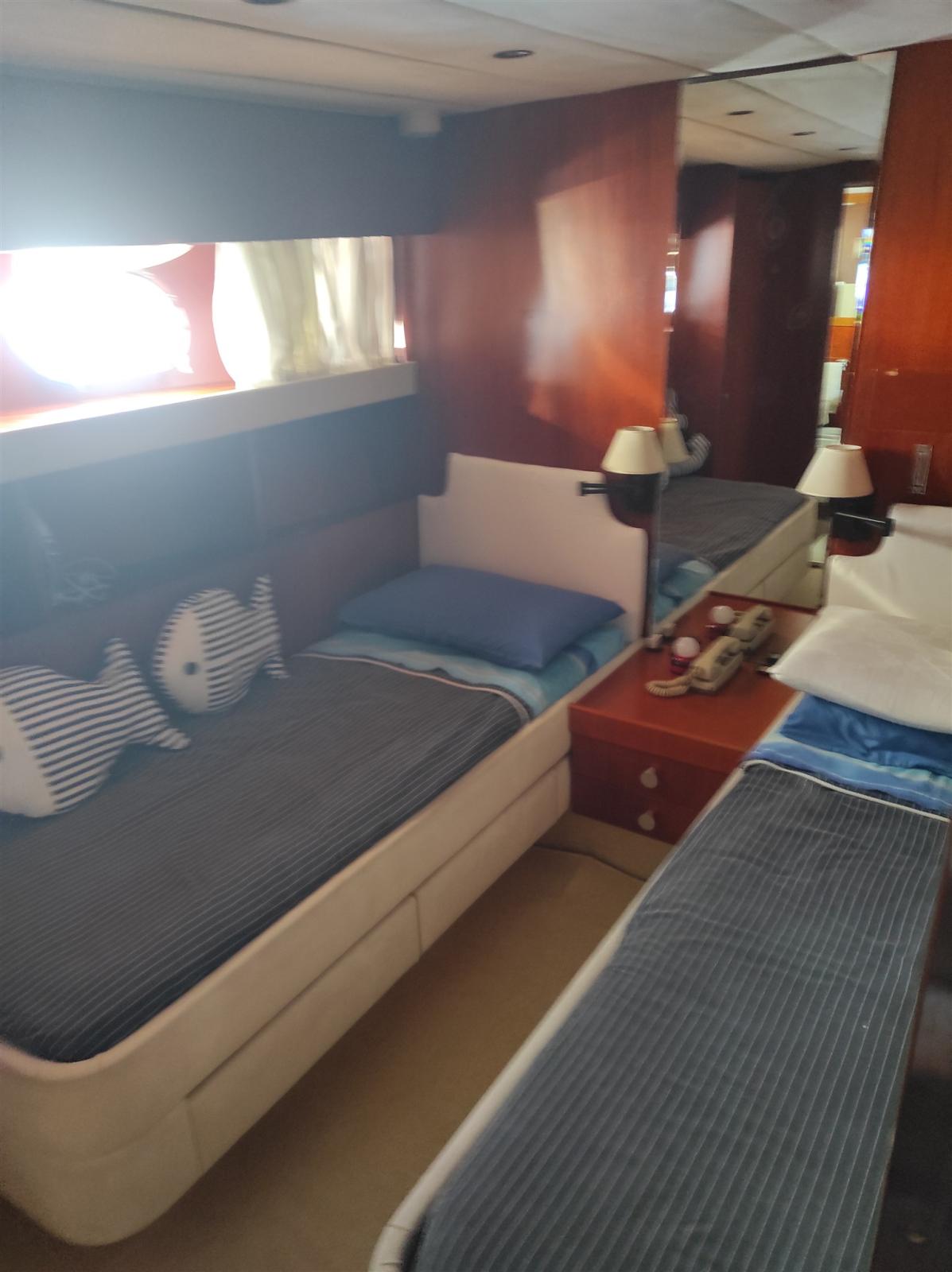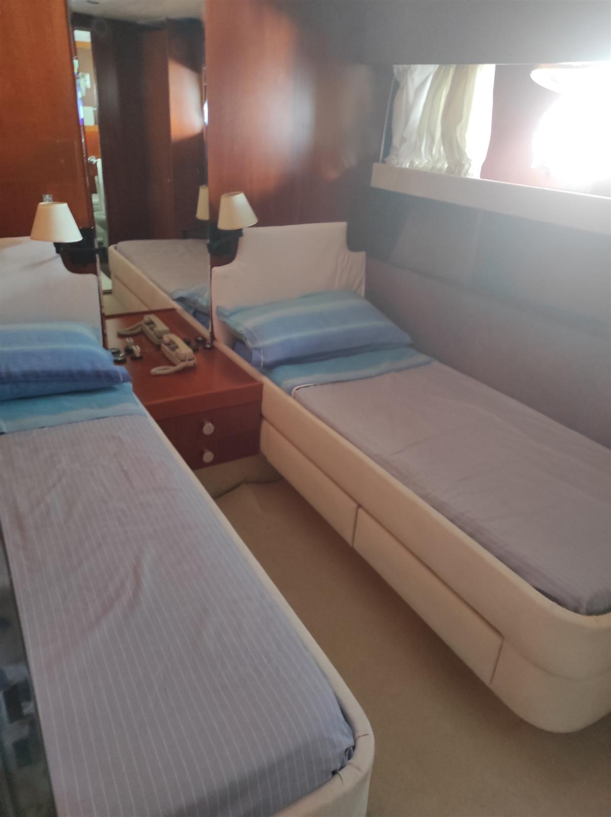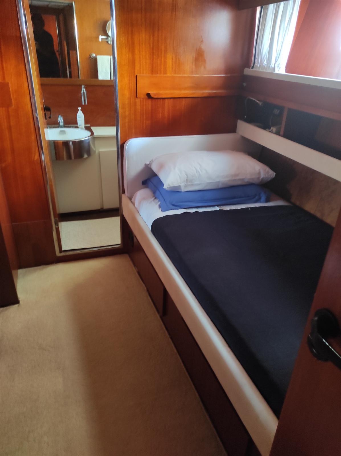 4 cabins and 4 bathrooms + 2 crew. Master cabin with en-suite bathroom and separate shower cubicle, 1 single cabin with en-suite bathroom, 2 cabins with parallel beds and 3 rollaway beds. Currently dry