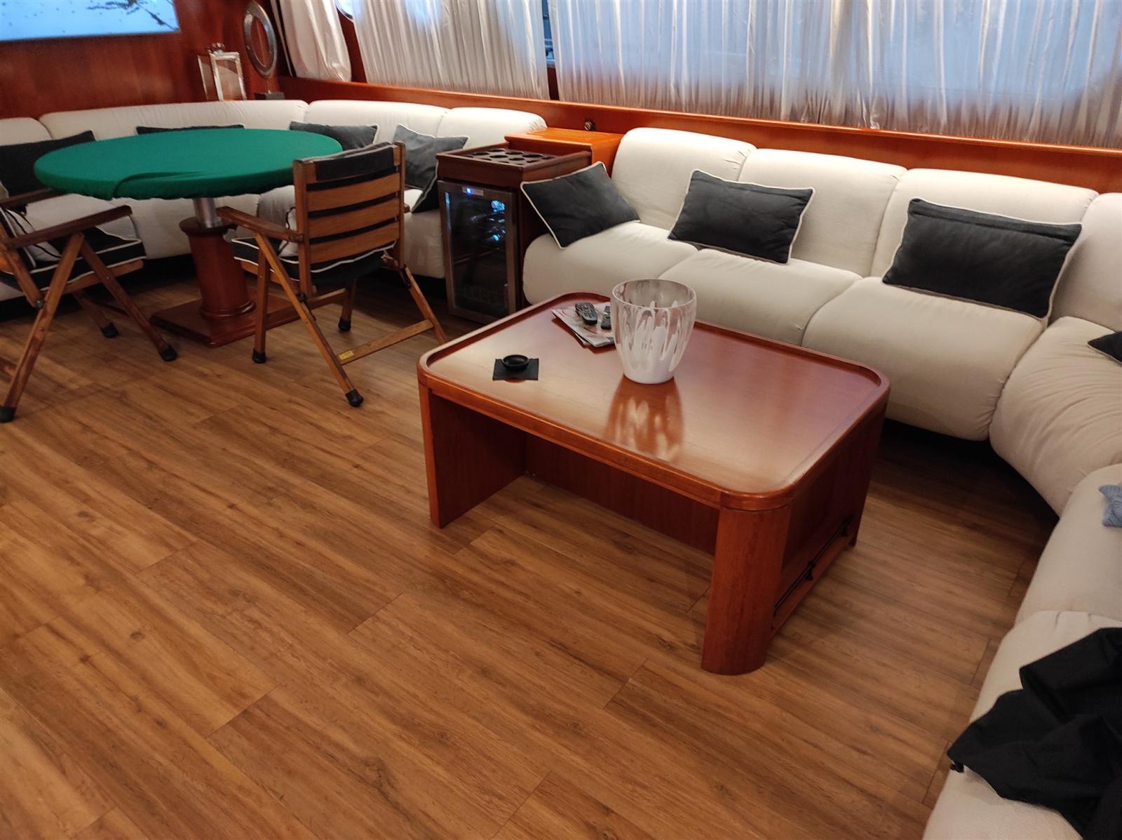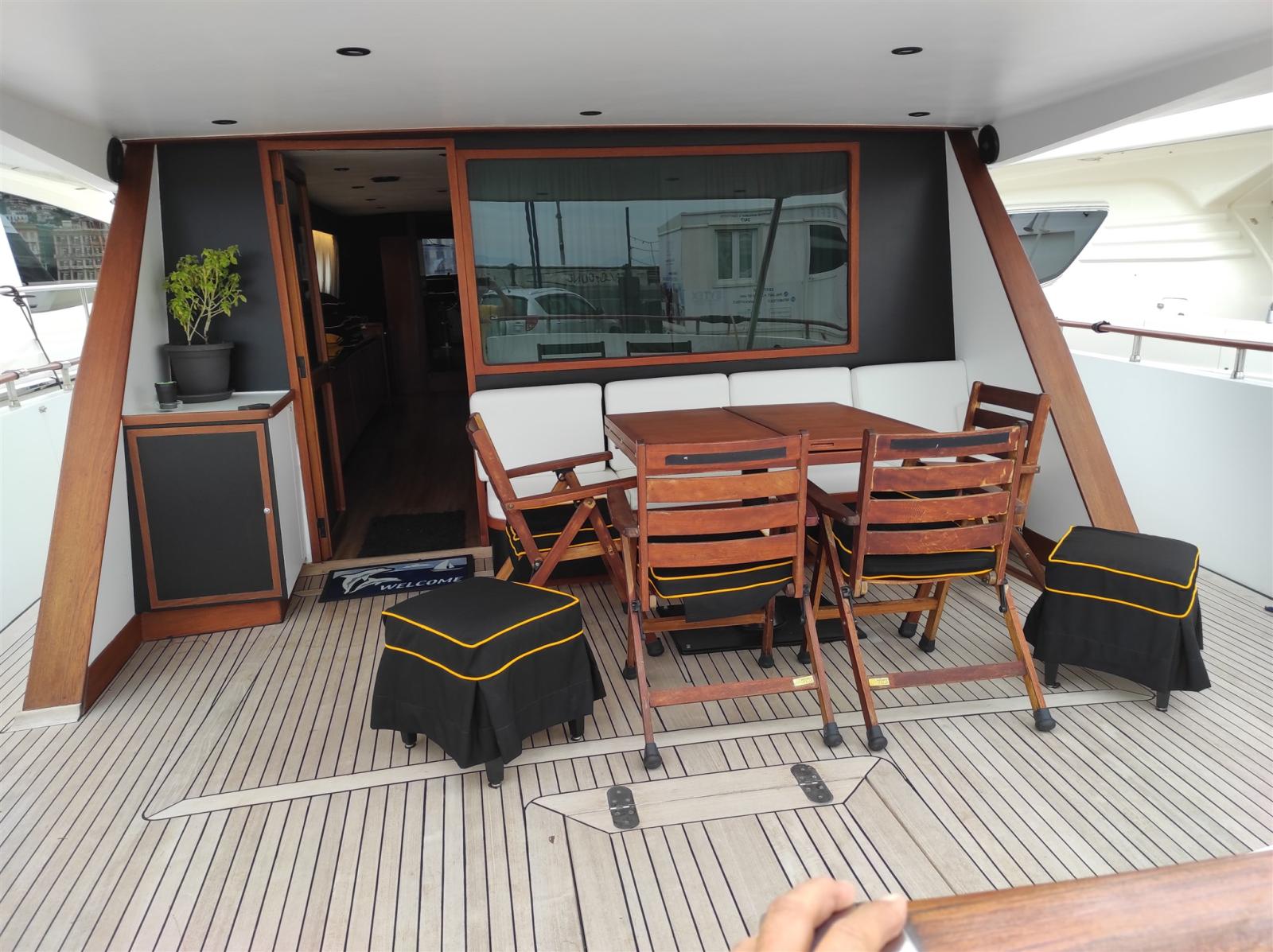 Water pressure pump, Twin Steering, Hydraulic Flaps, Davits for tender on fly, Fire Extinguishing System, Gangway (A scomparsa in teak), Platform (Maggiorata teak), Teak Cockpit, 2 Electric Windlass, cockpit table, 2 Stern Winches.