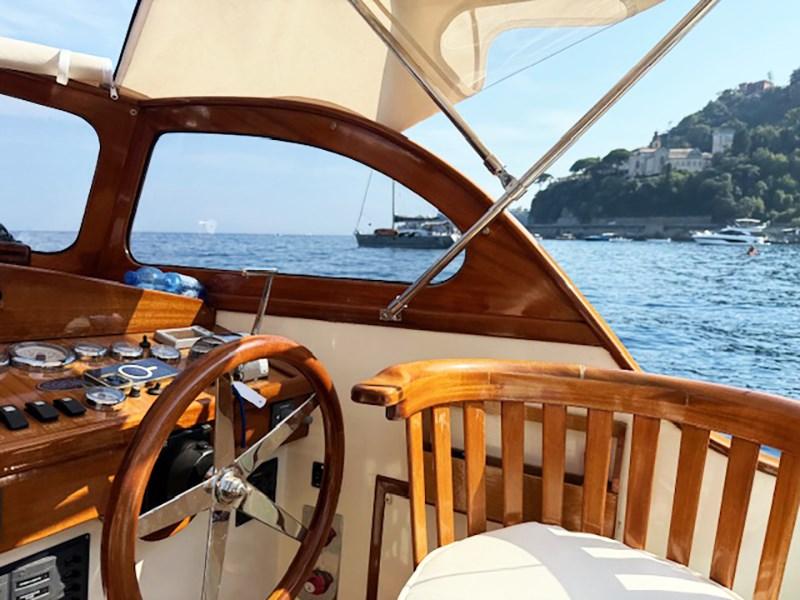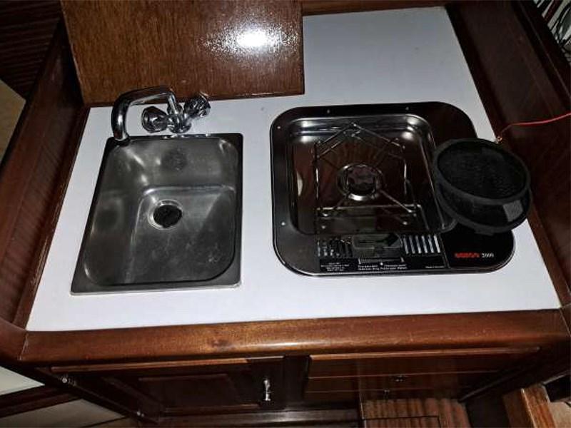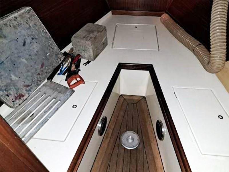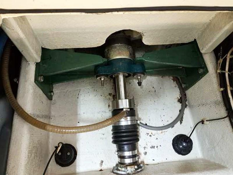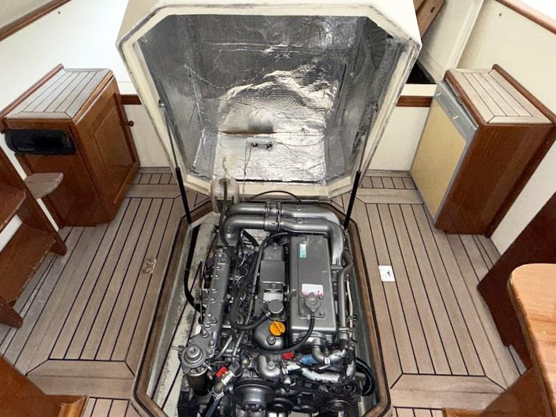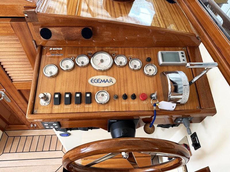 Navigation lights; Anchor light; Danforth again; Lewmar electric windlass; Chain still 40 m; 6 Mooring bollards; Wooden flagpole; Cockpit awning; Teak in cockpit; Teak Deck; Cockpit sundeck cushions; Cockpit shower; Teak swim platform; Automatic bilge pumps; Manual bilge pump; 220V shore socket; Charger; Batteries; Battery disconnect; Wipers; Rearview mirror; Solar panels; Kitchen sink; Gas fire; Electric toilet; Black water tank (45 l.); Webasto warm-up; Swim ladder; Waeco outdoor fridge; Bow thruster; Stern thruster; Boat Hook