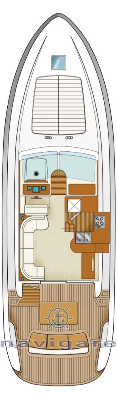 When cruising, the large flybridge dominates the sea, while the large and welcoming cockpit invites you to pleasant moments outdoors.