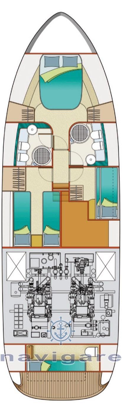 1 x Dinette, 2 x Toilet with shower, 1 x Italian double bed, 1 x Twin floor, 1 x Twin bunk beds, 1 x Cabin equip