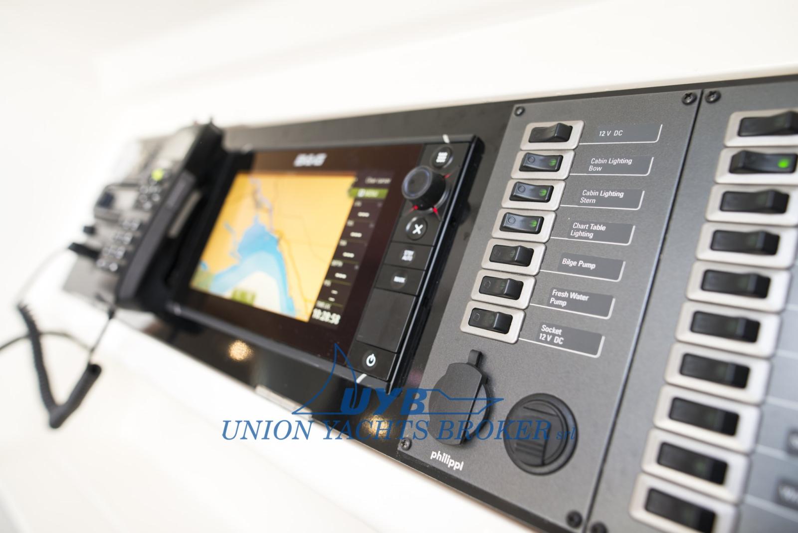 Depth Sounder (B&G Triton 2 completo di:N 01 display digitale, sensori speed/depth/wind), Autopilot (B&G Triton 2 pilota:, tastiera di comando, main processor, sens. angolo di barra, staffa tiller e attuatore idraulico,bussola Precision 9 inclusa), Plotter with GPS antenna (GARMIN Chartplotter GPSMAP 923 - Display 9" con cartuccia Navionic+), VHF Radio (B&G V60B VHF con ricevitore / trasmettitore AIS, antenna, cavo e staffa).