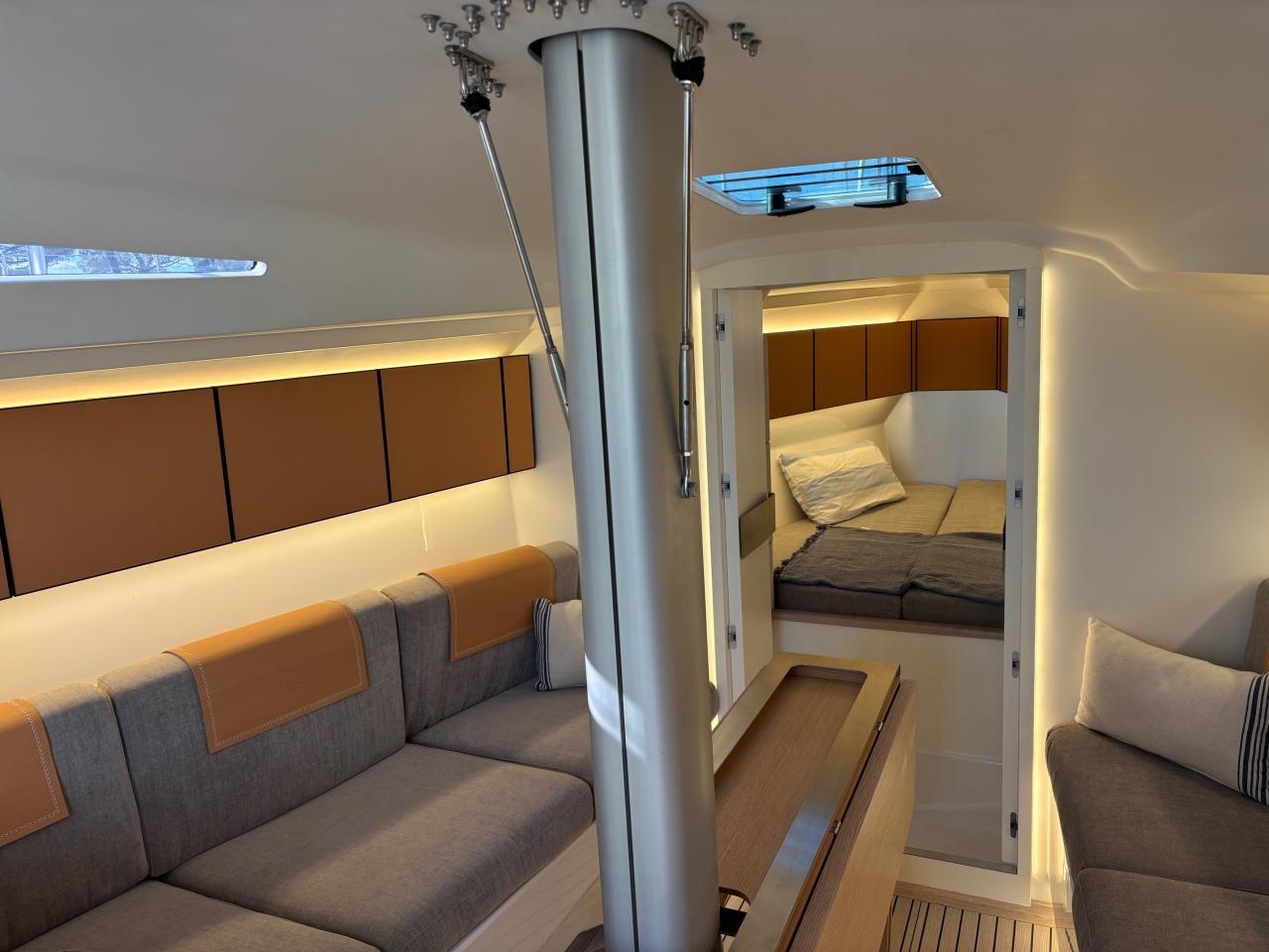 Bellissima interior with leather covered cabinets in saloon and three cabins