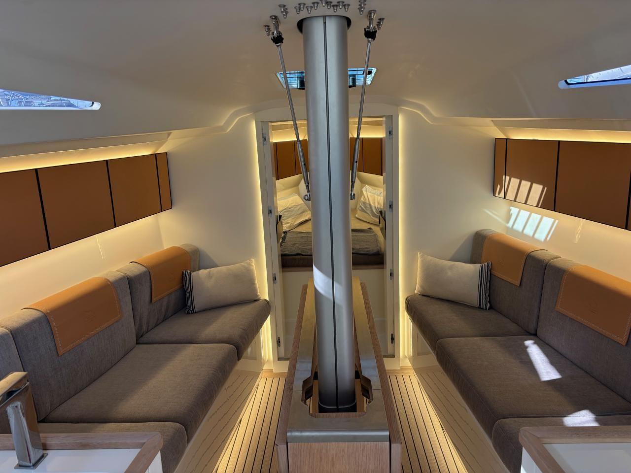 Saloon table in the center of the boat with bench seats on the starboard and port sides