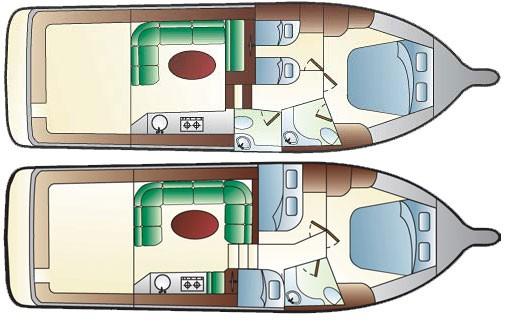 Forward owner's cabin with peninsula bed + bathroom - Guest cabin with flat beds + bathroom