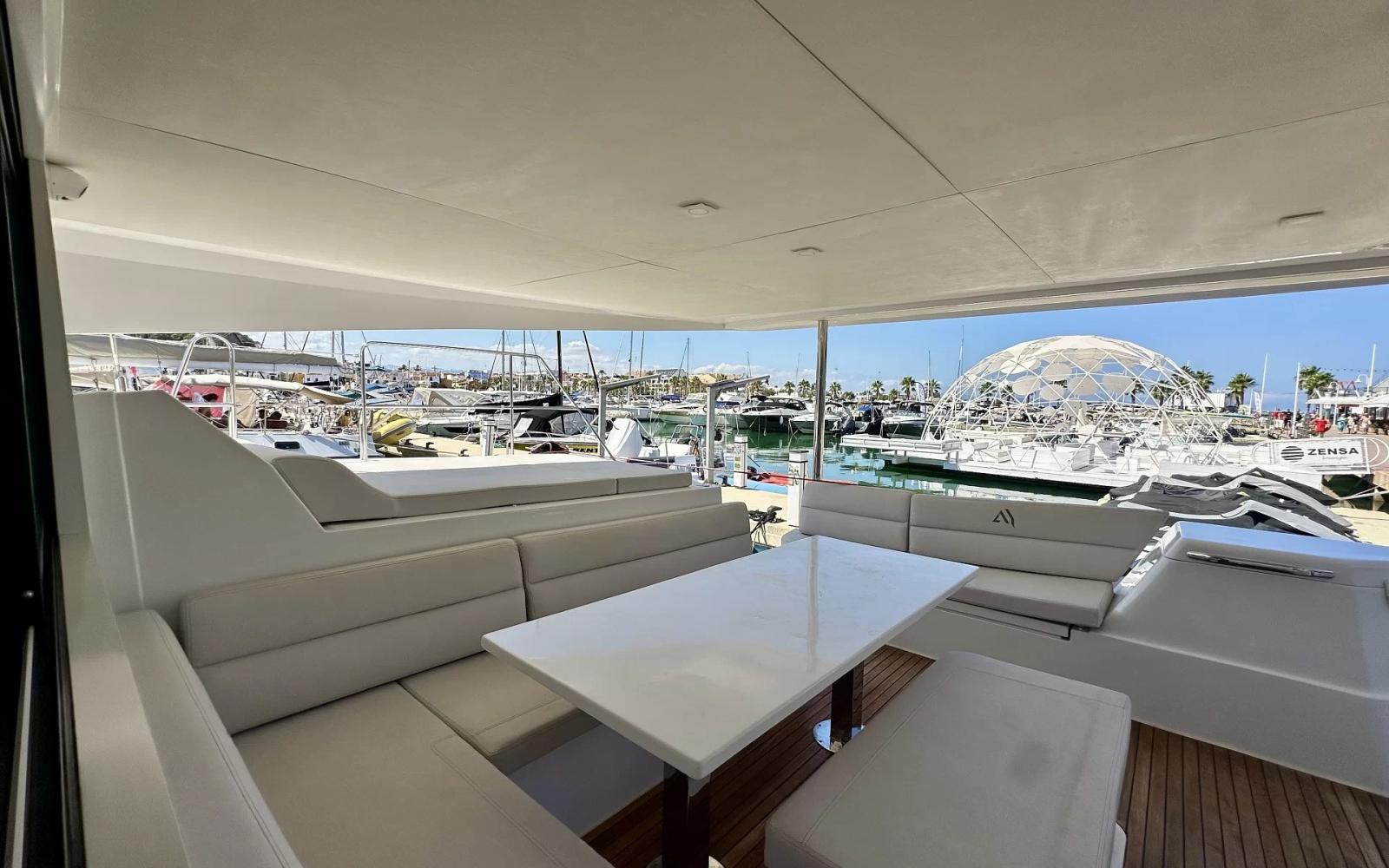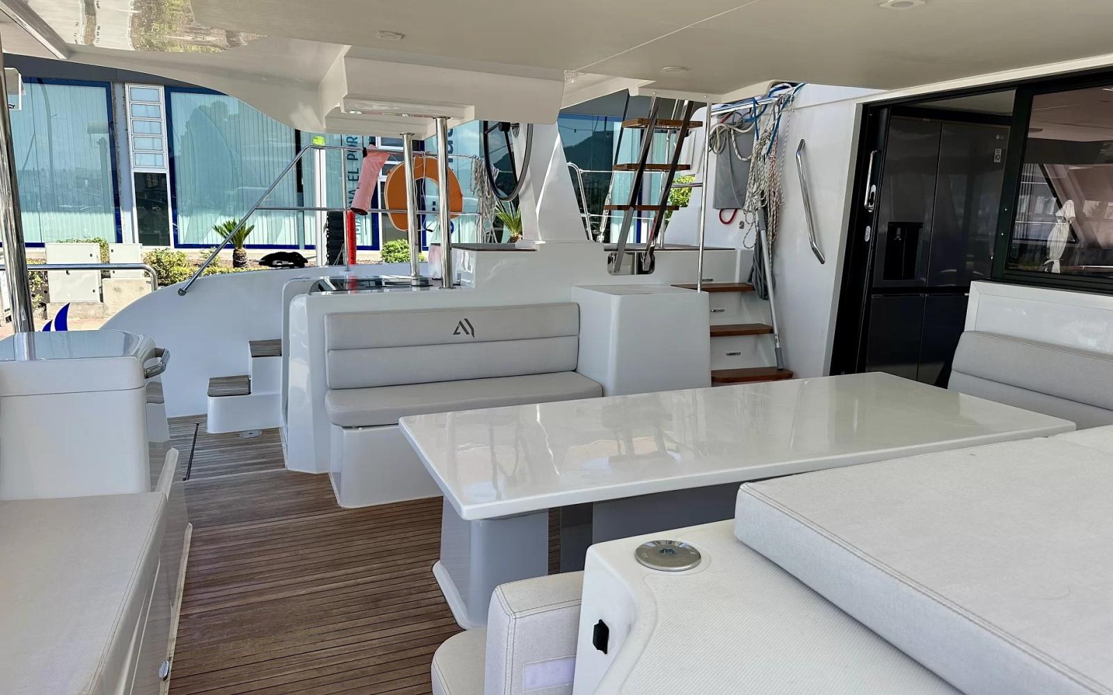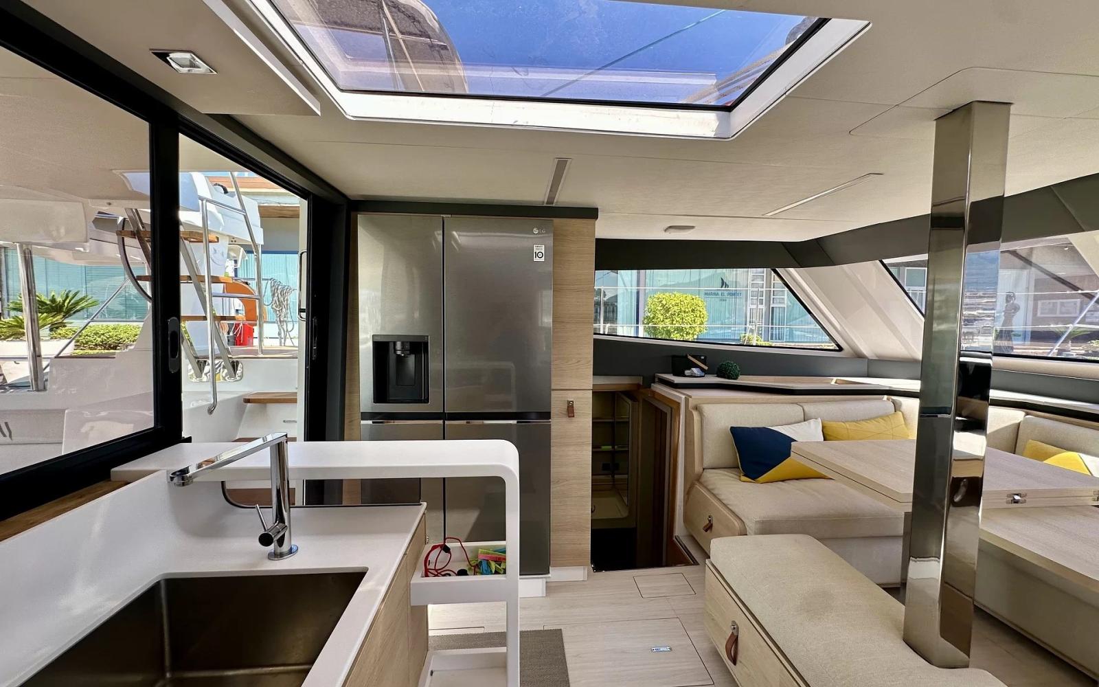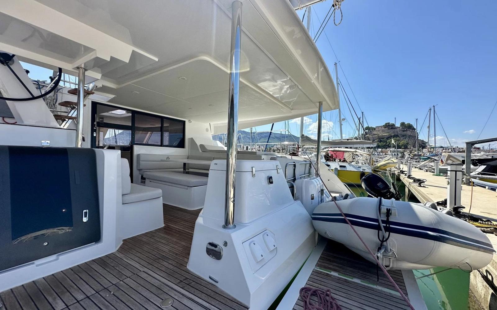 This owner's version of the Aventura 45 offers a particularly comfortable and well-equipped cruising program. One of the hulls is entirely dedicated to a spacious master suite, guaranteeing a real private space on board. The outdoor life is organized around a large convivial aft cockpit, complemented by a pleasant forward cockpit and a flybridge offering excellent visibility when sailing. Carrying maneuvers are made easier by the presence of a rear camera. Designed for autonomy and comfort, the boat has a radar, solar panels complemented by a generator, as well as a fully equipped kitchen with fridge, freezer, microwave, washing machine and dishwasher. The atmosphere on board also extends at anchor thanks to the underwater spotlights and the entertainment system with Smart TV in the saloon. Free delivery in Mediterranean France.
