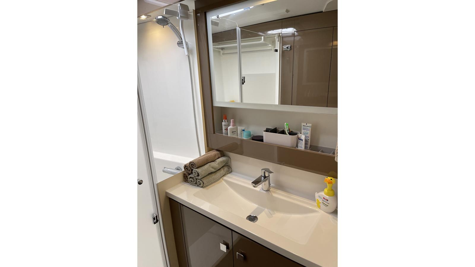 1 large owner’s cabin on the starboard side with a double bed, a desk, a toilet and an en-suite bathroom with a separate shower.