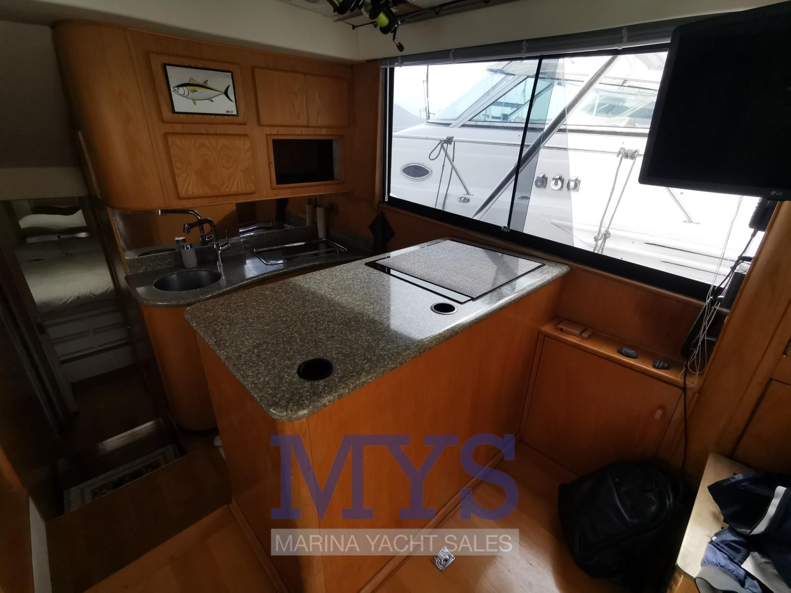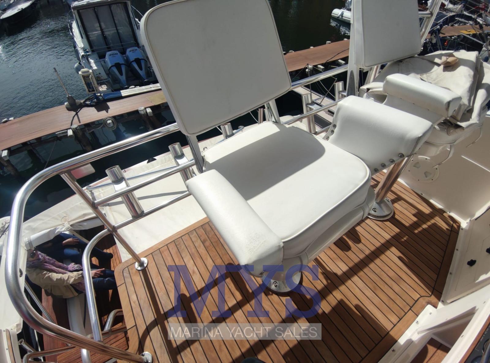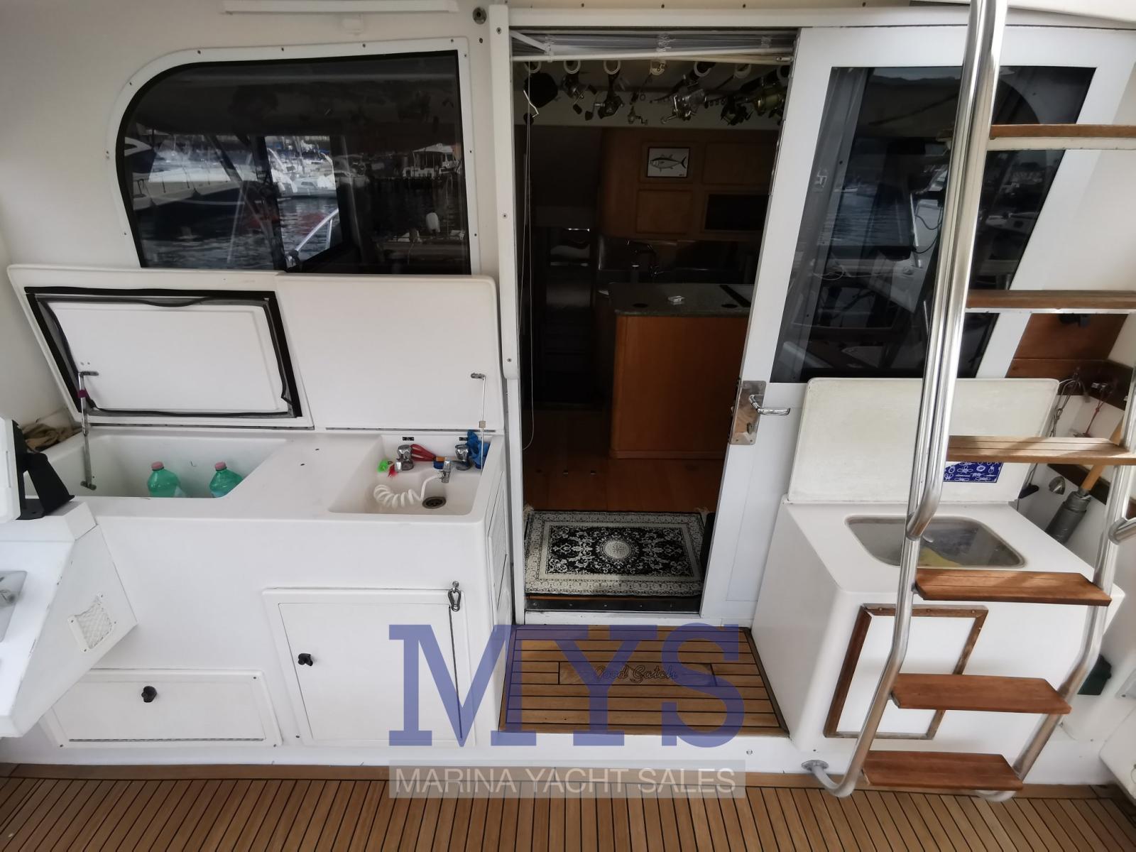 Bilge Alarm, Water pressure pump, 13 Batteries, 3 Battery charger, Deck Shower (a prua e poppa caldo/freddo), Twin Steering, 2 Electric Flaps, Fire Extinguishing System, Compressor Air System, Flaps Indicators (solo sul Fly), Washbasin in the cockpit, Courtesy Lights, Platform, 3 Automatic Bilge Pump, 2 Manual Bilge Pump, Entry door, Teak Cockpit, Shorepower connector, Water harbor connector system, Electronic instrumentation repeater, Electric Windlass, swimming ladder, cockpit table, Horn.