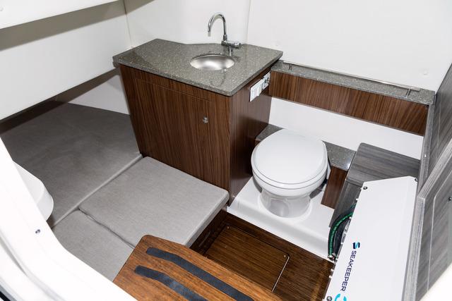 The spacious cockpit is perfectly designed for fishing, while the bow area provides a comfortable lounge space with seating and sunpad. The center console also features a cabin with marine toilet and a small berth.