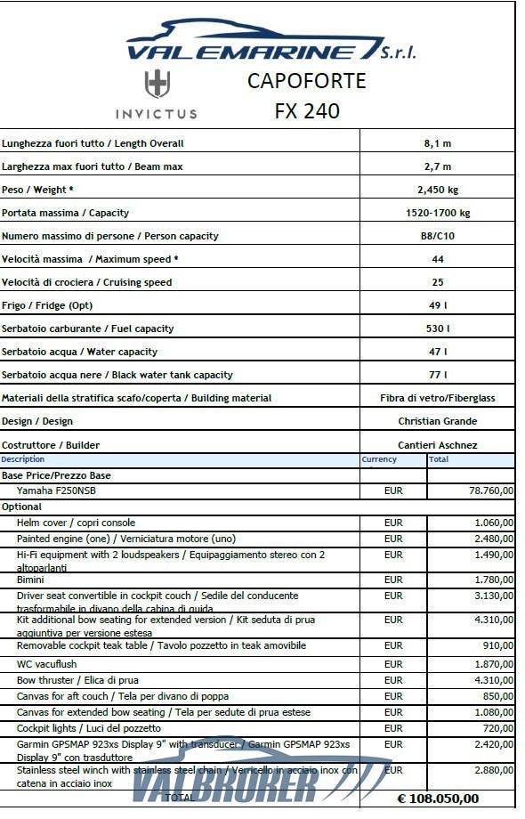 Water pressure pump, Deck Shower, swimming ladder (a scomparsa), cockpit table (teak rimovibile), Winch (inox con catena in inox).