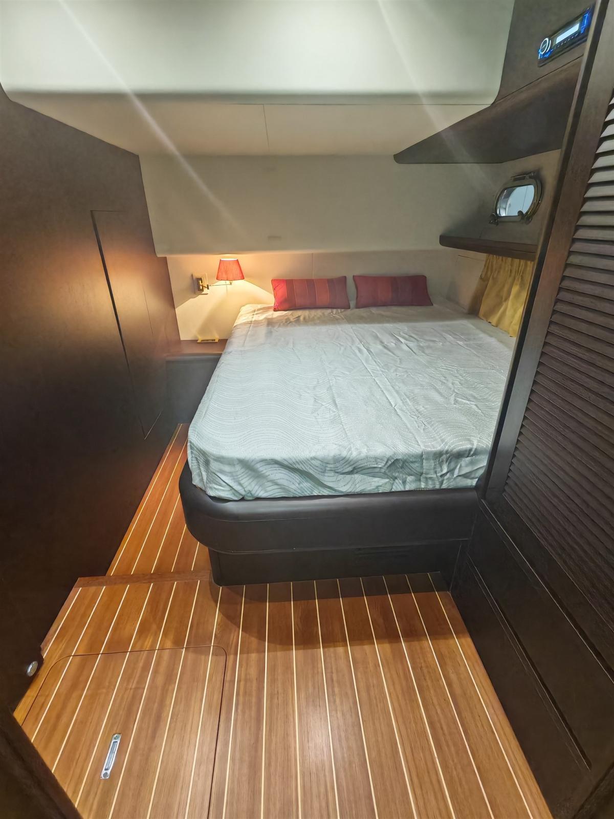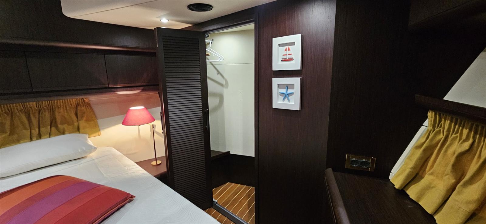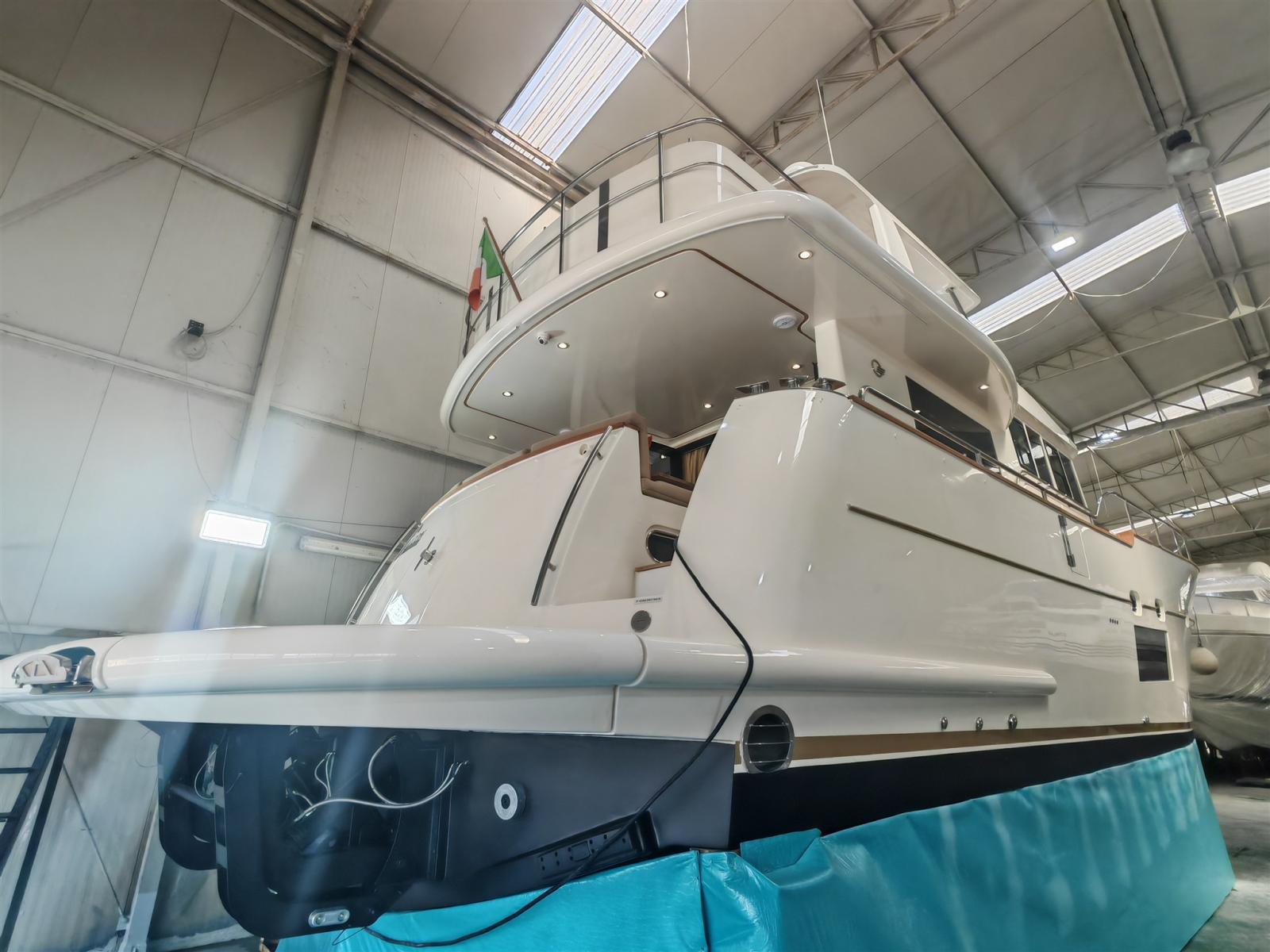 Engine Alarm, Bilge Alarm, Water pressure pump, 4 Batteries (agosto 2023), Teak Side Decks, Deck Shower, Twin Steering, Directional Spotlight, Hydraulic Flaps, Fire Extinguishing System, Flaps Indicators, Courtesy Lights, Gangway, Platform (in teak abbatibile), Entry door (con apertura totale), Side door, Teak Cockpit, Shorepower connector, Voltage Rectifier, Electric Windlass, swimming ladder, cockpit table, Horn, T-Top (in vtr sul fly), 2 Winch Electric.