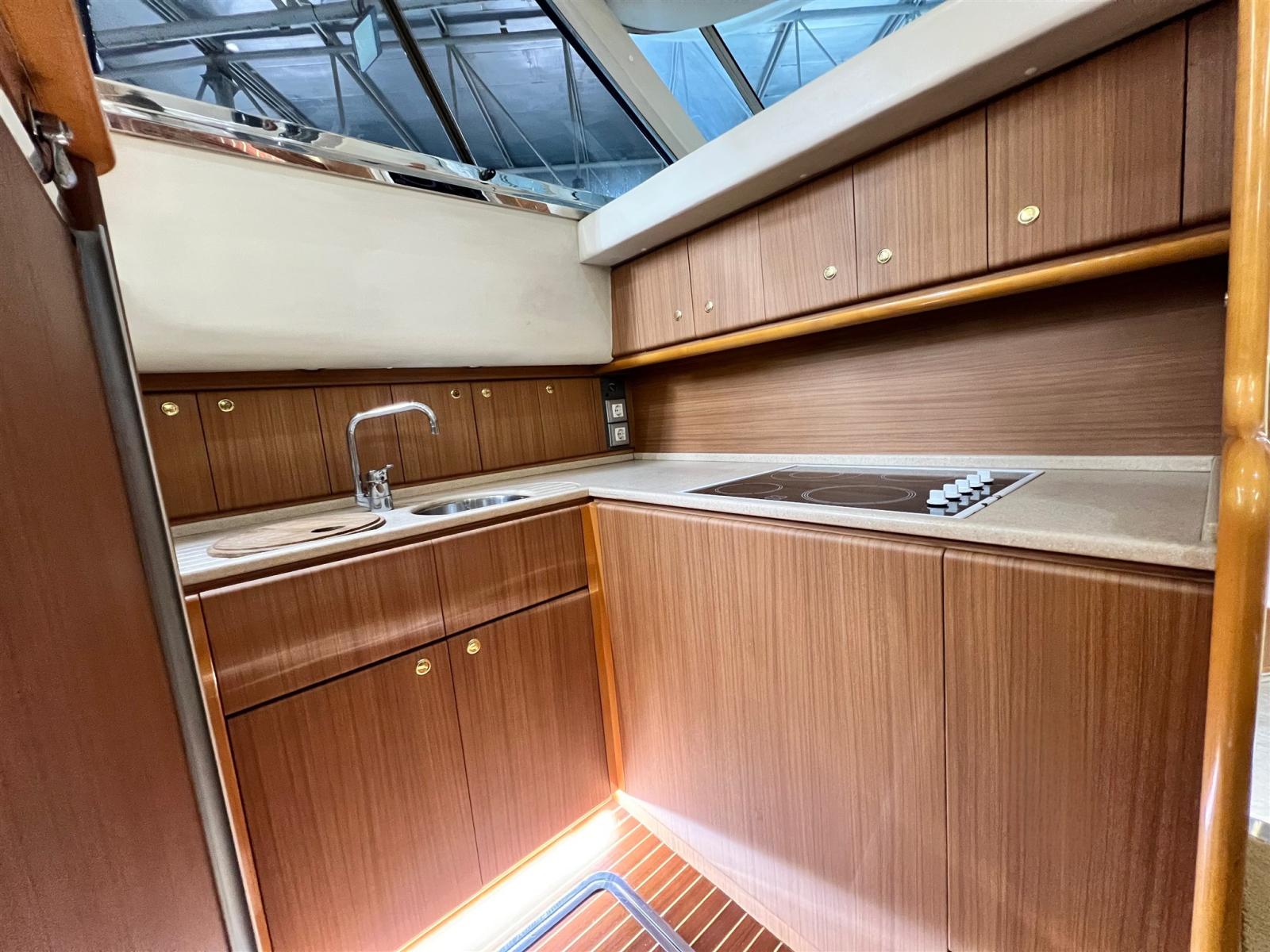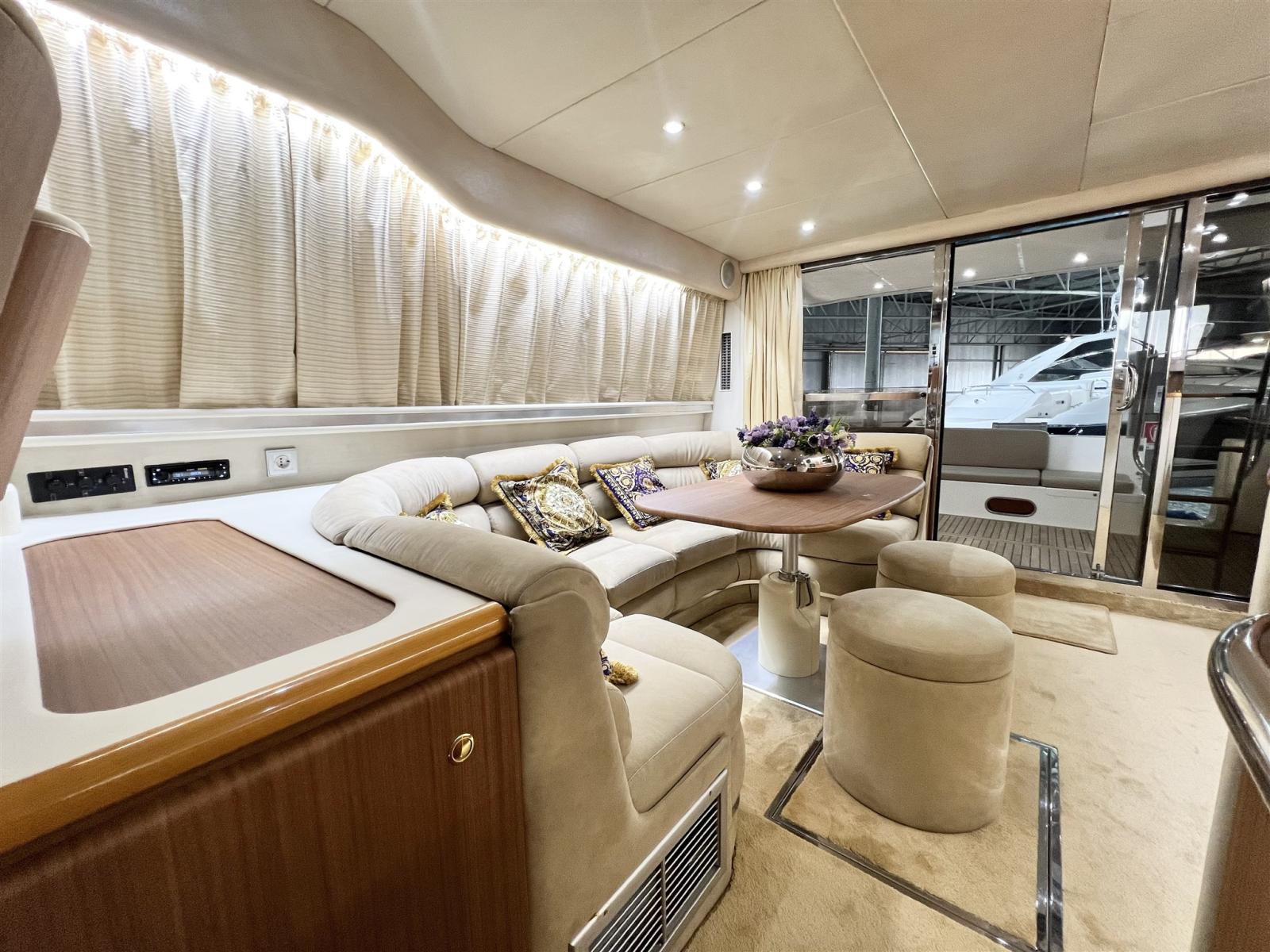 Engine Alarm, Water pressure pump, 6 Batteries, Deck Shower, Directional Spotlight, Electric Flaps, Fire Extinguishing System, Flaps Indicators, Gangway, Platform (con fondo in teack), Automatic Bilge Pump, Manual Bilge Pump, Teak Cockpit, Shorepower connector, Electric Windlass, Tender, Bow Winches.