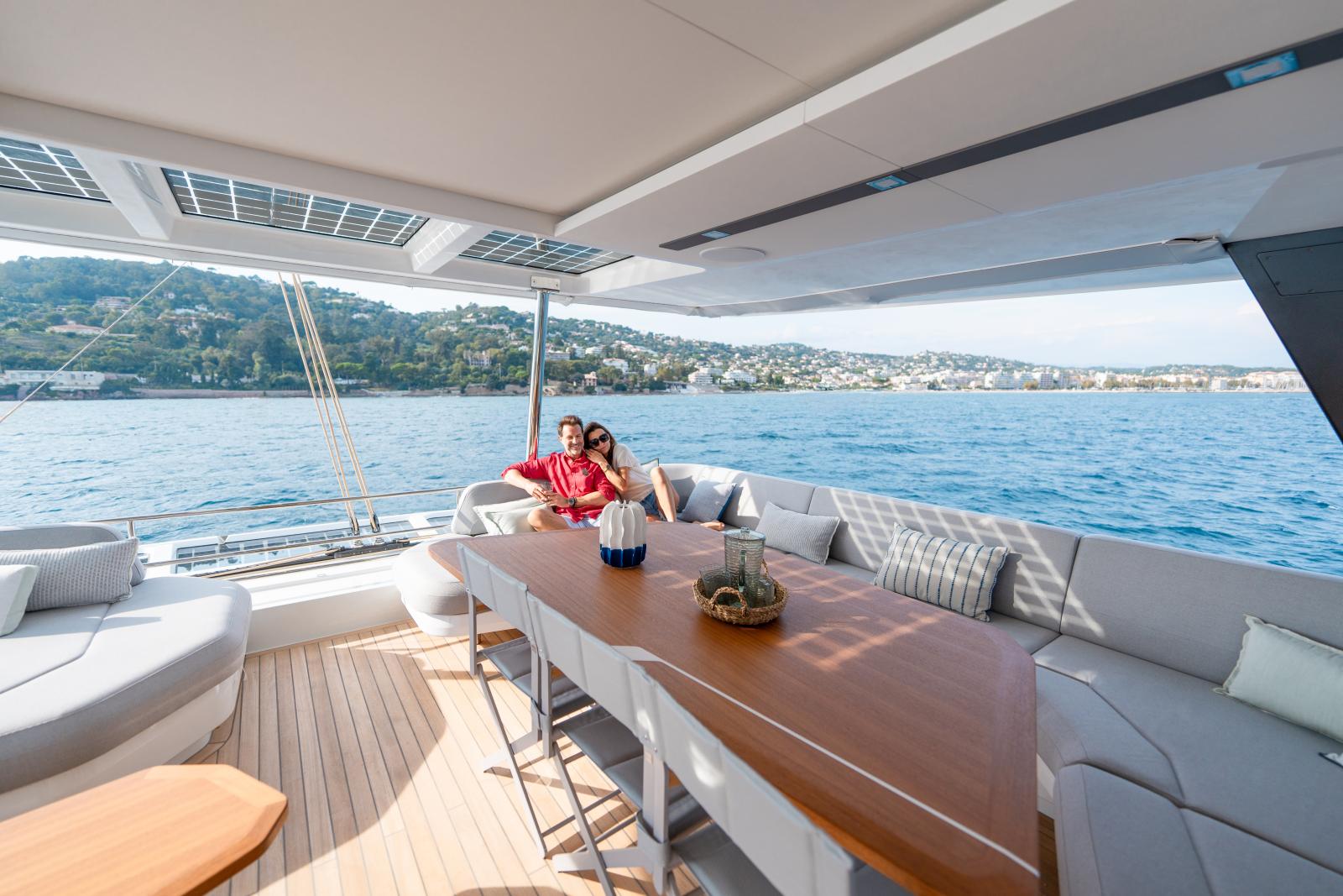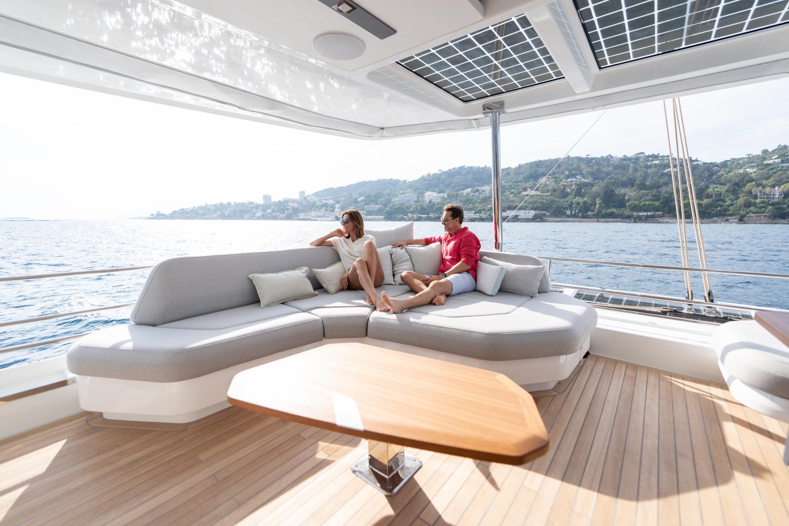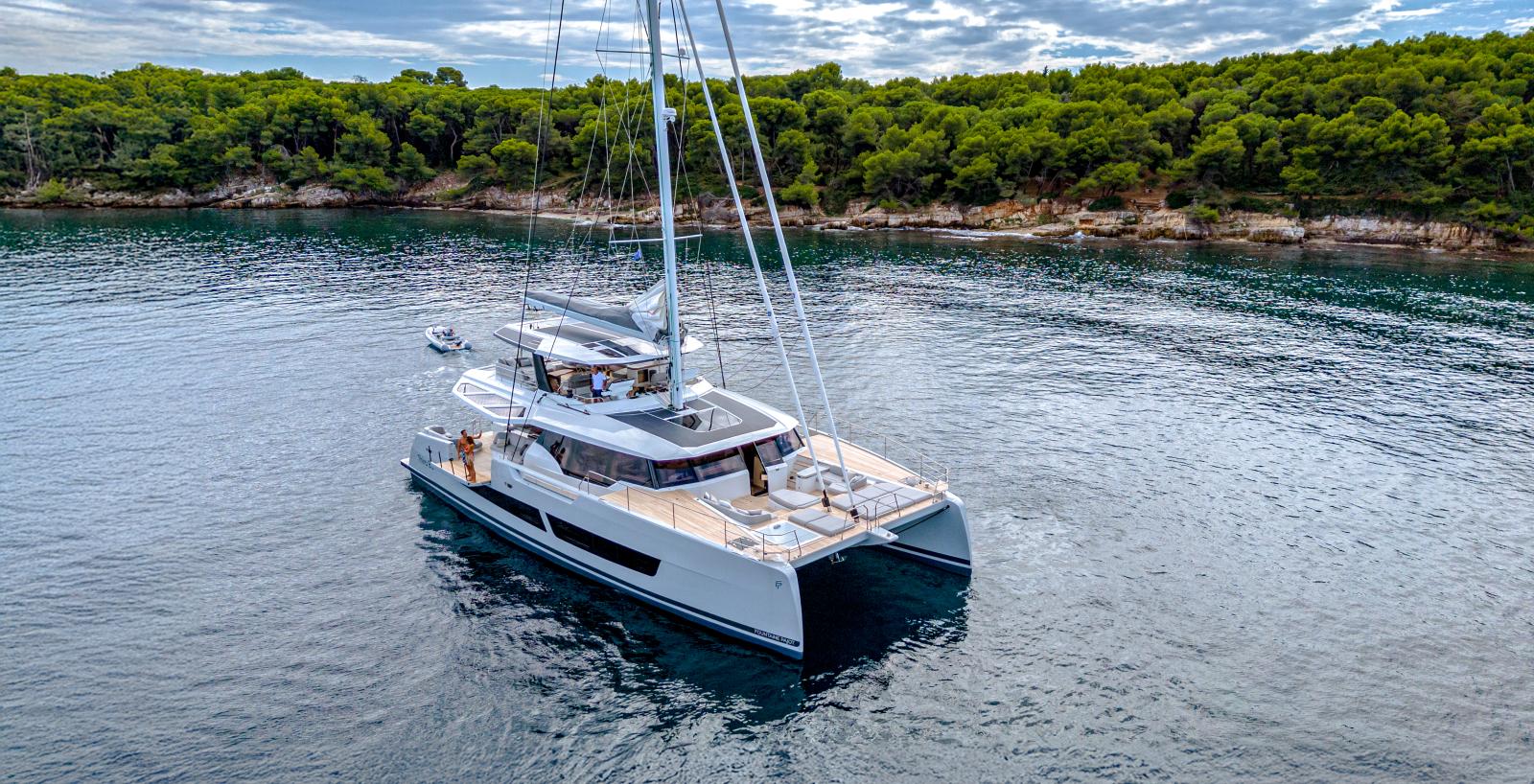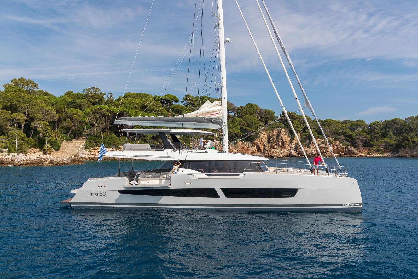 Discover the Fountaine Pajot Thira 80, the flagship of the range, redefining the art of luxury cruising. With its 24-meter length, elegant lines, and clean, refined design, the Thira 80 offers a no-compromise experience: spectacular living spaces, panoramic terraces, generous volumes, and an exceptional level of comfort.