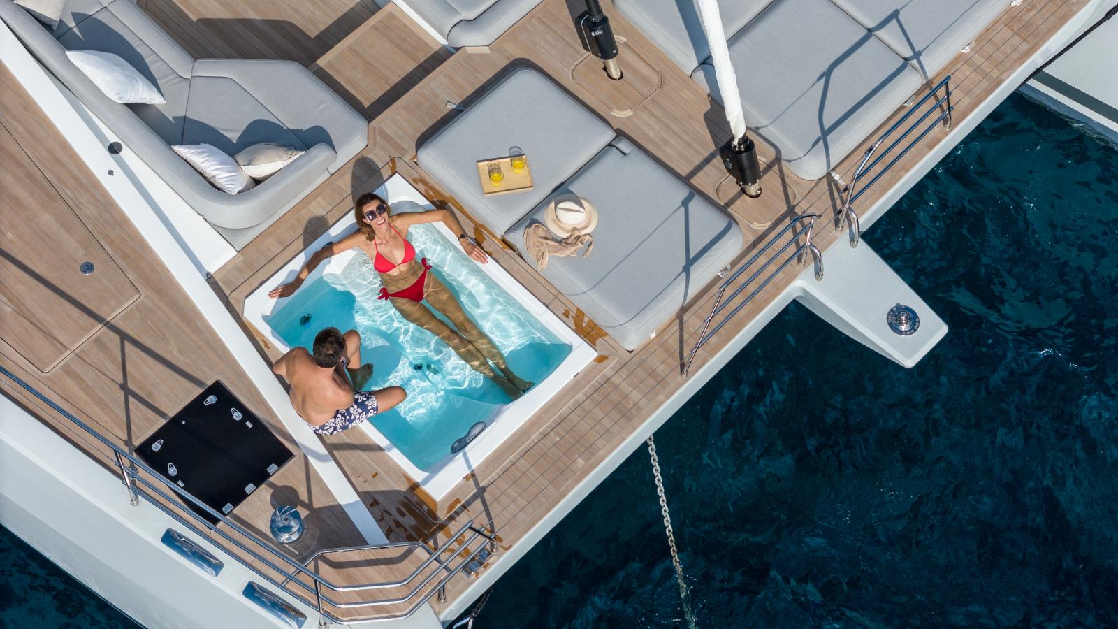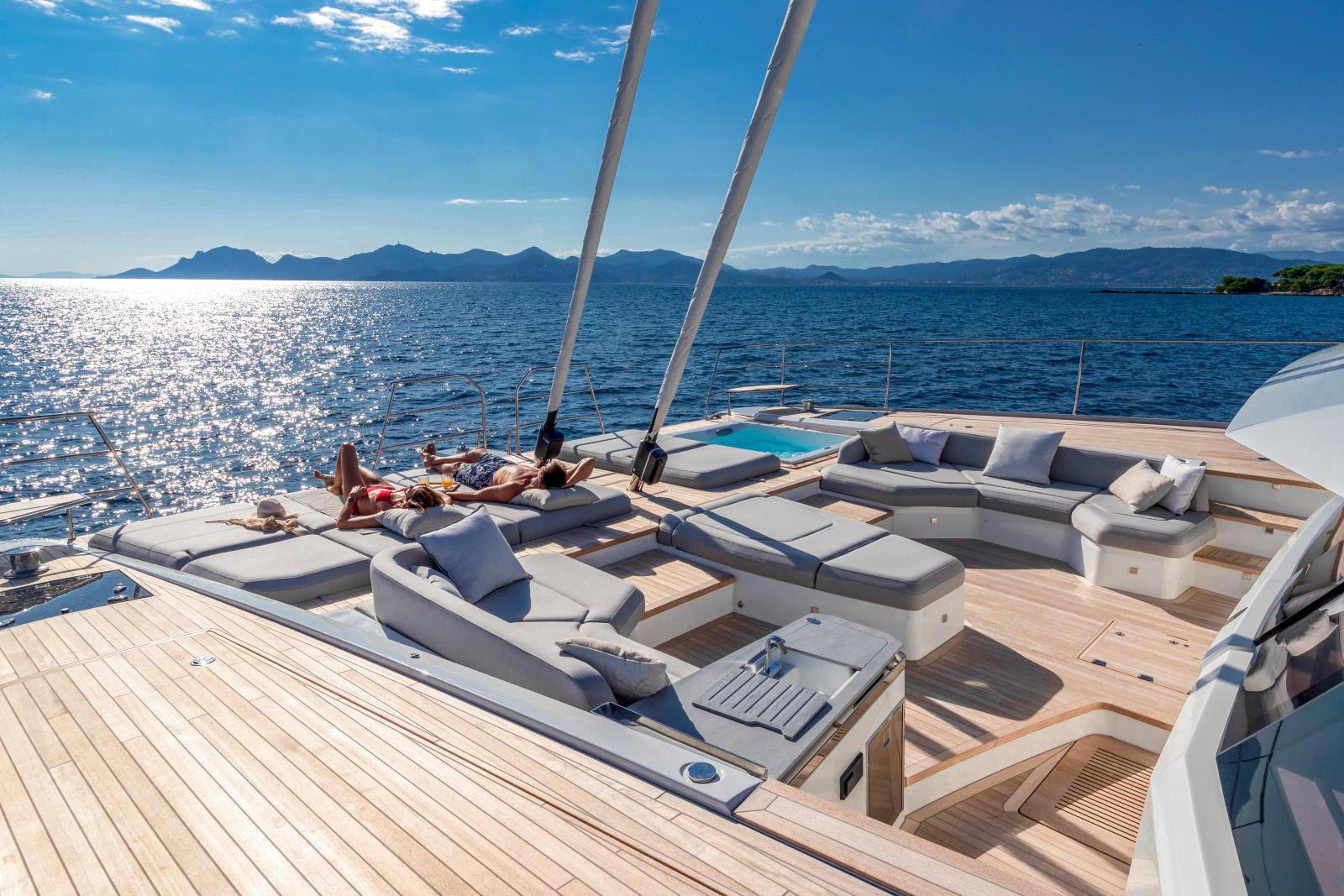 Designed to deliver a truly unique experience, the Thira 80 features spacious private suites, high-end finishes, and seamless circulation between relaxation areas and reception spaces. At sea, its performance ensures smooth sailing, stability, and pure pleasure under sail.
