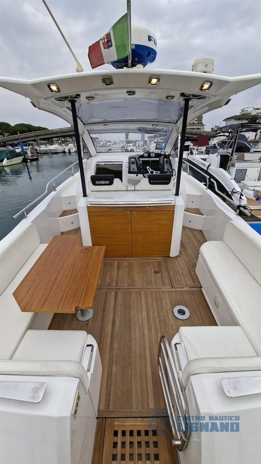 Salpa 30 Gran Turismo (GT) yacht is one of a kind, perfect and ready for the season. This boat with a modern and avant-garde design is a 9.90 meter boat and 10 meters overall and inside it can accommodate up to 4 people. The bathroom is separate. On the outside, the true soul of the 30 GT is revealed, a summer layout but at the same time protected from the wind by a large hard top. The cockpit is wide and wide and the new teak flooring is perfect. The engine is enclosed in a neat and clean engine room and the two Mercruiser 5.0L MPI are ready for the season. Quiet motors in a solid, soundproof construction. The transmission is double propeller stern drive model Bravo III, just serviced and ready. The 30 GT is a small yacht for the family, full of storage space, lockers and lockers. The boat is equipped with a 220V shore system, full navigation instrumentation, courtesy colored lights and underwater lights for the night.