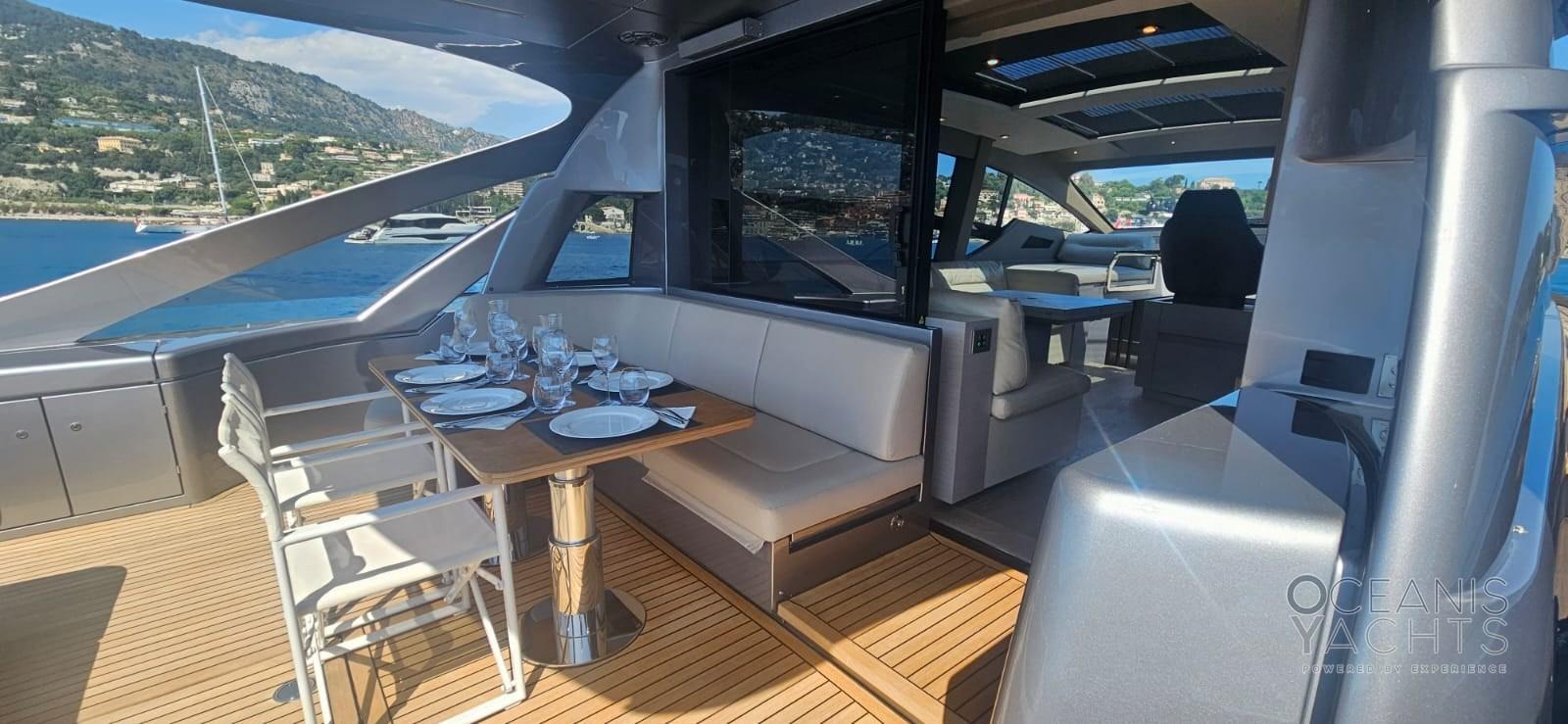 Bilge Alarm, Anchor (Bruce galvanised anchor (50kg)), Water pressure pump, Auto-Trim, Folding cleats, Teak Side Decks, Shore power cable, Guard rail, Deck Shower, Tender Garage, Fire Extinguishing System (Installed in engine room), Courtesy Lights, Underwater lights, Fenders, Gangway (Telescopic hydraulic hideaway gangway (2 remote controls)), Platform (Hydraulic lift for tender launch/recovery), Entry door, Side door, Shorepower connector, Water harbor connector system, swimming ladder, Saddles for tender, Stabilizers (Seakeeper 6 Gyro), cockpit table, Living Room Foldable Table, Tender, Horn.