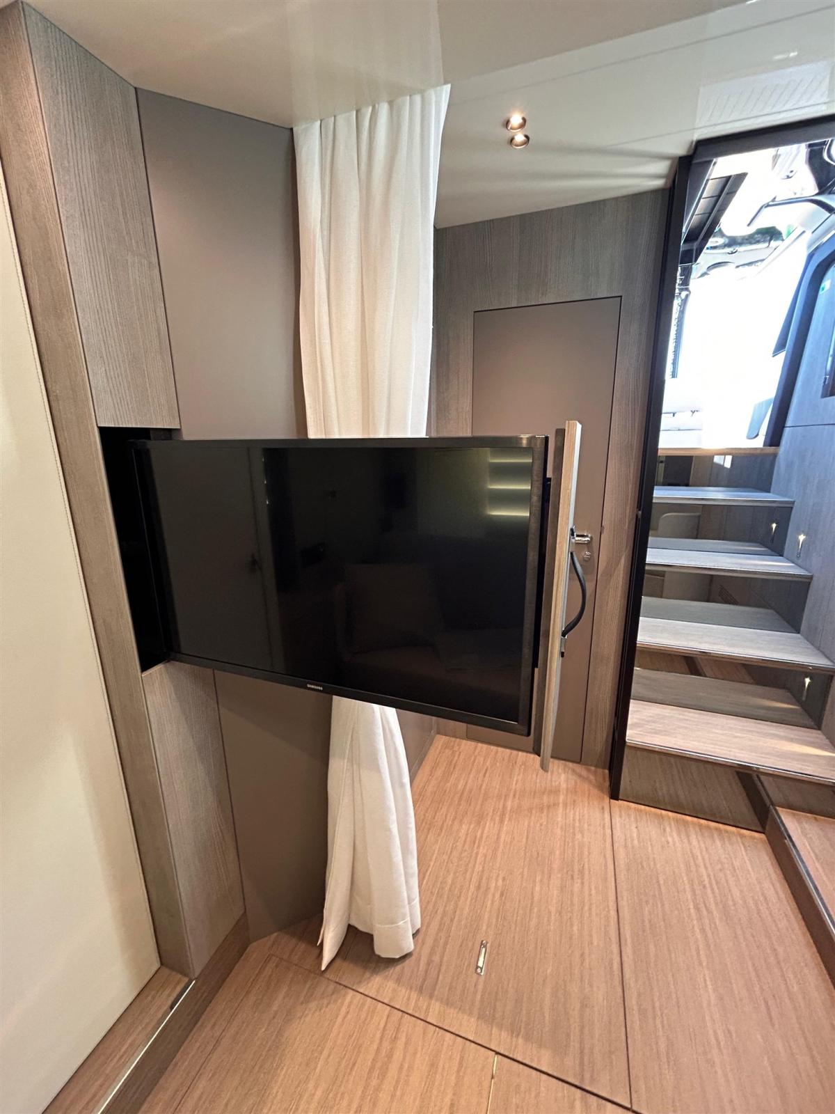 Engine Alarm, Anchor (Ancora digitale Volvo Penta DPS + ASSISTED DOCKING), Water pressure pump, Teak Side Decks, Deck Shower, Bow Thruster (con estintore automatico), Directional Spotlight, Hydraulic Flaps, Gangway (IDRAULICA A 3 STADI L m 3), Platform (a idraulica Sali/scendi 28 cm sotto acqua e portata kg 130), Automatic Bilge Pump, Electric Windlass, swimming ladder, Stabilizers (Correttori d'assetto "Active+ Stabilization, List & Coordinated Turn package" (Dynamic Plus Package)), cockpit table, Bow Winches (Campana di tonneggio a prua, a scomparsa).