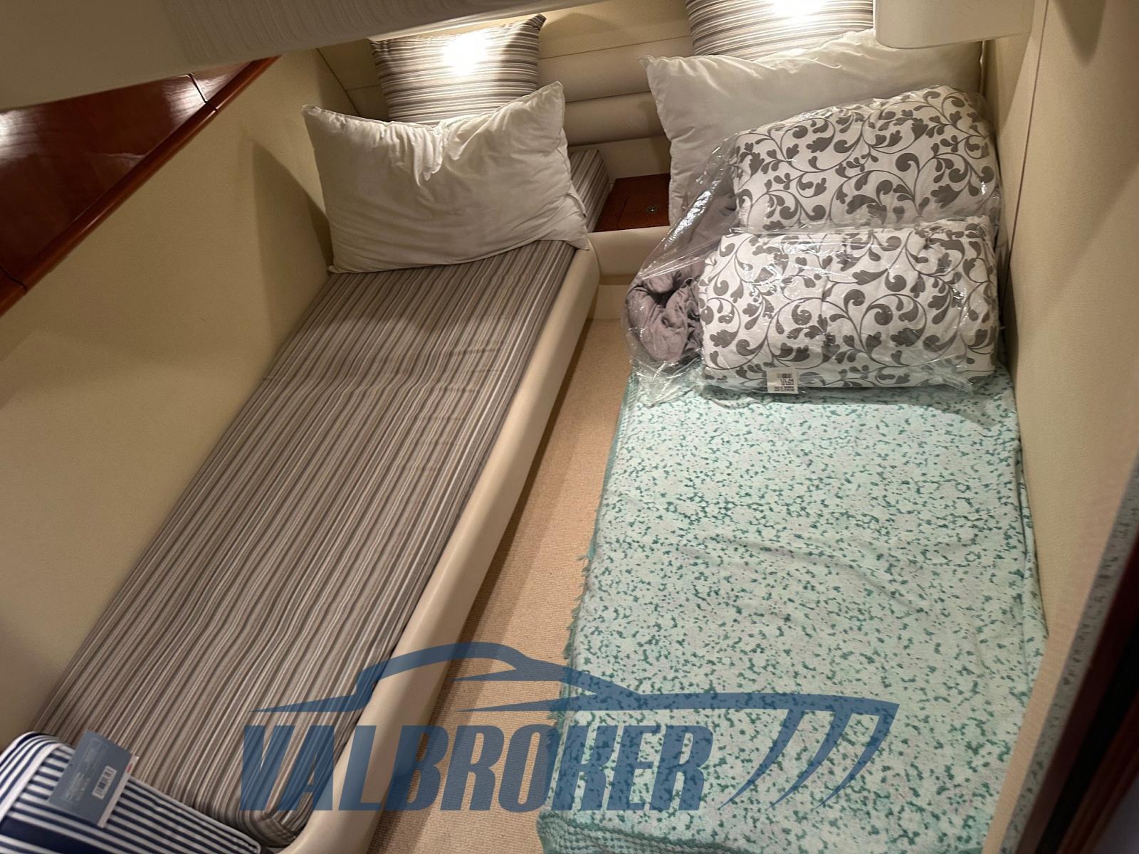 Master cabin in the bow with a large double island bed and private en-suite bathroom equipped with shower, guest cabin with two single or double beds and direct access to the second bathroom.
