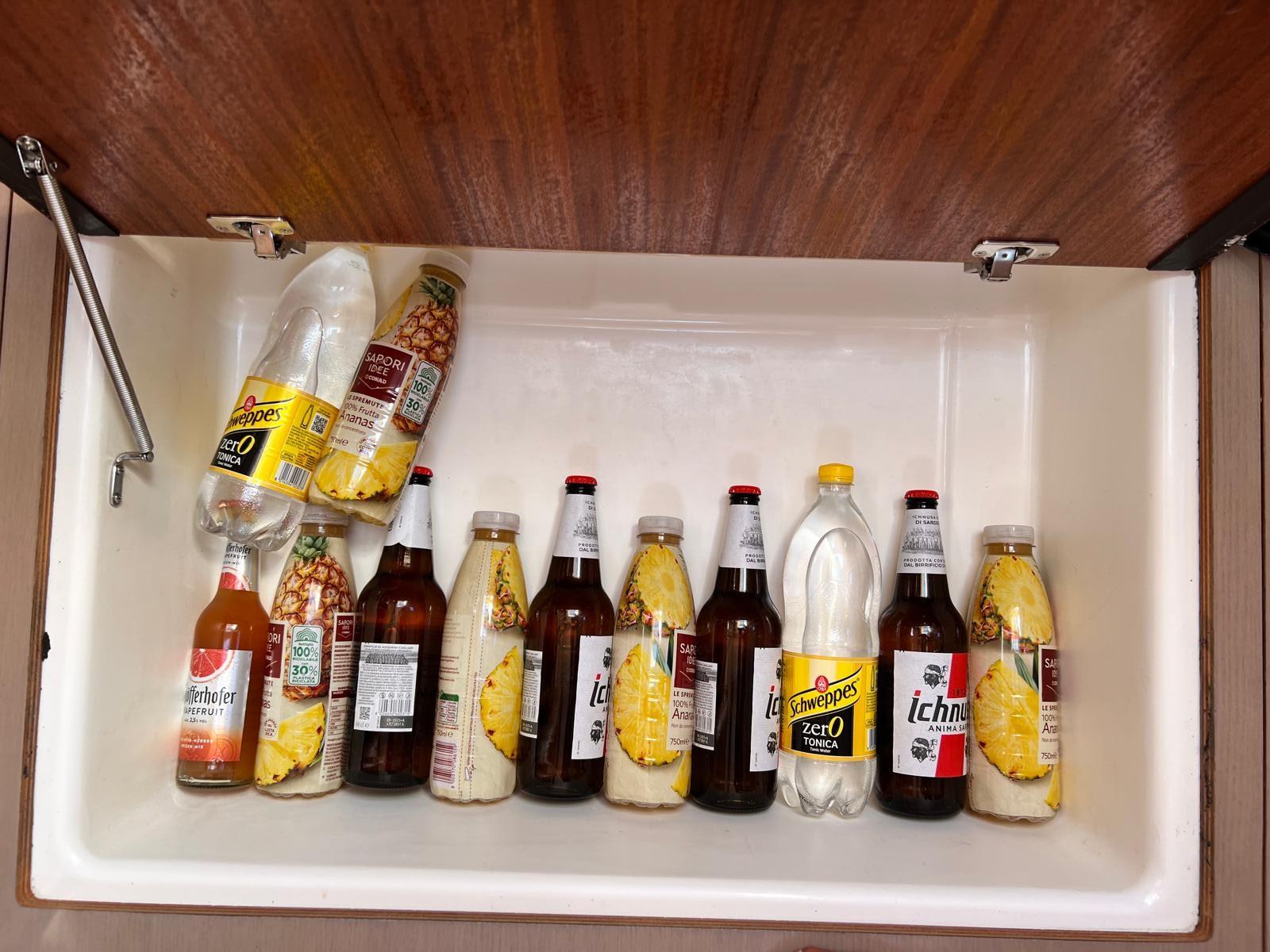 Galley, Burner (2 fuochi a gas), Oven (basculante), Refrigerator (a pozzetto Isotherm 250lt).