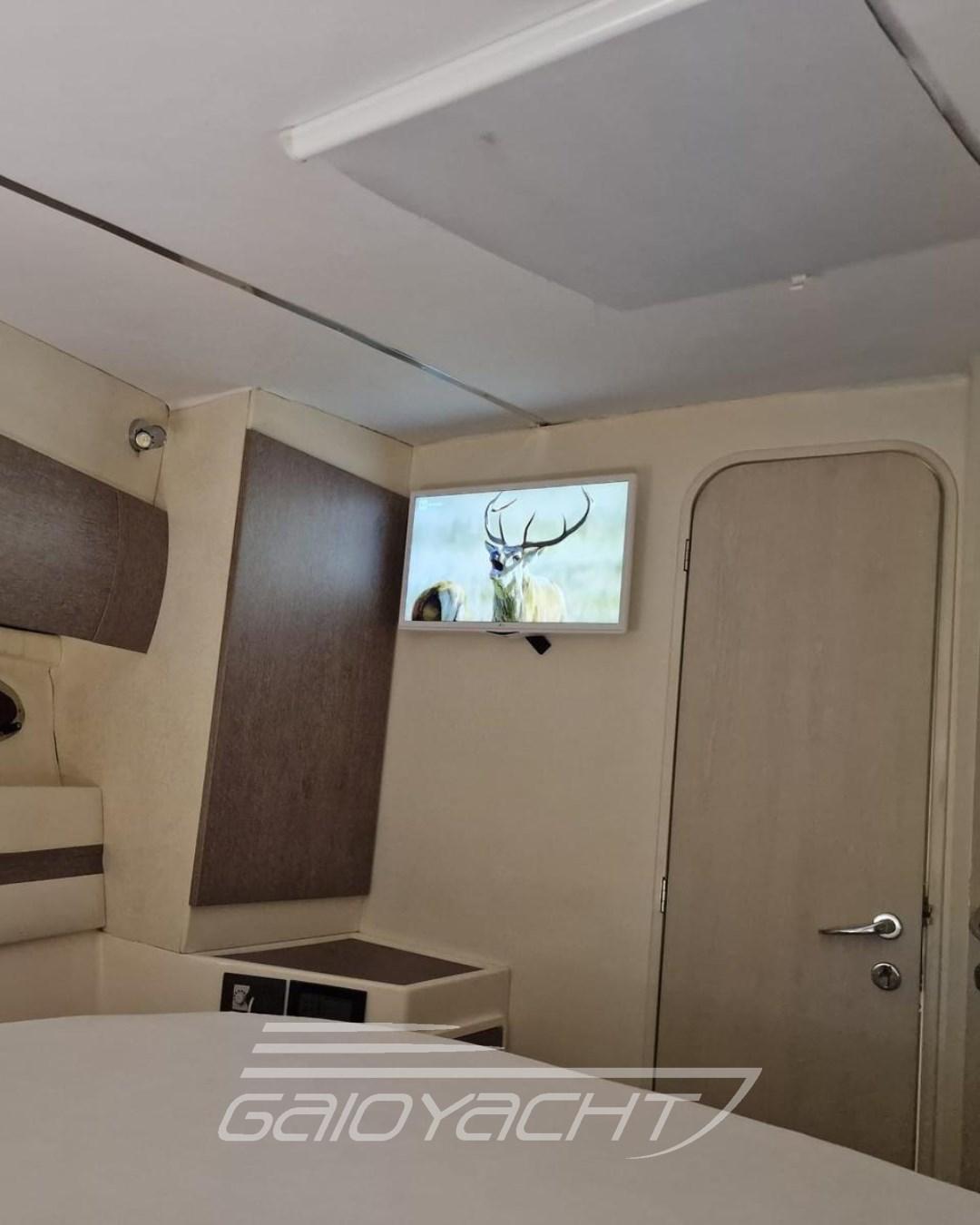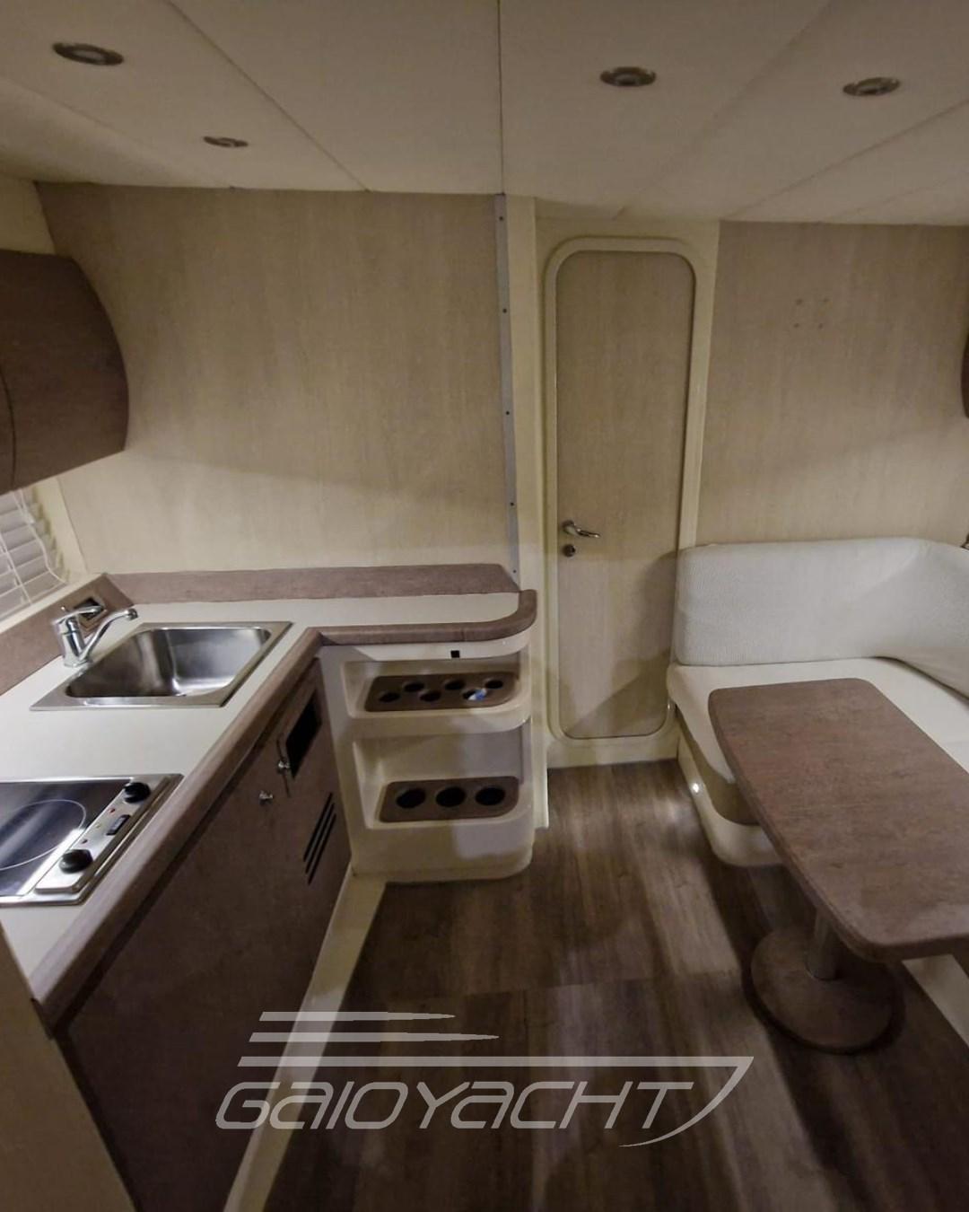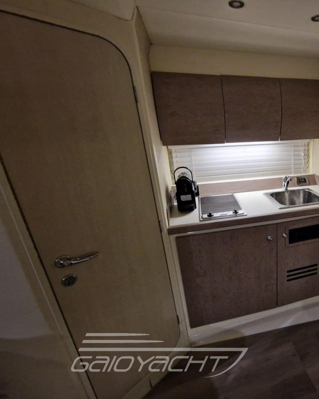Flaps; Electric handcuffs; Complete Volvo Penta on-board instrumentation; External induction kitchenette (cockpit) with two burners and convenient sink; External kitchen cabinet (cockpit); Double fridge; Induction dinette kitchen plate with two burners; TV system in the cockpit and with TV in the owner's room; Hi-Fi radio.