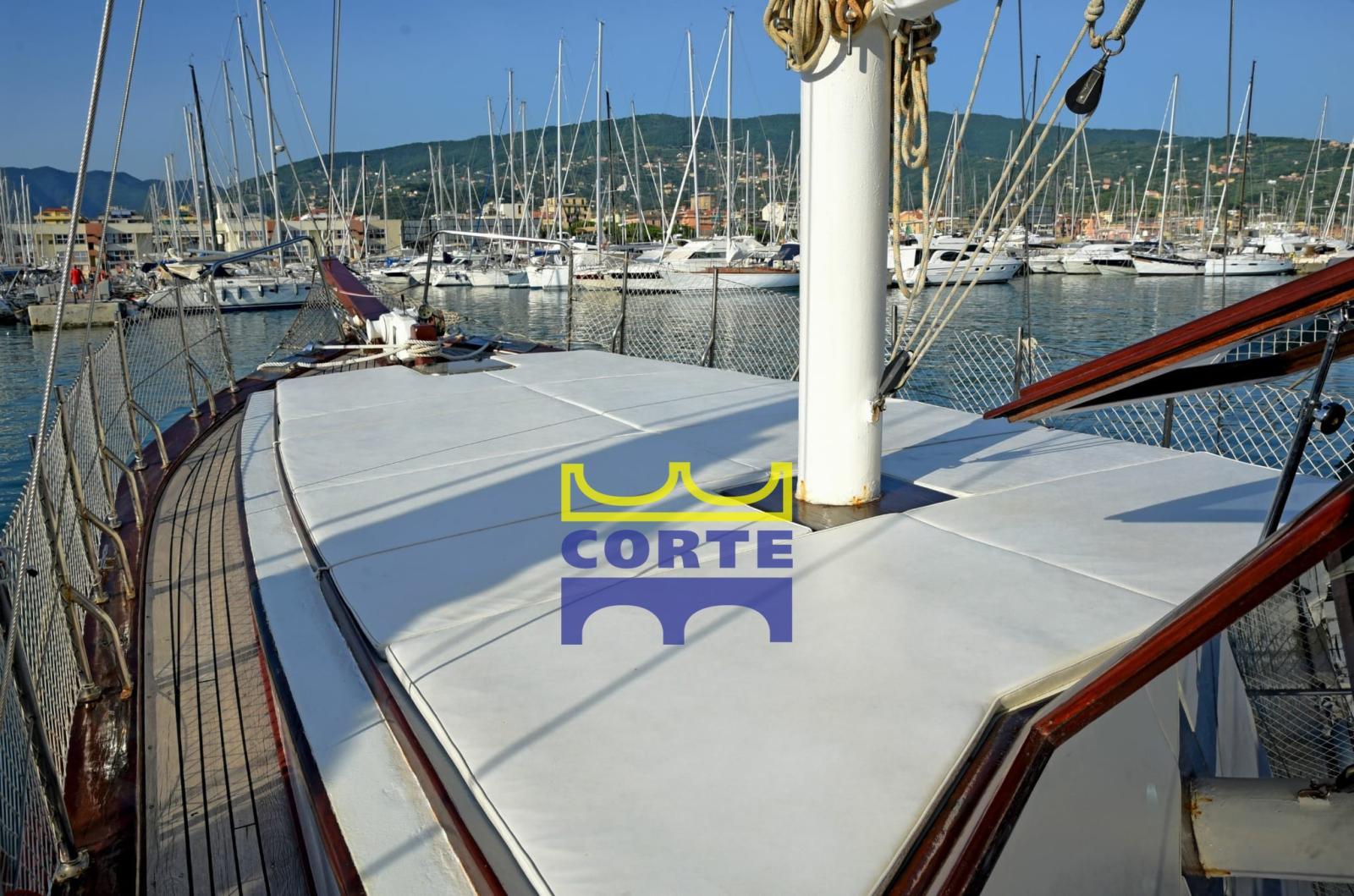 Alternator, Water pressure pump, Teak Side Decks, Deck Shower, Directional Spotlight, Fire Extinguishing System, Gangway, Automatic Bilge Pump, Manual Bilge Pump, Teak deck, Entry door, Teak Cockpit, Shorepower connector, Electric Windlass, swimming ladder, cockpit table (ampio), Tender, Horn, Bow Winches.
