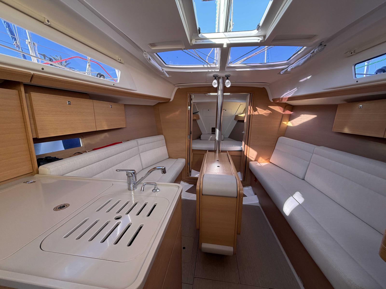 Inside, the light is remarkable, the overall condition exceptional, and the full set of sails — square-top mainsail, spinnaker, genoa — provides you with everything you need to sail with ease.