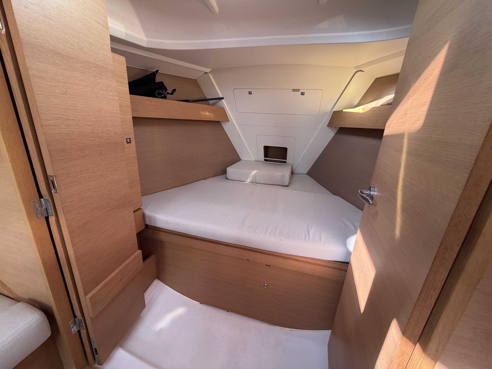 On board, you’ll enjoy a surprisingly spacious interior, thoughtfully laid out – almost surprising for a boat in this class. We highlight its robust construction and modern hull, which ensure stability and a smooth ride at sea.