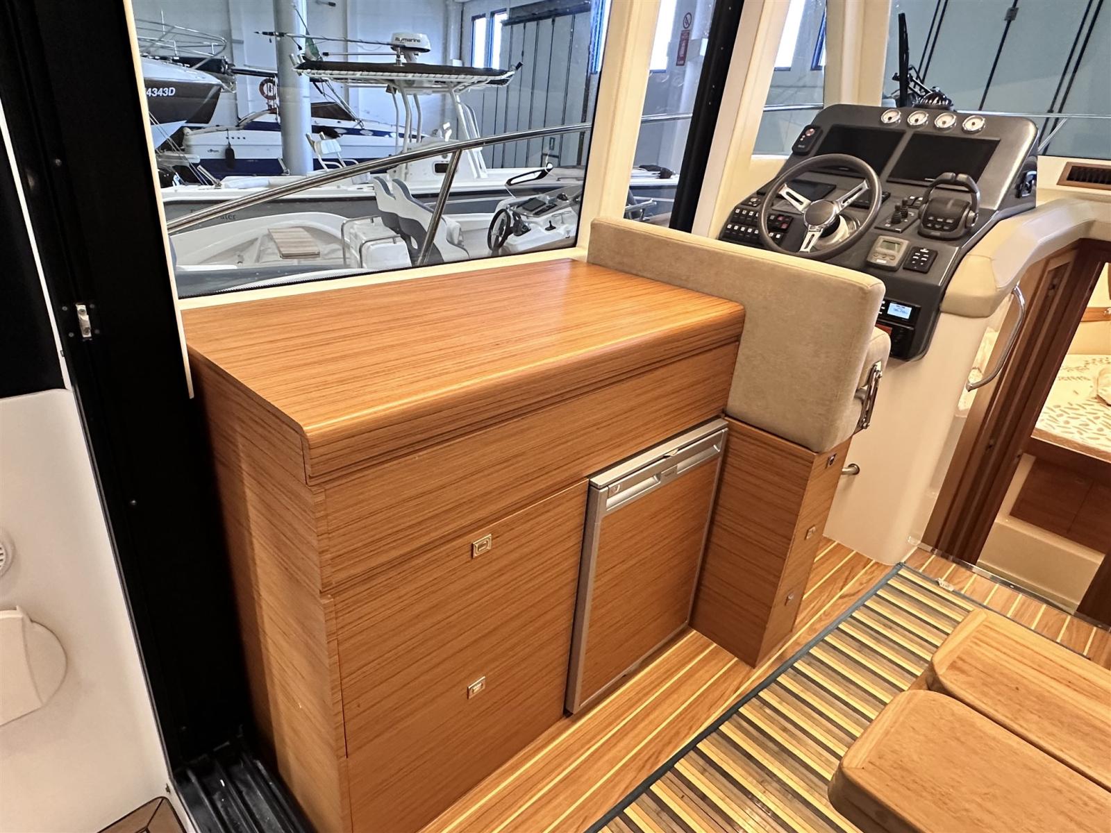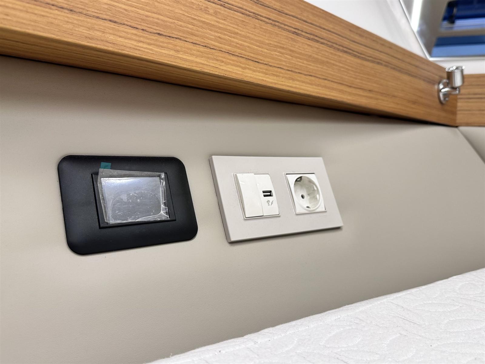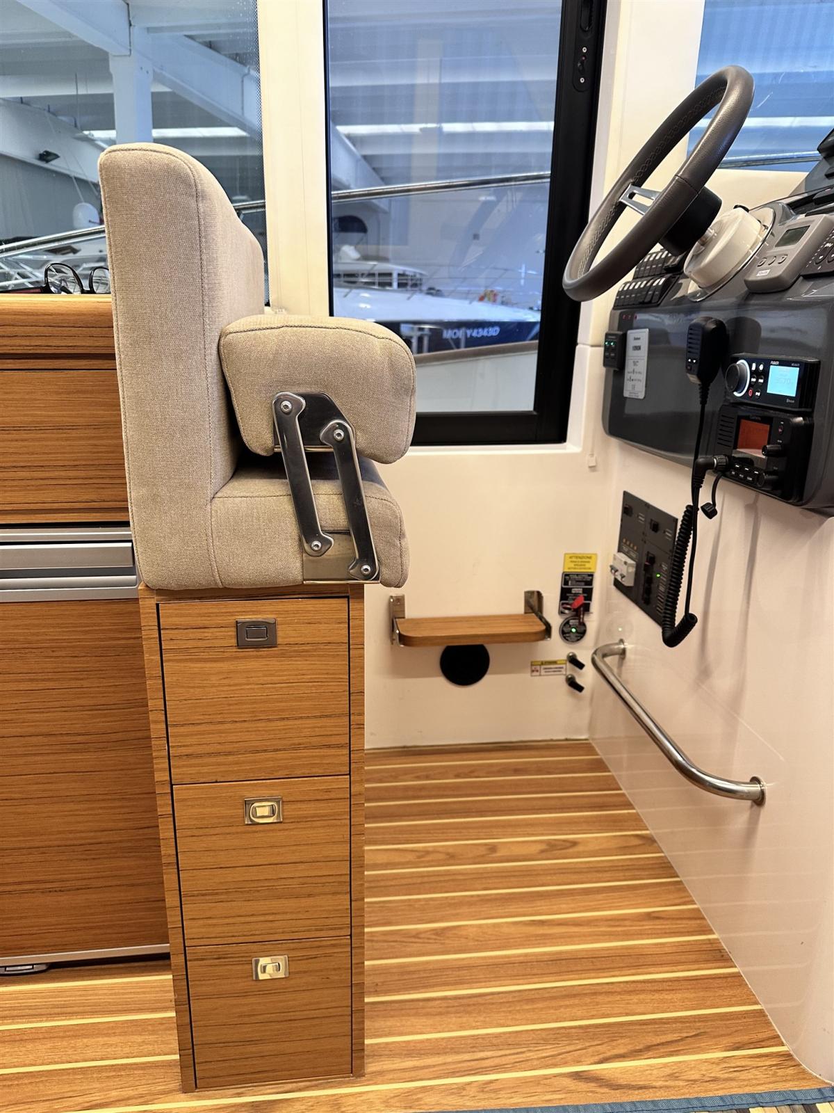 Engine Alarm, Water pressure pump, Special Colour (blu), Deck Shower, Directional Spotlight, Electric Flaps, Hard top, Fire Extinguishing System, Flaps Indicators, Platform, Automatic Bilge Pump, Manual Bilge Pump, Side door, Teak Cockpit, Shorepower connector, Voltage Rectifier, Electric Windlass, swimming ladder, Horn.